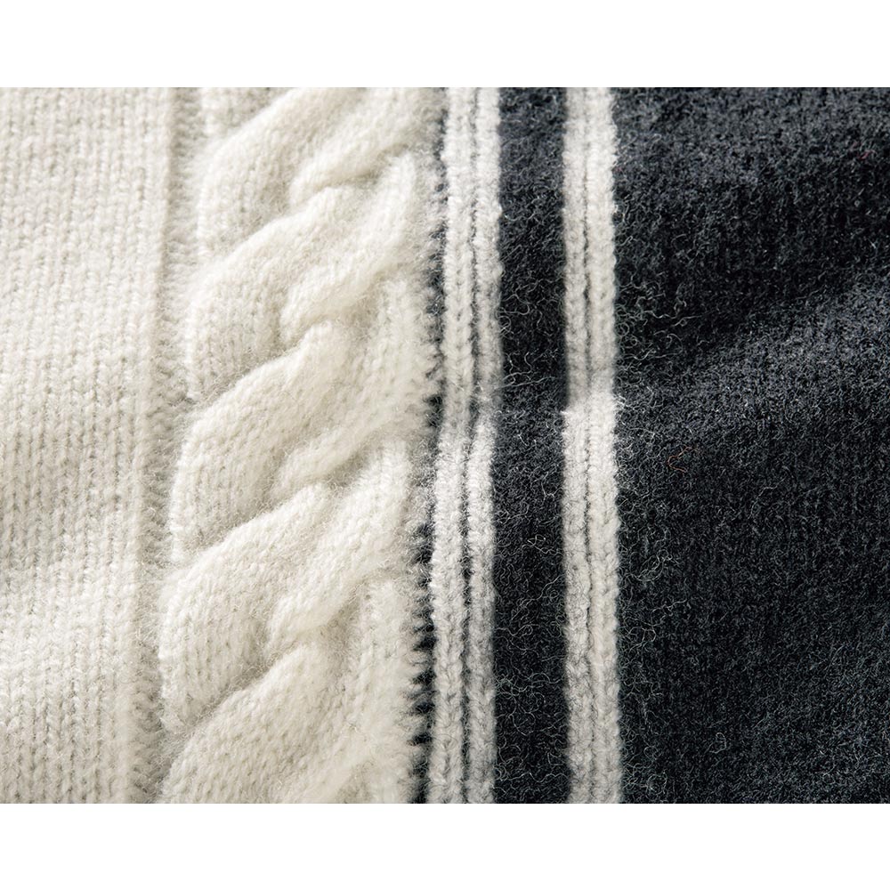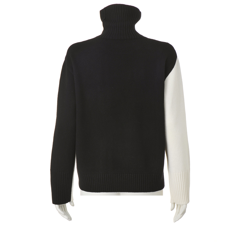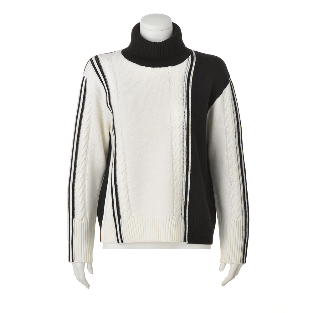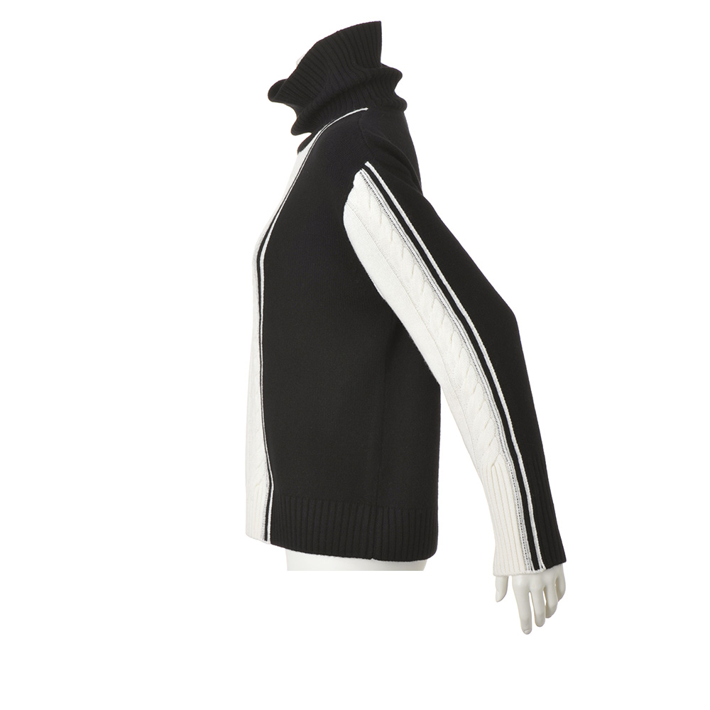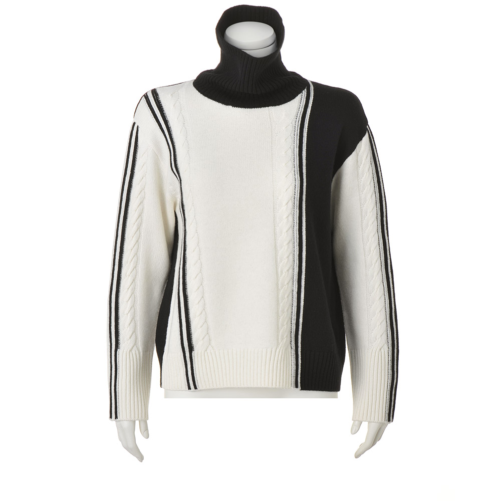 カジュアルこそ、品良く、軽やかに!軽く暖かな冬素材に女性らしいディテールを映したアイテムで、大人の毎日をさらに美しいものに。色と編み地の対比がモードな存在感モノトーン配色でコーディネートに取り入れやすいのに印象は個性的、カジュアルからきれいめまで着こなせるニットプルオーバーができました。触れるとふんわり柔らかな風合いながら、しっかりと厚みがあって暖か。ウール本来の膨らみ感と軽さが活きるよう、細く繊細なウール原料のセミ梳毛と紡毛を撚糸して編み上げています。フロントとバックスタイルでがらりと変えた配色バランスも新鮮。前身頃と両袖の前面に効かせたケーブル柄と配色ダブルラインのアクセントが縦ラインを演出。スラリと見える効果もプラスして。≫ POINT天竺編みをベースに、ケーブル編みを前身頃に2本、袖に各1本。襟・袖口・裾の太畝のリブも軽快なアクセント。