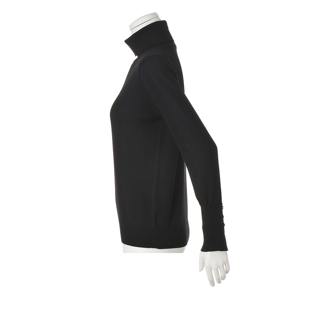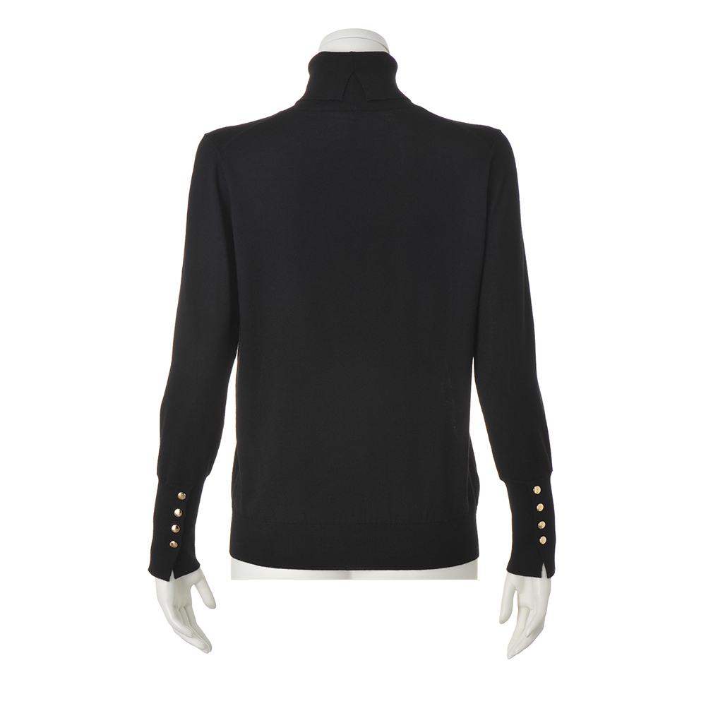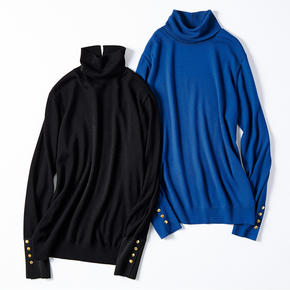 機能的で着心地よいアイデア。寒い季節の外出が待ち遠しくなる肌にも優しい上質素材――。ワードローブの可能性が広がるアイテムをご紹介します。信頼と実績を誇る上質ウールの魅力を存分に上質なメリノウールから、長繊維のみを選別した梳毛糸でハイゲージの天竺編みに。糸の表面にバソラン加工を施しているため、上品な艶と滑らかさが生まれ、適度な伸縮性が心地よいプルオーバーができました。暖かなタートルネックは、リラクシーなフィット感を求め、後ろ襟にスリットを入れた進化版。また、袖口は長めのリブ編みにし、カフス風の金ボタンやスリット開きのさりげないアクセントが着映え効果を発揮。一着で、ブルゾンなどのインナーに、とさまざまな冬スタイルに活躍するプルオーバーは、装いにさりげない品を添える一着です。