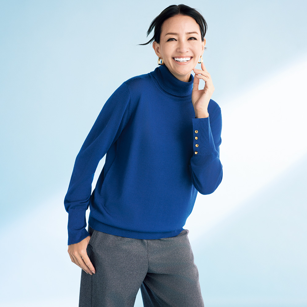 (ア)ロイヤルブルー コーディネート例 /笑顔に気品を添えるシルキーなブルーニット