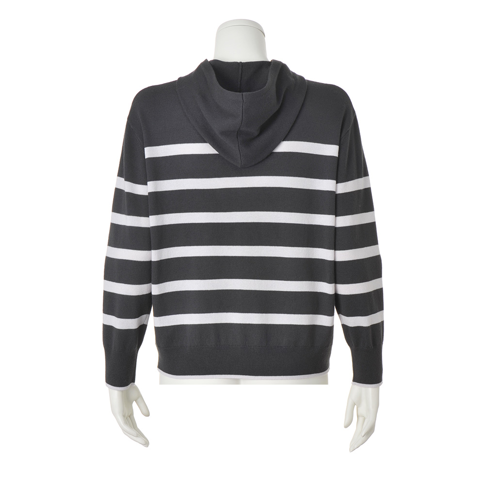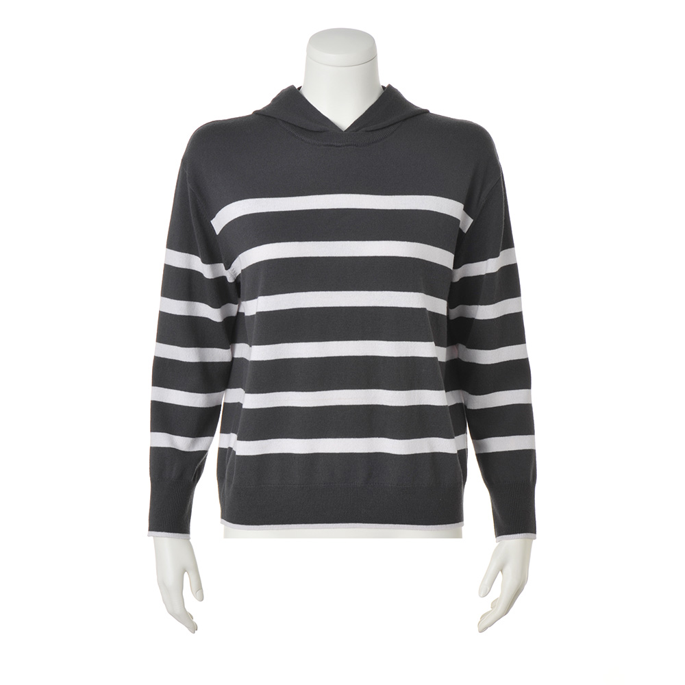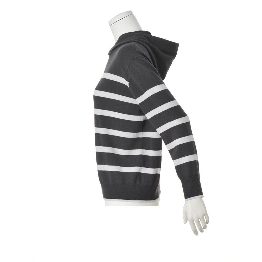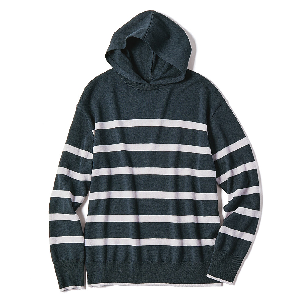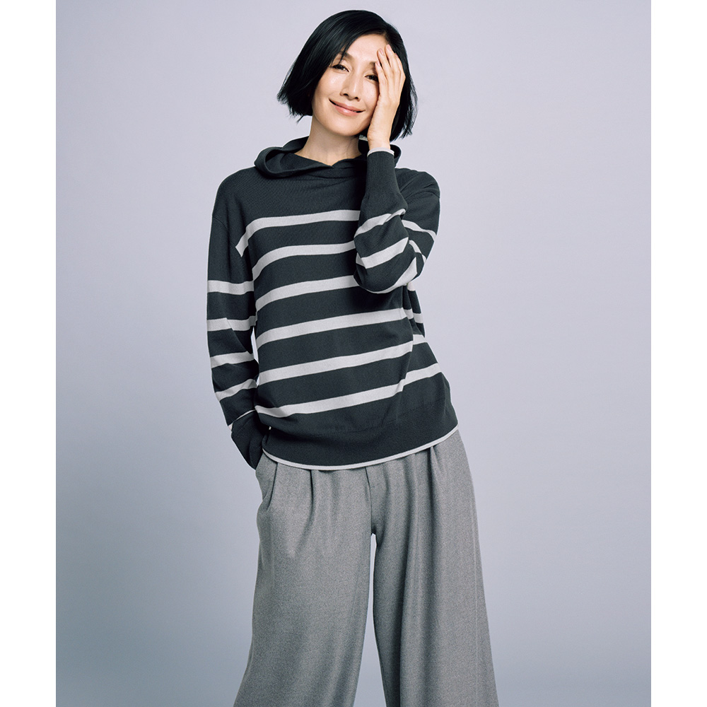冬の旅に寄り添うスタイル。年末年始の帰省や温泉、ウィンタースポーツなど、冬の予定が気になる頃。印象的な素材感、色・柄の服を選んで、イベントをより輝かせて!私らしく過ごすためにボーダーニットは外せない。リラックス感のあるゆったりとしたニットプルオーバーを、チャコールグレー×オフグレーの落ち着いた配色のパネルボーダーで大人カジュアルに仕上げました。袖口と裾のやや長めのリブや先端に効かせた配色もスッキリとした印象。一見シンプルなニットに見えて実はフーデッドデザインで、リブ使いのクルーネックに天竺編みのフードが重ね着風にあしらわれ、さりげない遊び心が感じられます。ウール本来の風合いが生きるセミ梳毛と紡毛を撚り合わせた糸を、ハイゲージ天竺でしなやかに編み立てた、膨らみ感や暖かさ、軽さも魅力。≫ POINT首元とフードのレイヤード風デザインがさりげない拘り。