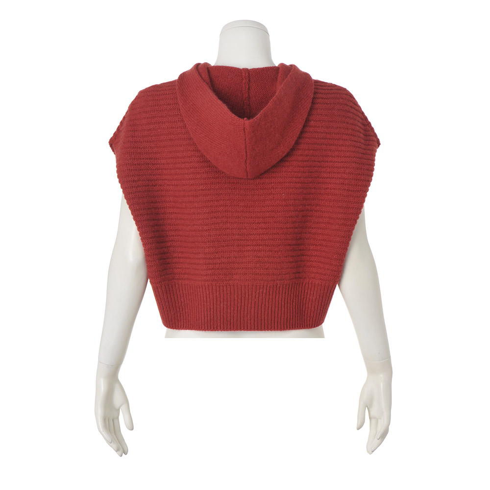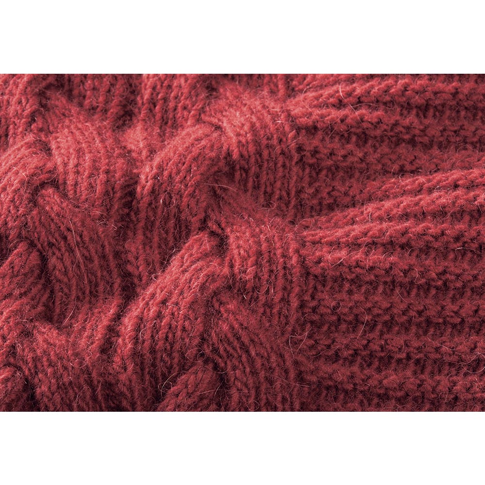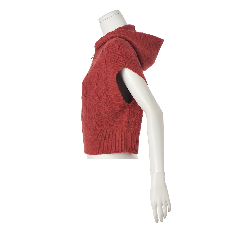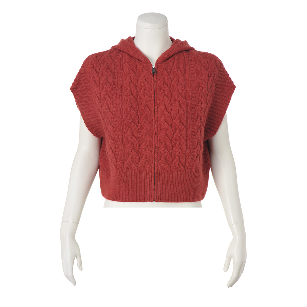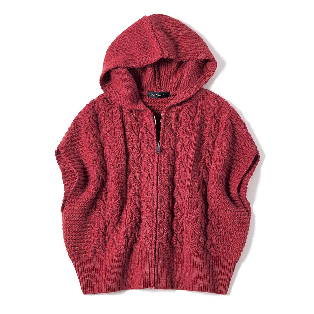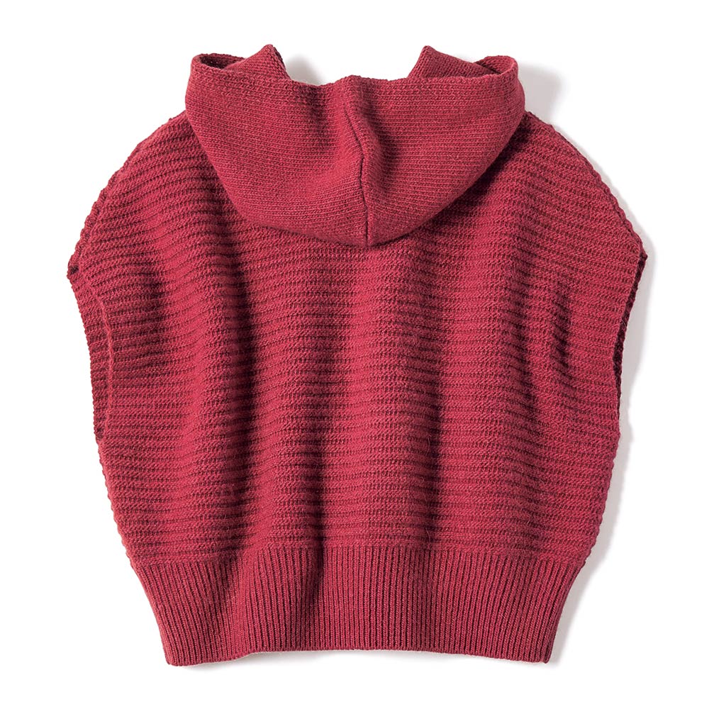 冬の旅に寄り添うスタイル。年末年始の帰省や温泉、ウィンタースポーツなど、冬の予定が気になる頃。印象的な素材感の服を選んで、イベントをより輝かせて!コンパクトなニットジレならトレンドの赤も取り入れやすい。温度調節しやすく一着あるとなにかと便利なニットジレを、フードやフロントファスナーが若々しいパーカタイプで。色は顔映りが良く、コーディネートのアクセント効果絶大なレッド。アルパカ・ウール・リネン糸の各素材の染まり具合から生まれるメランジ感、ケーブル編みとガーター編みの立体感の相乗効果で、奥行きのある豊かな表情に仕上がりました。広い身幅は身体が入ると肩が落ち、二の腕をカバー。裾を長めのリブでフィットさせた丸みのあるフォルム、脚長バランスを演出するショート丈も旬のこなれ感を誘います。≫ POINTフロントは編み柄の立体感でチャーミングに、後ろはガーター編みですっきりと。