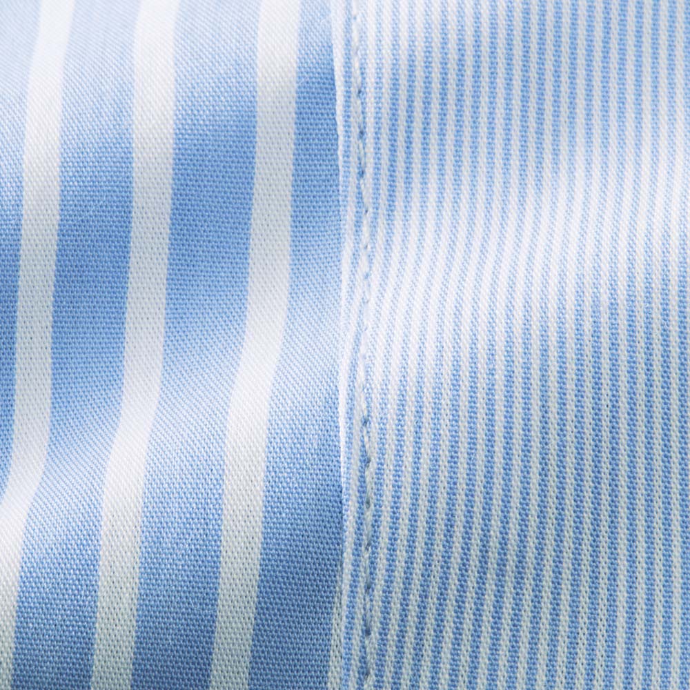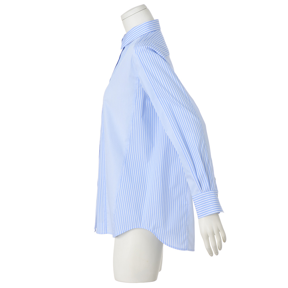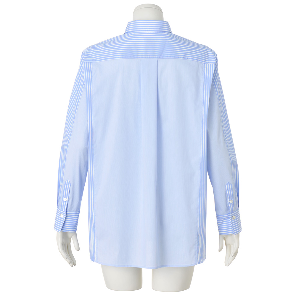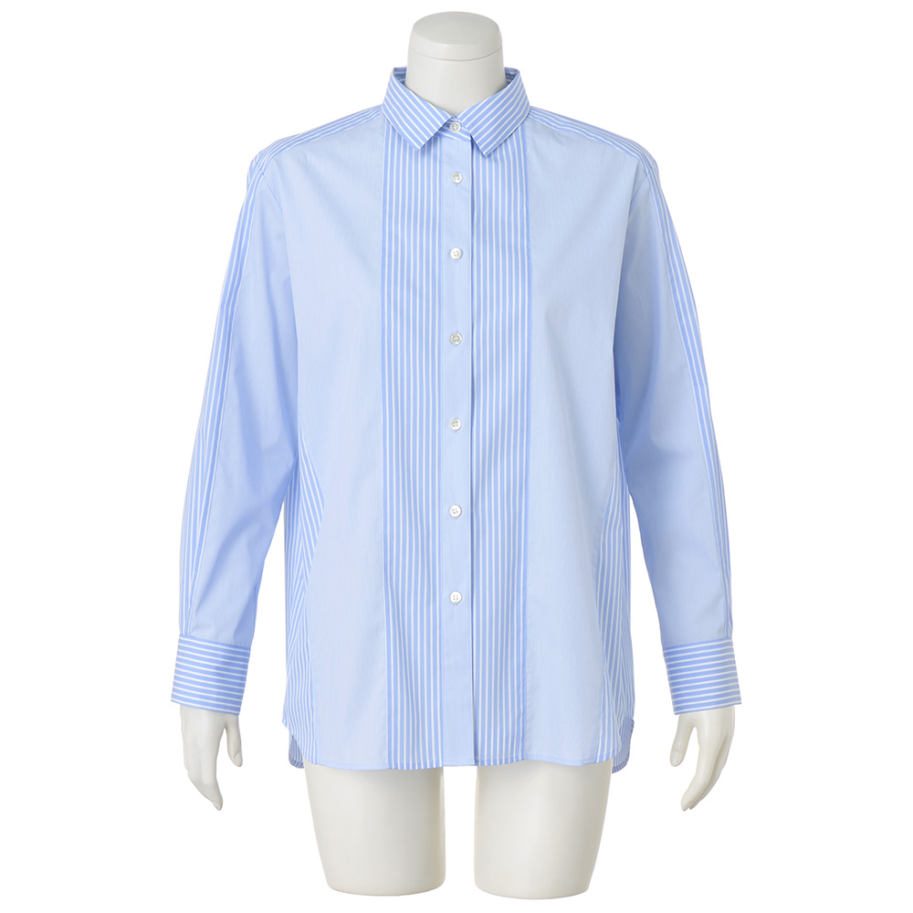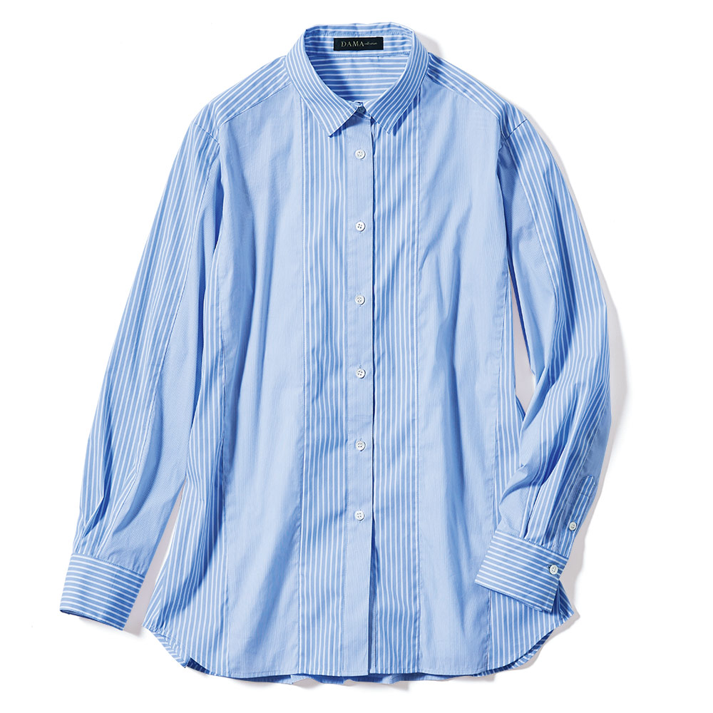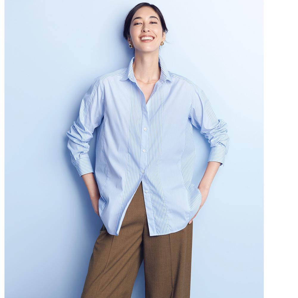 ブルーのシャツで澄んだ知性を添えて。太幅と細幅、2種類のストライプをプレイフルに切り替えたシャツは、クリアな発色としなやかな風合いを備えた、ポルトガル「SOMELOS」社のコットン混ポプリン素材。デザインは、上質さを満喫できる程良いゆとりを持たせたやや長め丈に、大人をきれいに見せる工夫を凝らして。肩ヨークと袖山には繋がるように太幅ストライプを配し、さらに両脇線は前振りに切り替えることで、視覚効果でよりシャープに。≫ POINT洒脱なカーブヘムをヒップが隠れる丈に設定。ボトムイン・アウト、羽織りもの…と様々に着こなせます。