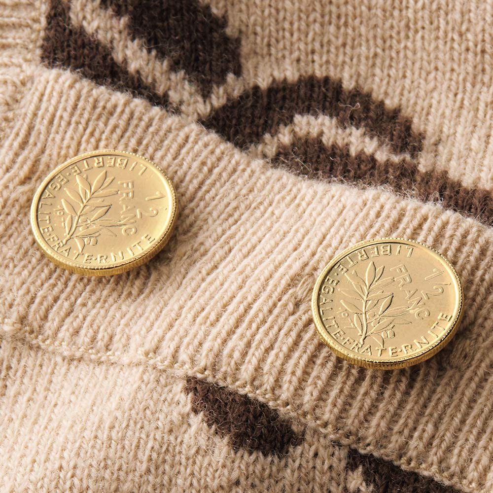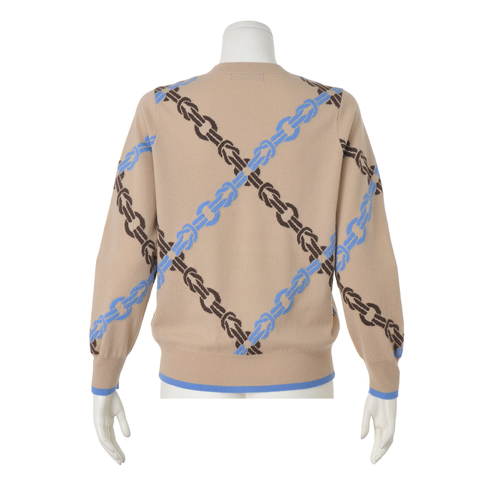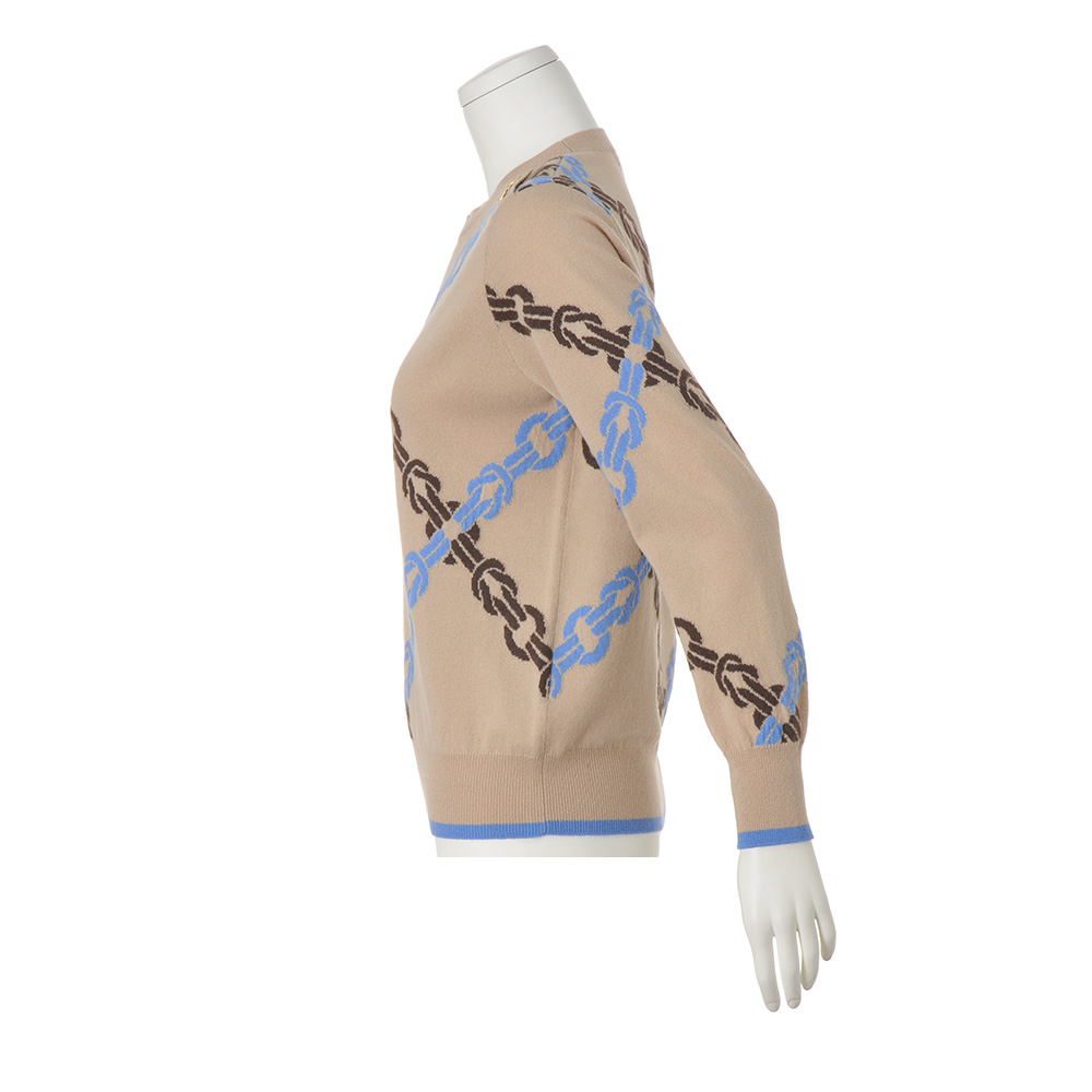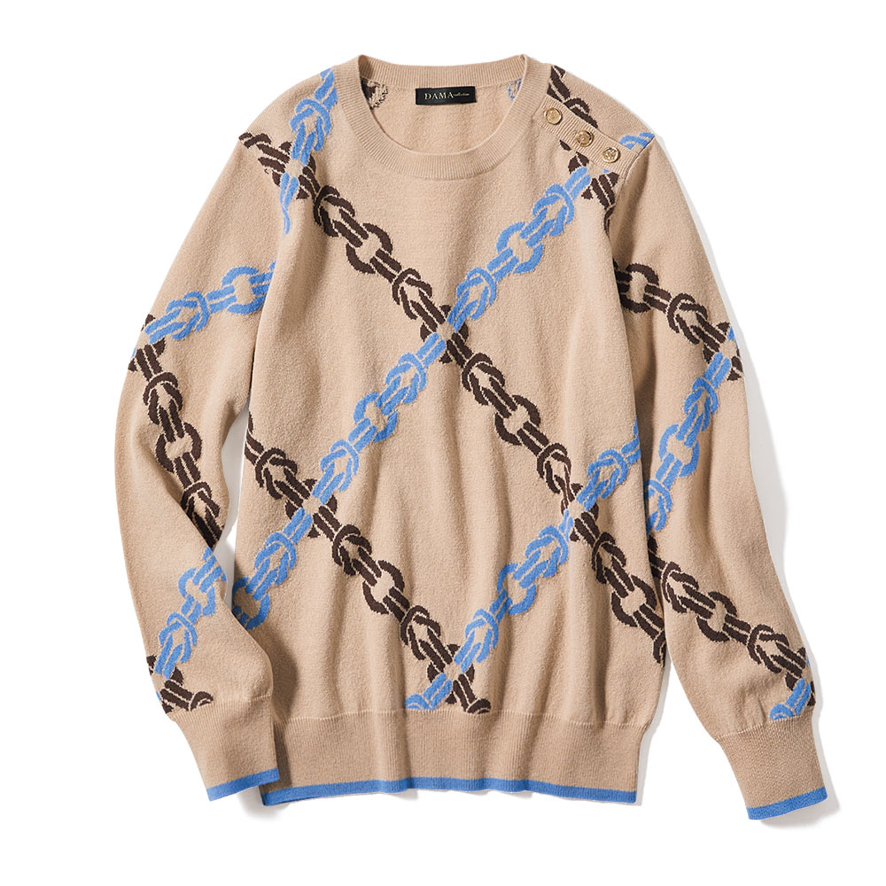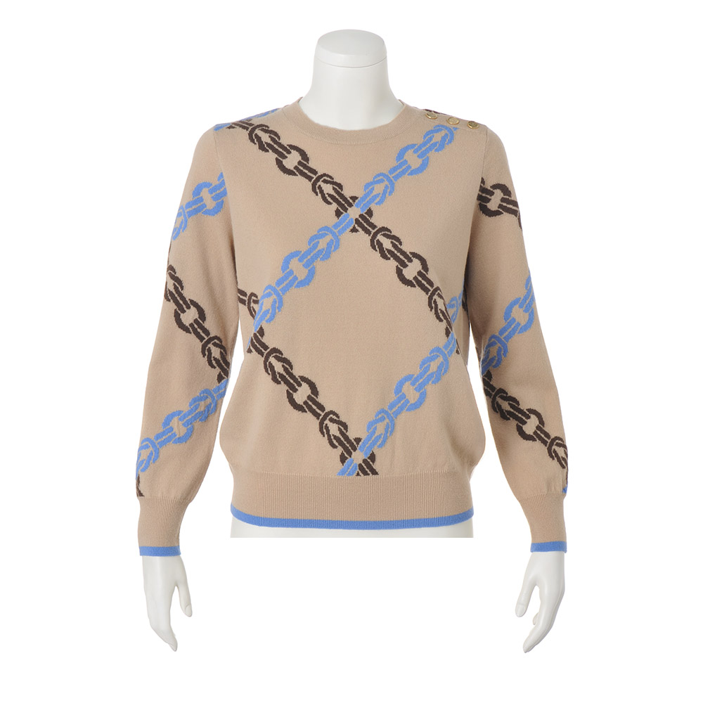 返品送料無料キャンペーン実施中!3/31(火)まで 対象商品心に響く、奥行きのある知性美。「褐色」を意味するタン(Tan)&ブルーの組み合わせは上品な深みと透明感のバランスが絶妙。大人の豊かな精神性を感じさせるスタイリッシュな装いを演出します。柄ニットで楽しむレトロ&モードの調和。ベージュ地にブルーとブラウンのチェーン柄をグラフィカルに配したジャカードニットは、一着でトレンド感を演出できるのが魅力。パンツにもスカートにも合うすっきりシルエットを基本にしつつ、左肩には紋章風の刻印入りのゴールドボタンを配したり、袖口や裾のリブにブルーのラインをリフレインしたり…。クラシカルなチェーン柄をリッチに際立たせるディテールも大人好み!ふんわり柔らかなウールカシミヤ素材だから冬から春先まで心地よくお洒落を支えてくれます。≫ POINT裾リブは少し長めにして、腰周りに自然に収まるシルエットに仕上げています。