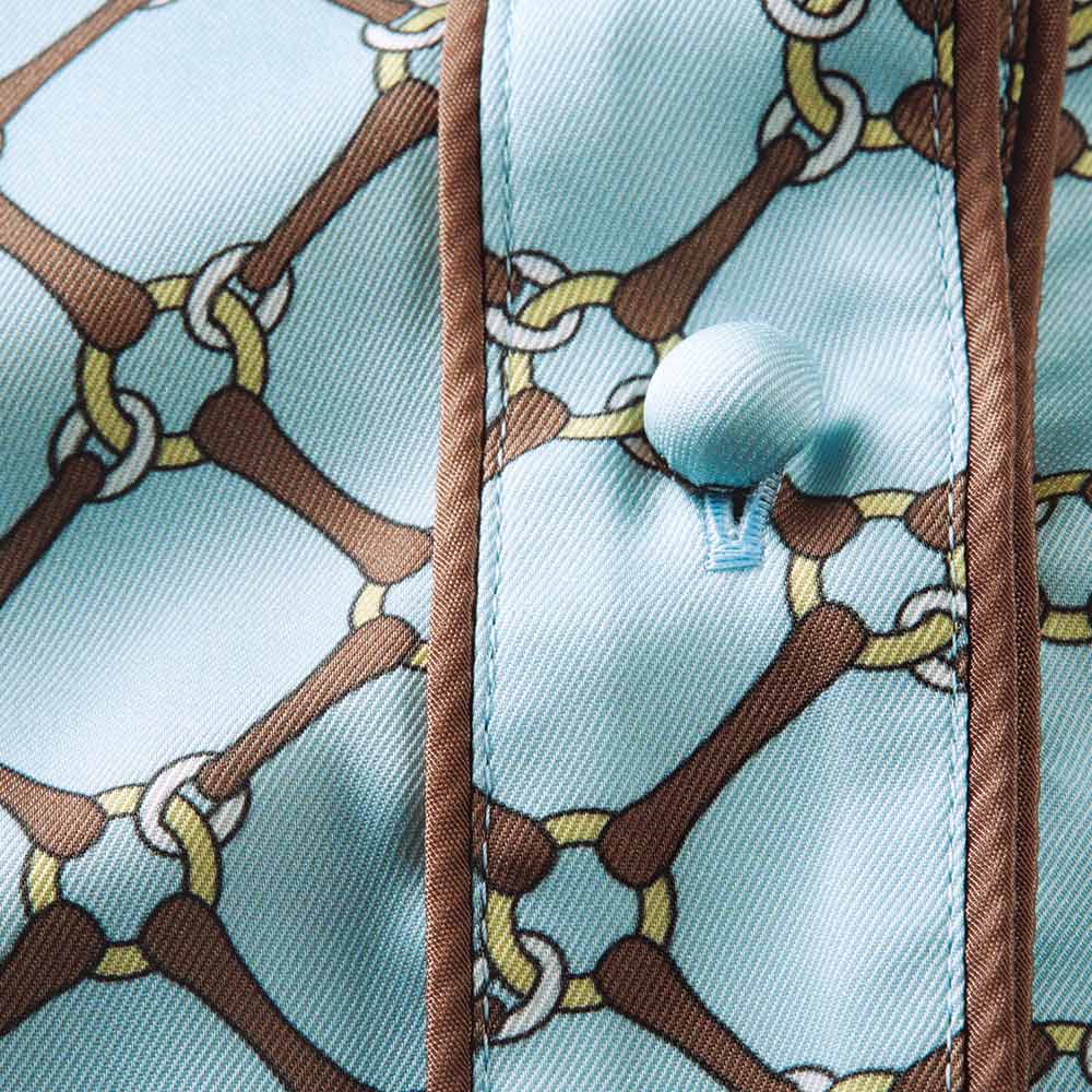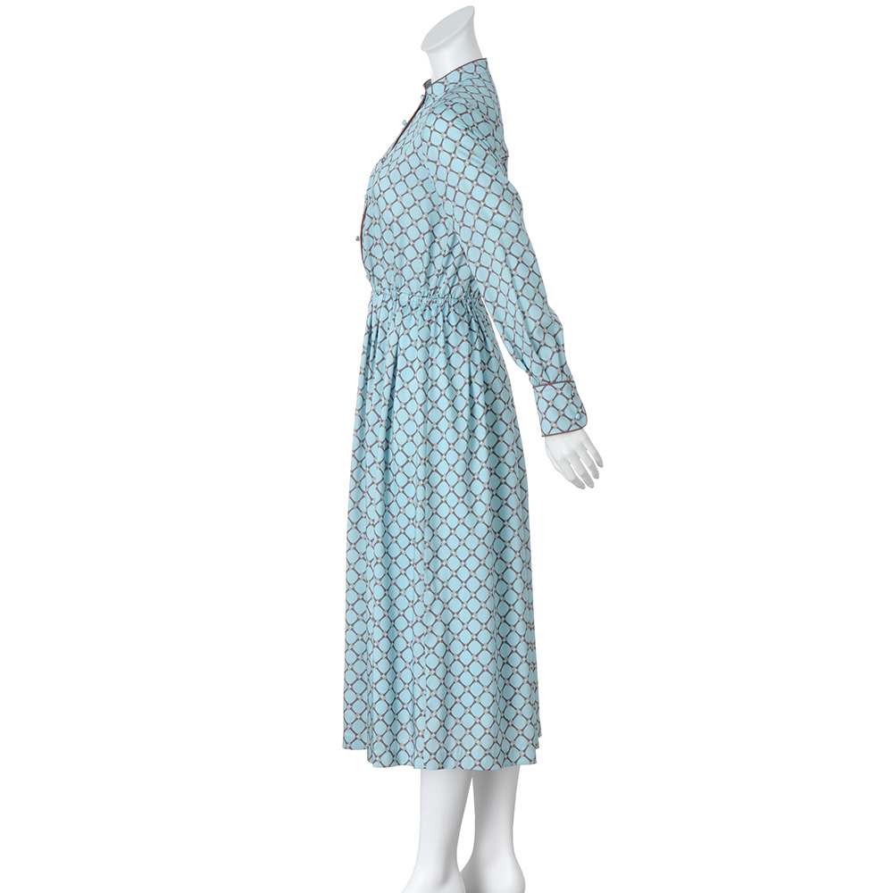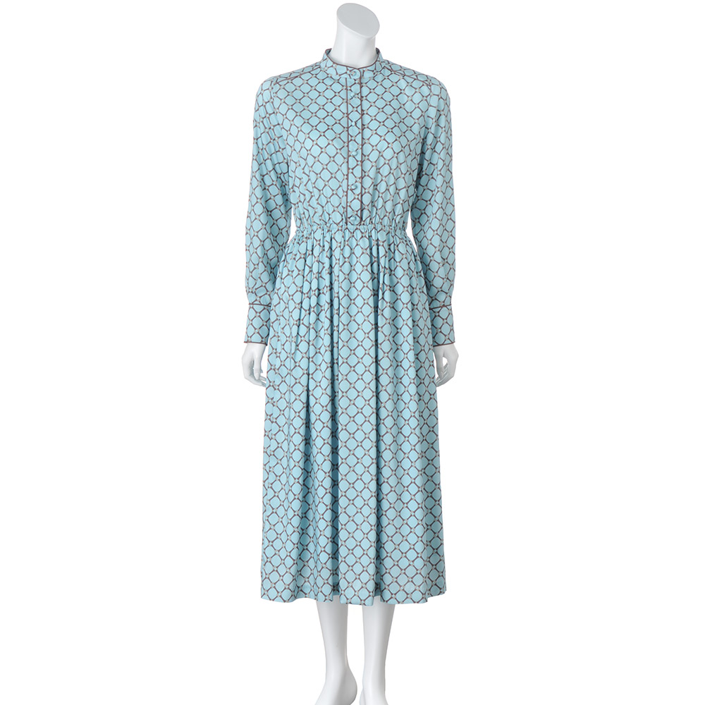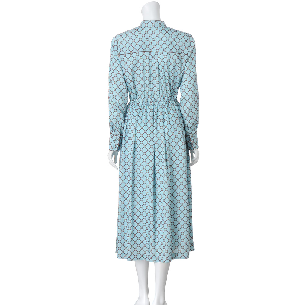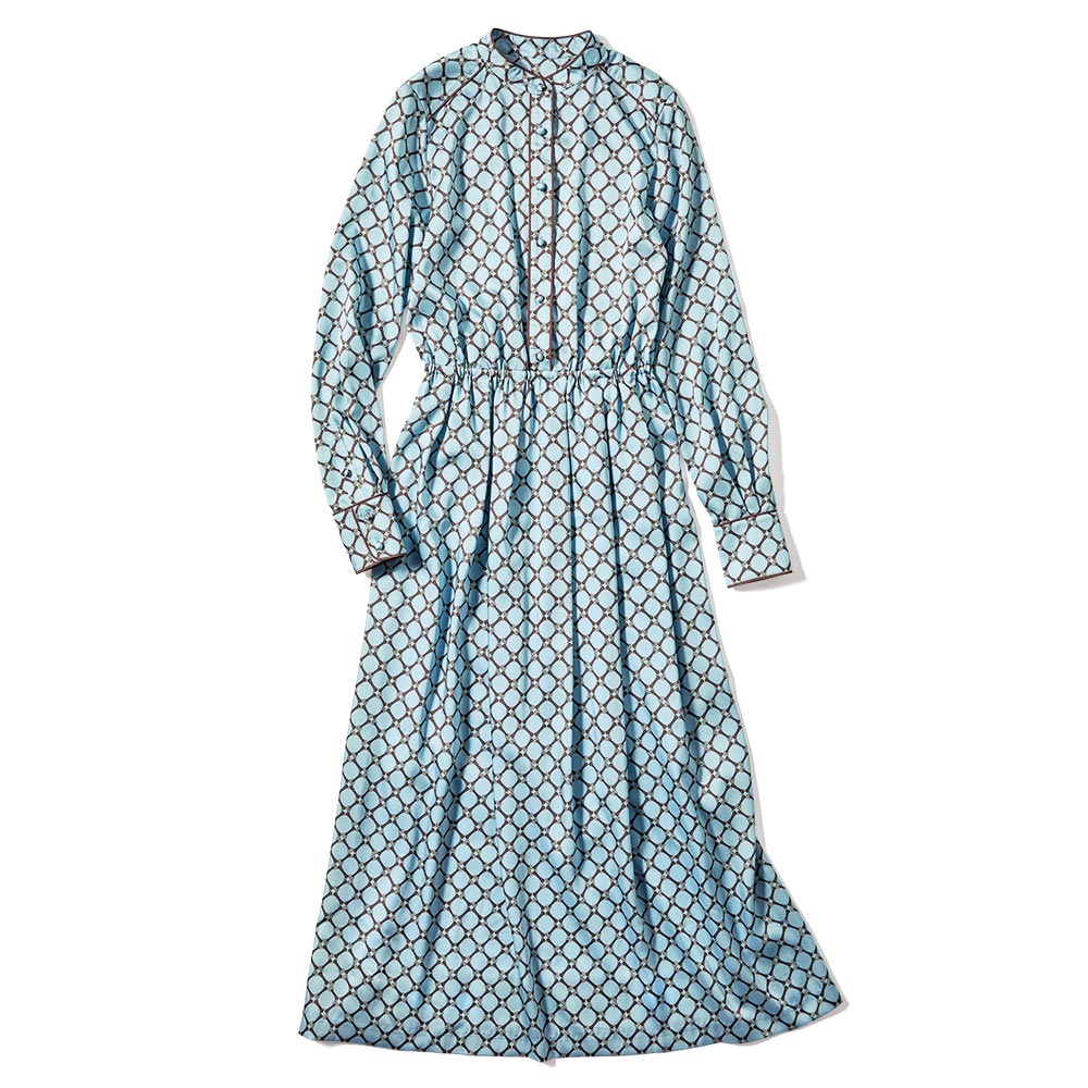 心に響く、奥行きのある知性美。「褐色」を意味するタン(Tan)&ブルーの組み合わせは上品な深みと透明感のバランスが絶妙。大人の豊かな精神性を感じさせるスタイリッシュな装いを演出します。柄×配色の絶妙さで上品ワンピースをモードに導いて。艶やかなアクアブルーのツイル地に載せたビットチェーンの図柄は、DAMAコレクションでしか買えないオリジナル。クラシカルな上品さと瑞々しいモード感が絶妙にマッチした滑らかな素材を活かして、着心地を満喫できるシャツワンピースが完成しました。上身頃は、バンドカラーの襟周りと肩ヨーク切り替え、前立て端、カフス周りに配したブラウンのパイピング、まろやかなくるみボタンでブラウスライクな可憐さを表現。ゴムを入れたウエストで切り替えたスカート部分は、タックギャザーで膨らみを程良く抑えて軽やかエレガントなシルエットを構築。ブラウジングしても優雅さをキープする長めの着丈は、ブーツはもちろんフラットシューズやスニーカーとも好相性。季節やシーンに合わせた足元アレンジを存分に楽しめます。≫ POINTウエストゴム+タックギャザーで着やすさと膨らみ過ぎないシルエットを両立。