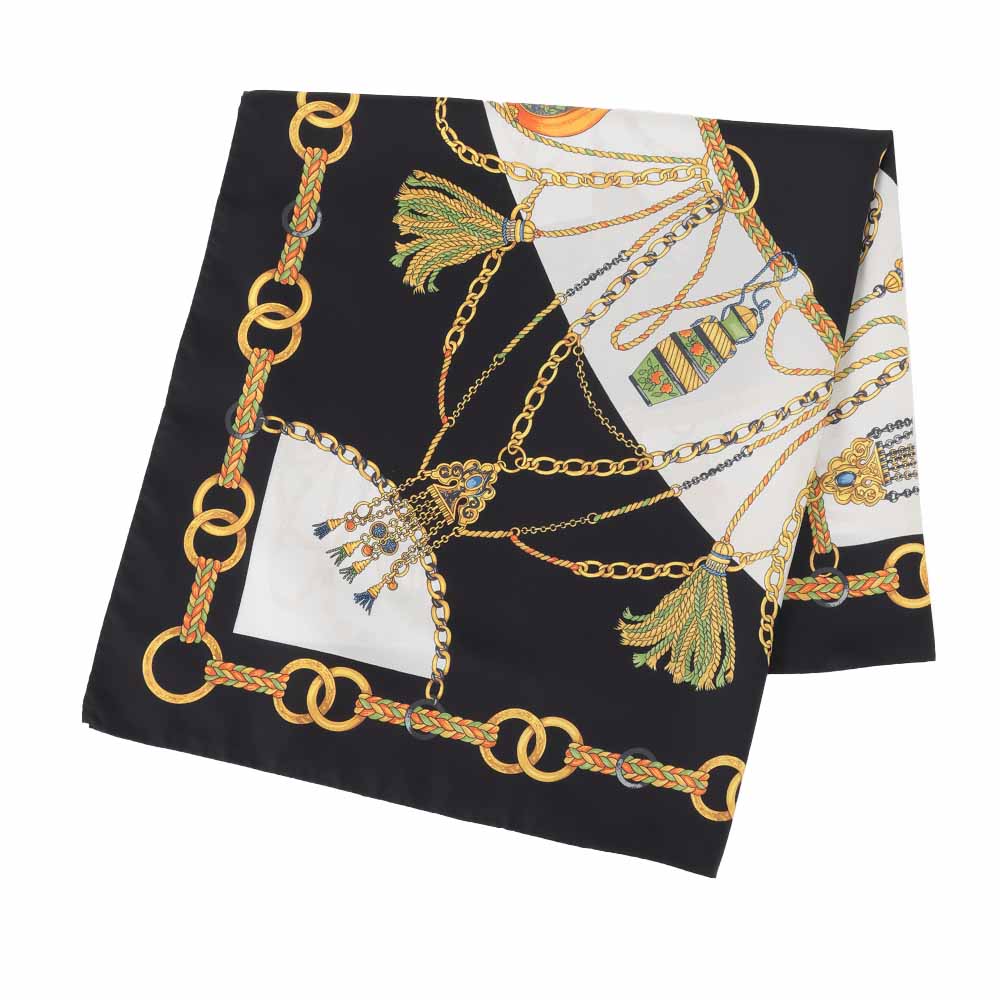 CAREER STYLE仕事もお洒落も際立つ女性は誰より早く春を纏う。心浮き立つ春、新しい輝きを求めて仕事も着こなしも軽やかに。きちんと感だけでは終わらない優しさと華やぎを込めたアイテムを取り入れましょう。イタリア「BINDA」社のアーカイブ柄シルクスカーフ。ブラックを基調に華やかな色使いが映える一枚です。カラフルに描かれた香水瓶、ロープ、チェーン、タッセルの絵柄がチャーミング。
