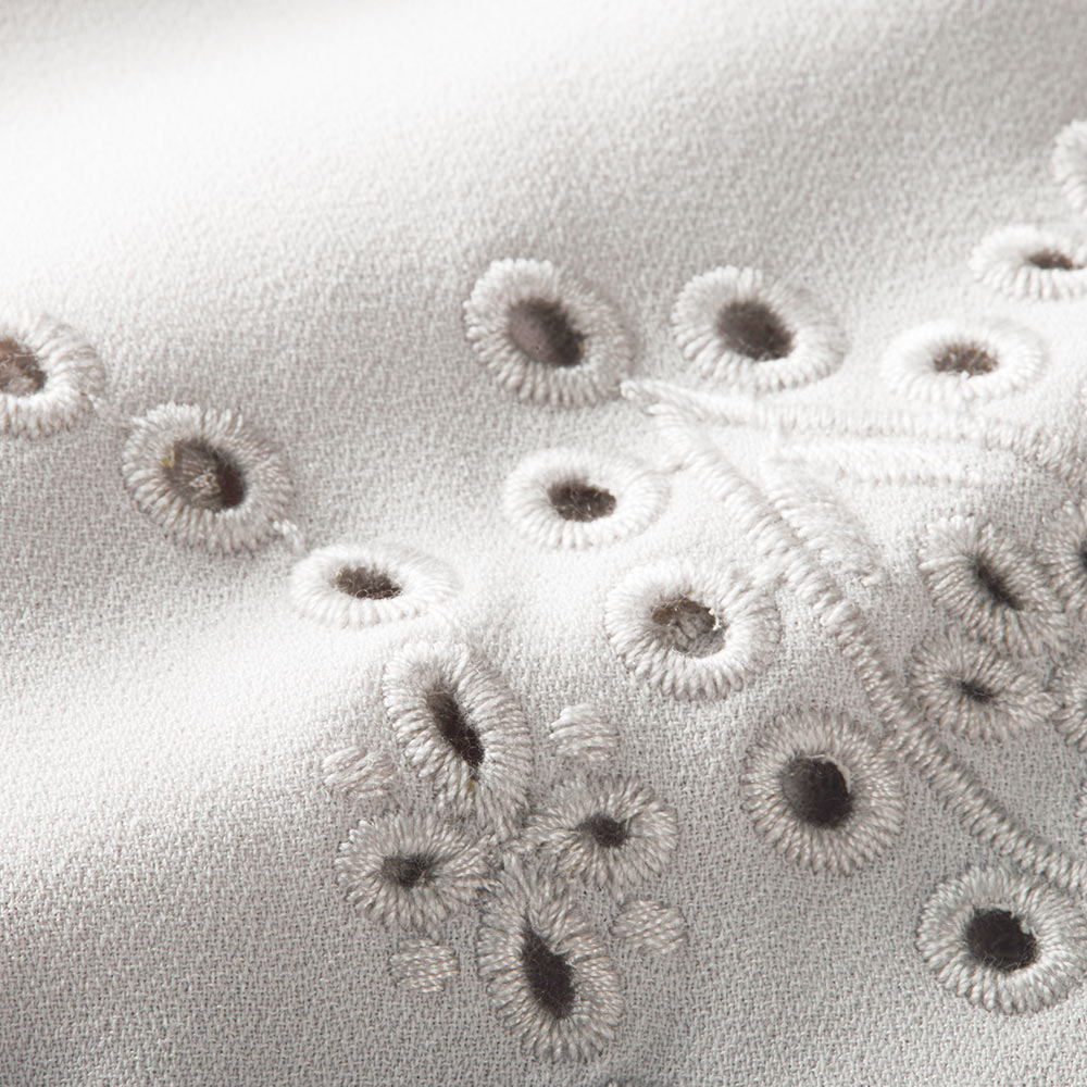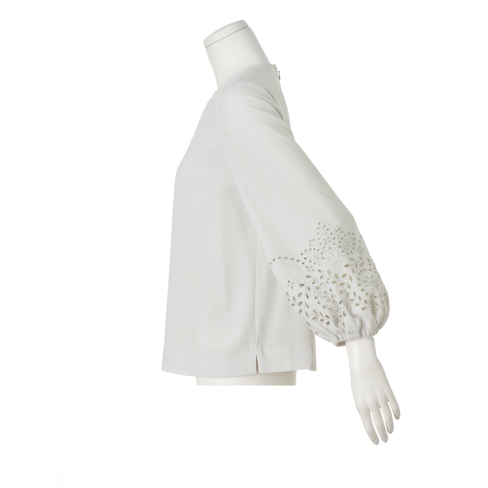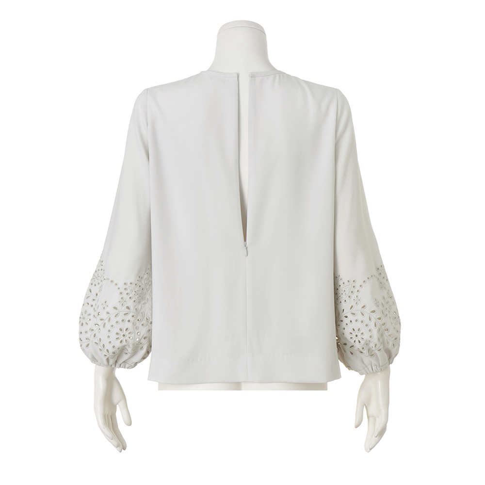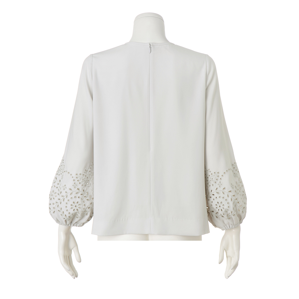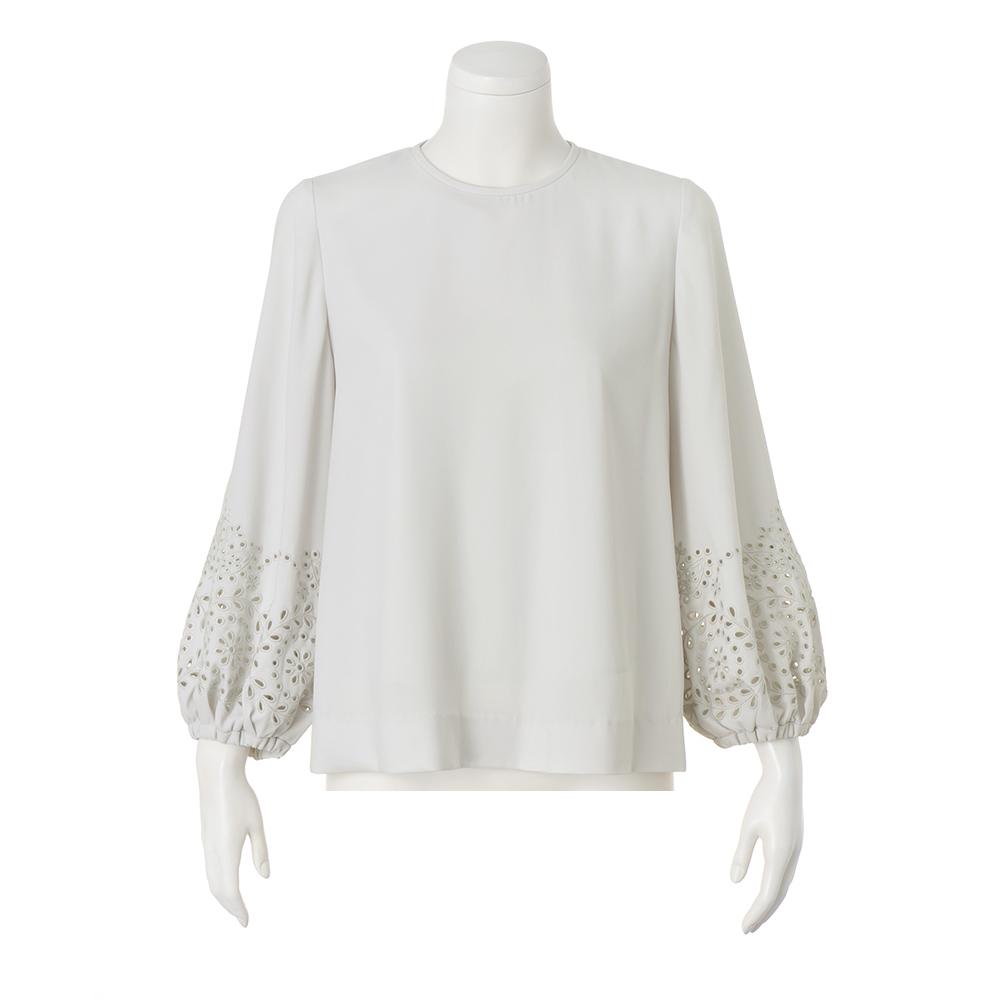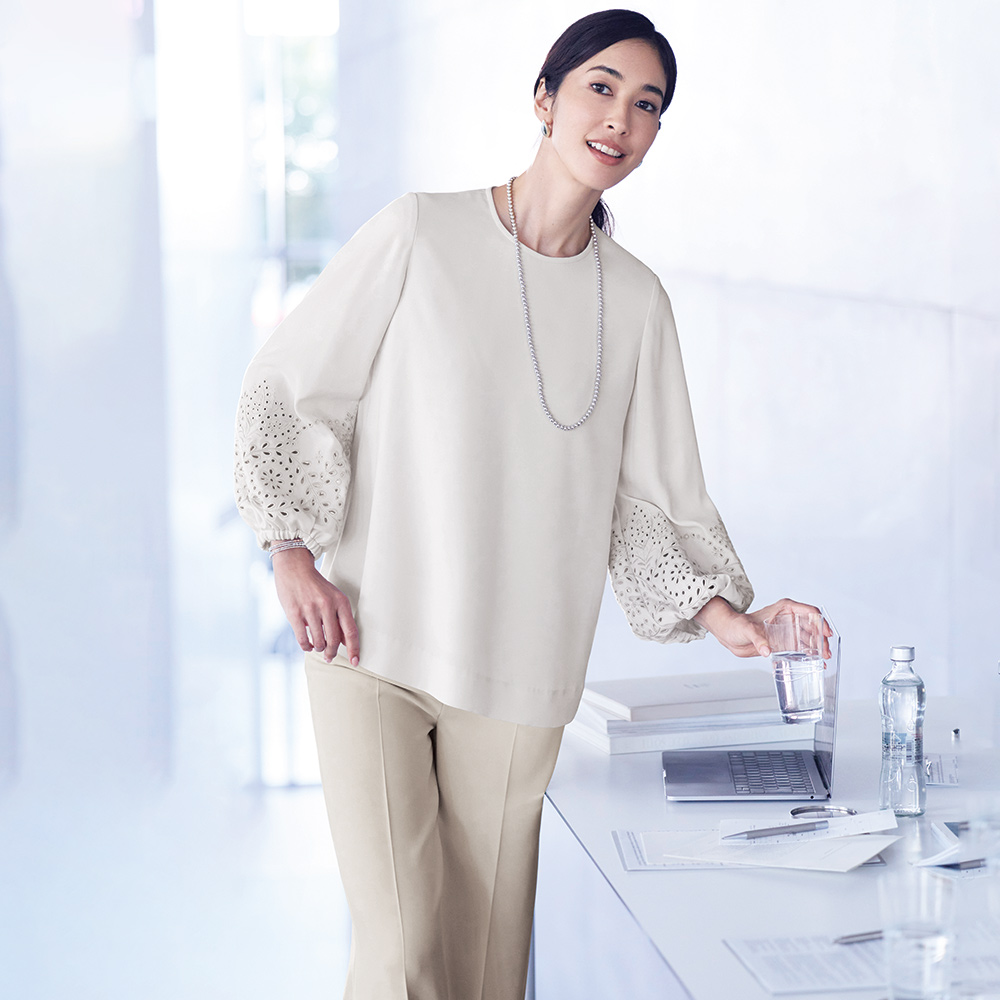 CAREER STYLE仕事もお洒落も際立つ女性は誰より早く春を纏う。心浮き立つ春、新しい輝きを求めて仕事も着こなしも軽やかに。きちんと感だけでは終わらない優しさと華やぎを込めたアイテムを取り入れましょう。シンプルな中に咲く大人の可憐。気楽に着られて、「今日なに着よう…」の悩みを解消してくれる、シンプルながら袖のディテールが際立つ着映えブラウス。素材はマットなシボ感と弾むようなドレープ性がまろやかなシルエットを描き出すポリエステルジョーゼット。肘下にあしらわれたフラワー&リーフ柄の華やかなカットワーク刺しゅうがチャームポイント。袖口ゴム仕様のパフスリーブの甘さとともに春らしい軽やかさをプラスします。狭めの襟開き、少し短めの九分袖、裾の浅いサイドスリットが、ふんわりとした分量感をすっきりとした印象に収めるディテールです。