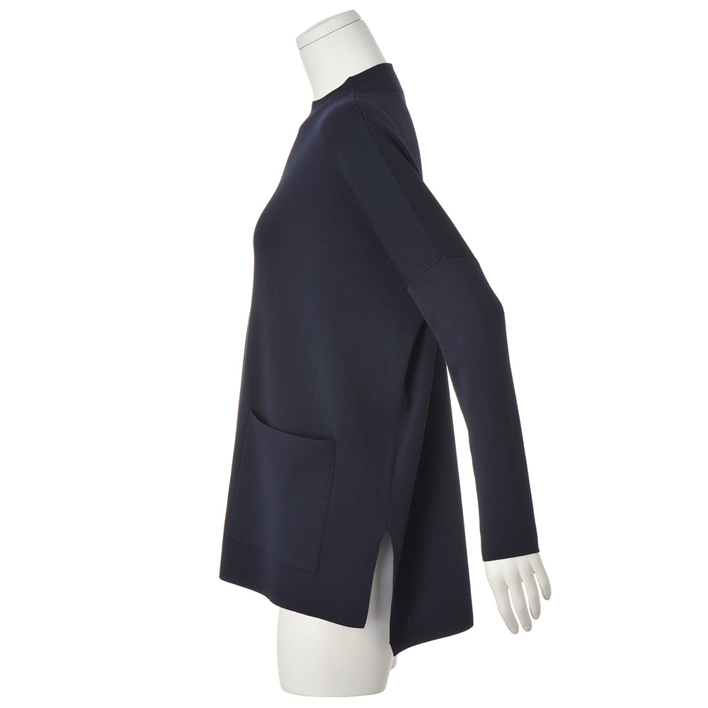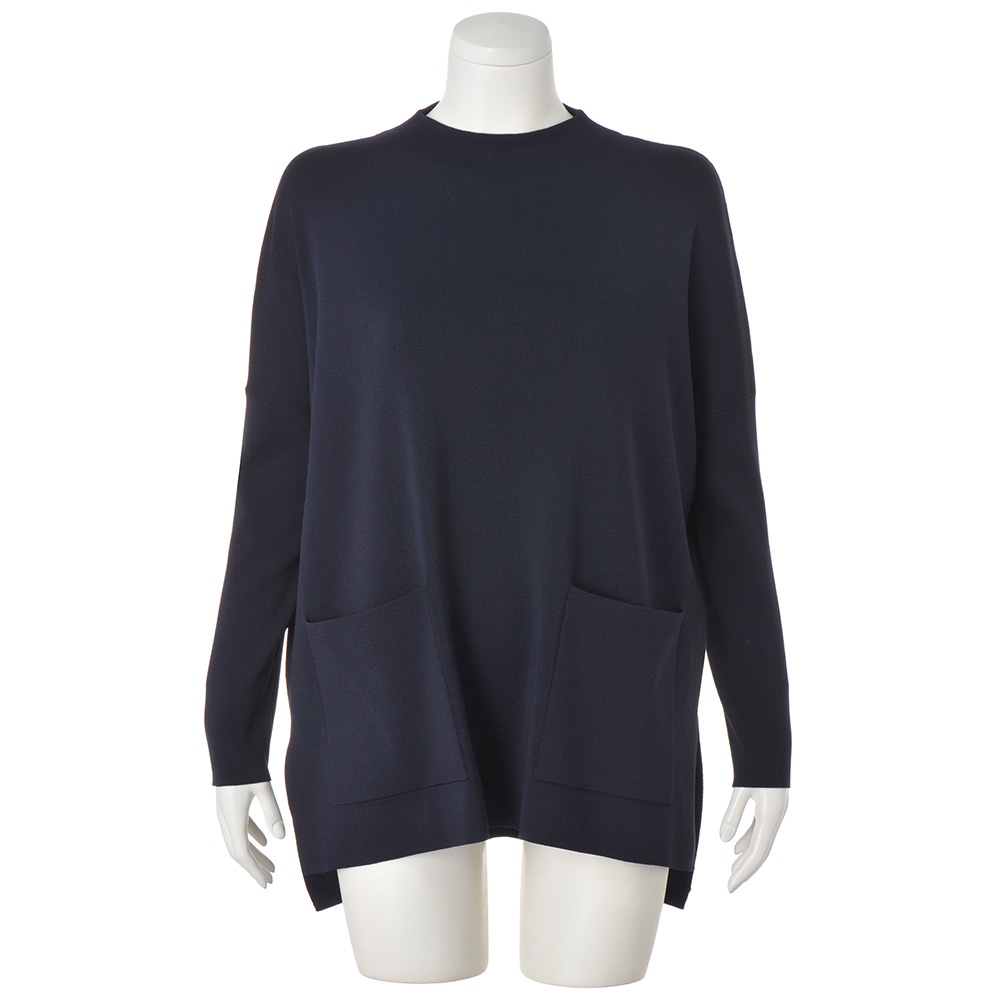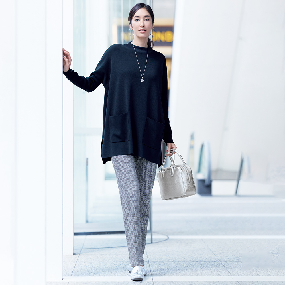 仕事もお洒落も際立つ女性は誰より早く春を纏う。心浮き立つ春、新しい輝きを求めて仕事も着こなしも軽やかに。きちんと感だけでは終わらない優しさと華やぎを込めたアイテムを取り入れましょう。素材と形の心地よさが大人の余裕を醸し出す。スタイルカバーが叶う、人気のスクエアフォルムのニットプルオーバー。広い身幅と細い袖のコントラスト、長めのスリットでビッグシルエットをすっきり軽やかに着こなせます。しなやかな編み地は、ドライタッチなウール混ストレッチ糸を使ったハイゲージの総針編み。大きめのパッチポケットが大人好みのアクセントです。