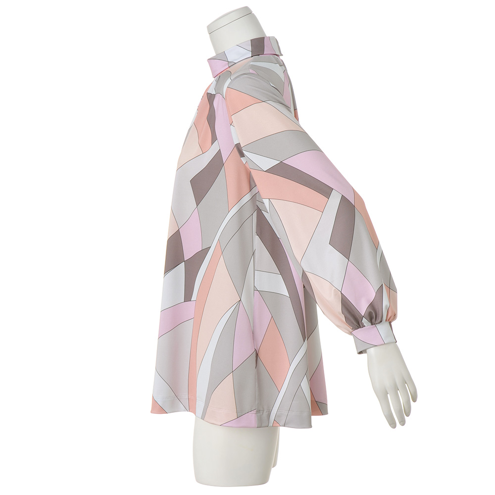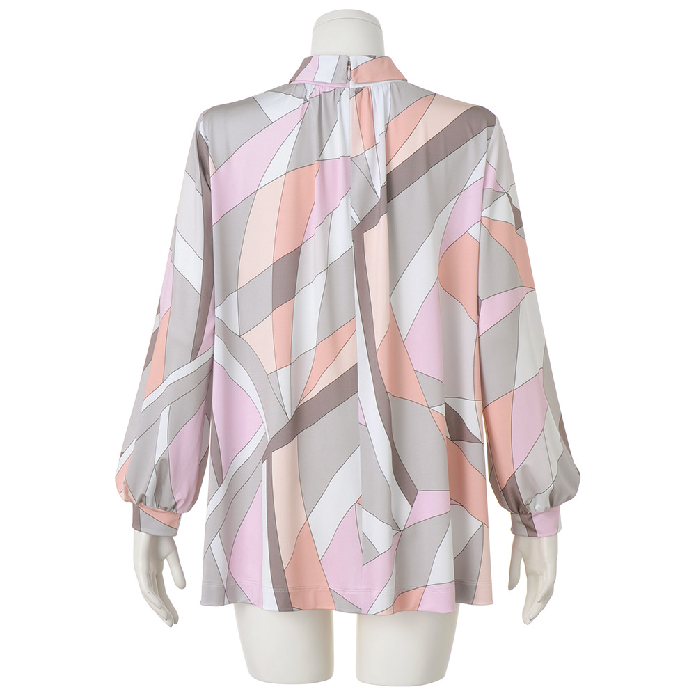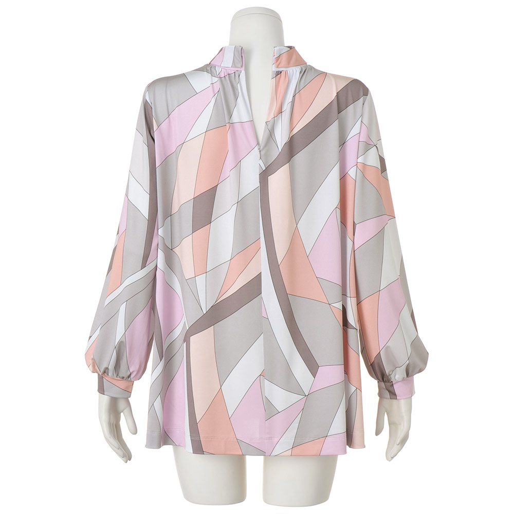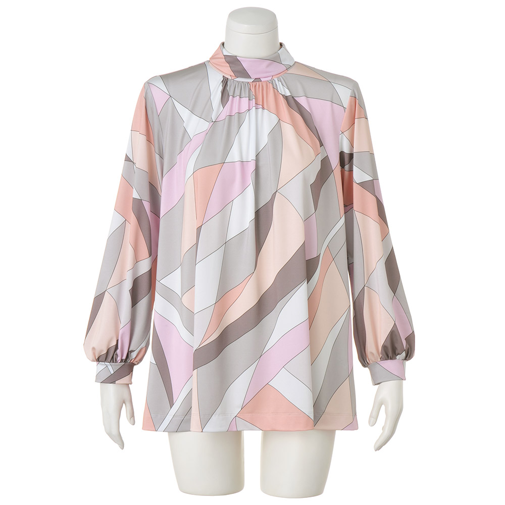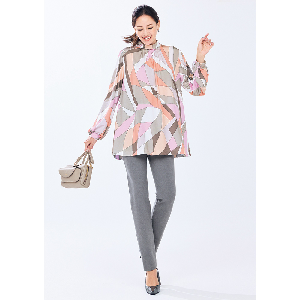 Tunic SPRING Style春のスタイルアップは、きれい見えチュニックにお任せ楽しい予定が目白押しの季節、纏うだけで旬の着こなしが完成するチュニックの出番です。幸せオーラで印象をアップデート顔映りの良い“チークカラー”をライトグレーやグレージュで引き締めた幾何学柄は春光のプリズムのよう。光沢感とドレープ性が美しいジャージー素材で、のびやかな着心地と流れるドレープが美しいチュニックに仕立てました。襟ぐりの前後に細かなギャザーを寄せて、自然な裾広がりのAラインシルエットに。ドレープが生まれ、モダンな柄に優しい表情を与えます。折り返しの襟は細めのボトルネック。さりげなく首元に抜け感をつくり、首周りをカバーします。パフスリーブの袖口はカフス仕様で、きちんと感と上品さをキープ。着映えと着心地のよさに何度でも袖を通したくなりそう。