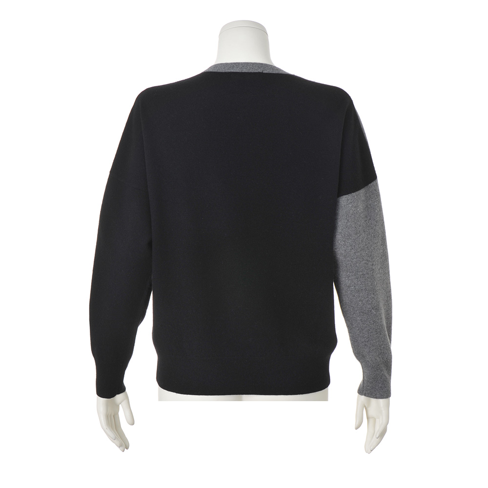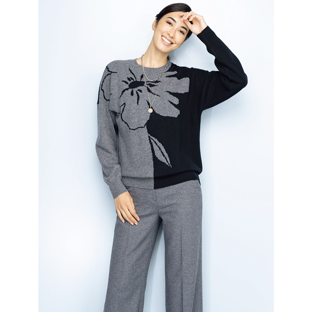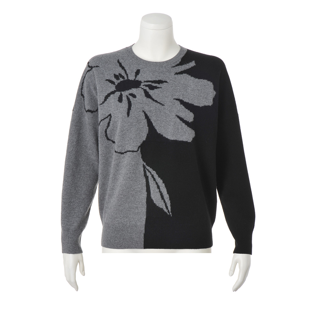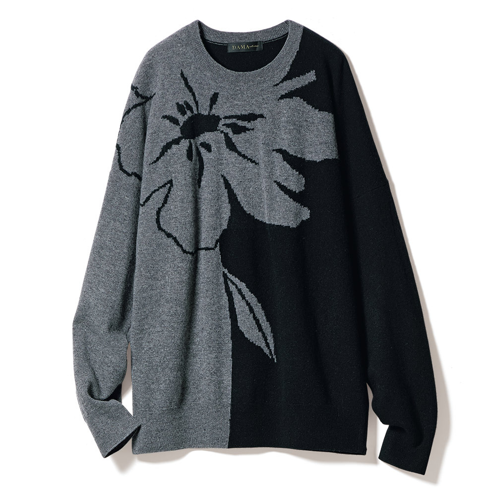 返品送料無料キャンペーン実施中!3/31(火)まで 対象商品袖を通すだけで絵になるアートなバイカラーニットまるでアートを纏うような大胆な図案にモダン・エレガンスが薫るニット。素材は、エアリーな風合いの極細ウールに滑らかなカシミヤをブレンドした拘りの上質糸。リラクシーなドルマン風シルエットがたおやかなゆとりを生み、心の芯まで暖かく包み込むような着心地を堪能できます。ベースは端正な天竺編み、前身頃のフラワーモチーフはジャカード編みで優しげな立体感を添えて、着心地と着映えを両立させました。やや右に寄せたコントラスト配色は、よりスマートな印象を引き立てて。後ろ身頃は黒無地ですっきりと魅せつつ、襟ぐりと右袖にグレーを残し、モードな遊び心も忘れずに。≫ POINT左右の袖の配色が後ろ姿にモードなコントラストをプラス。一着で暖かさと洗練の華やぎをもたらします。