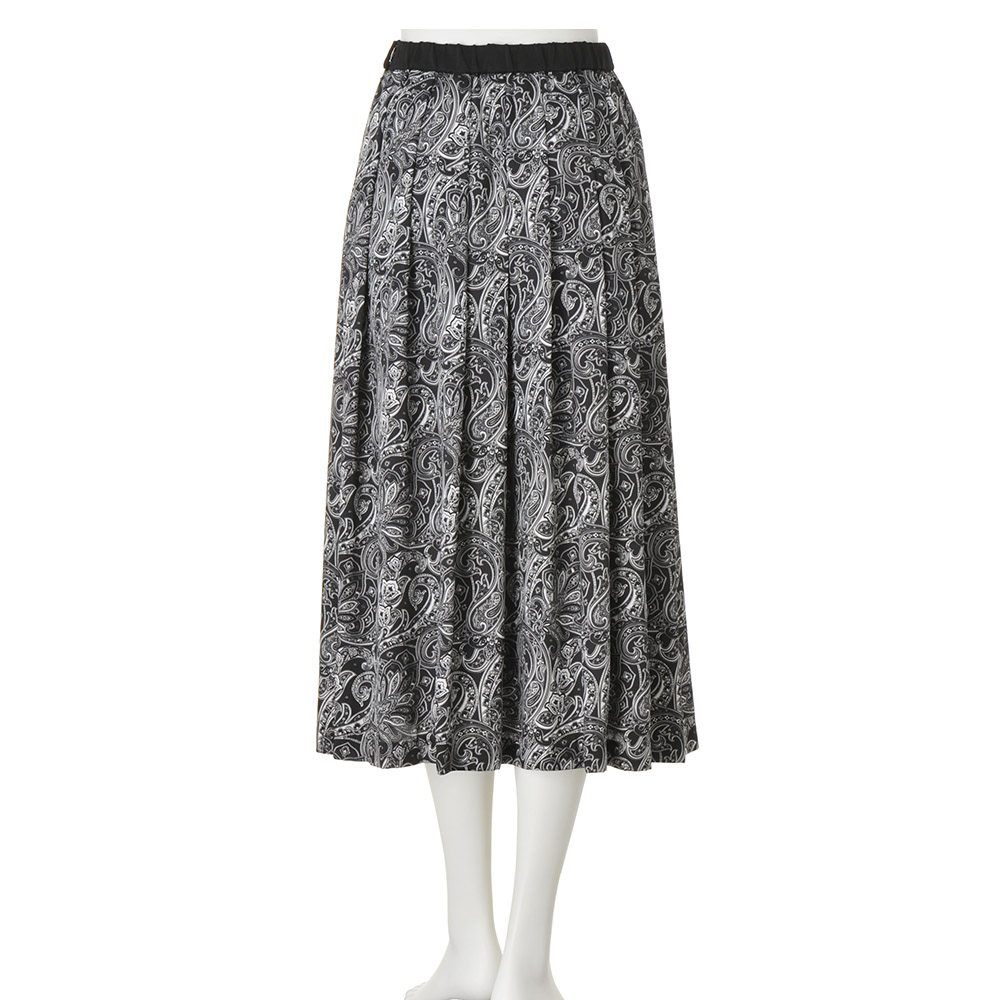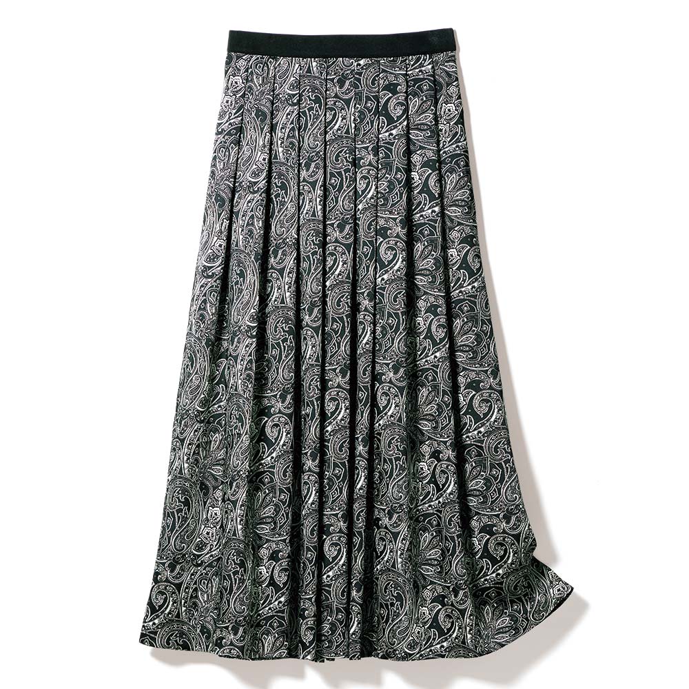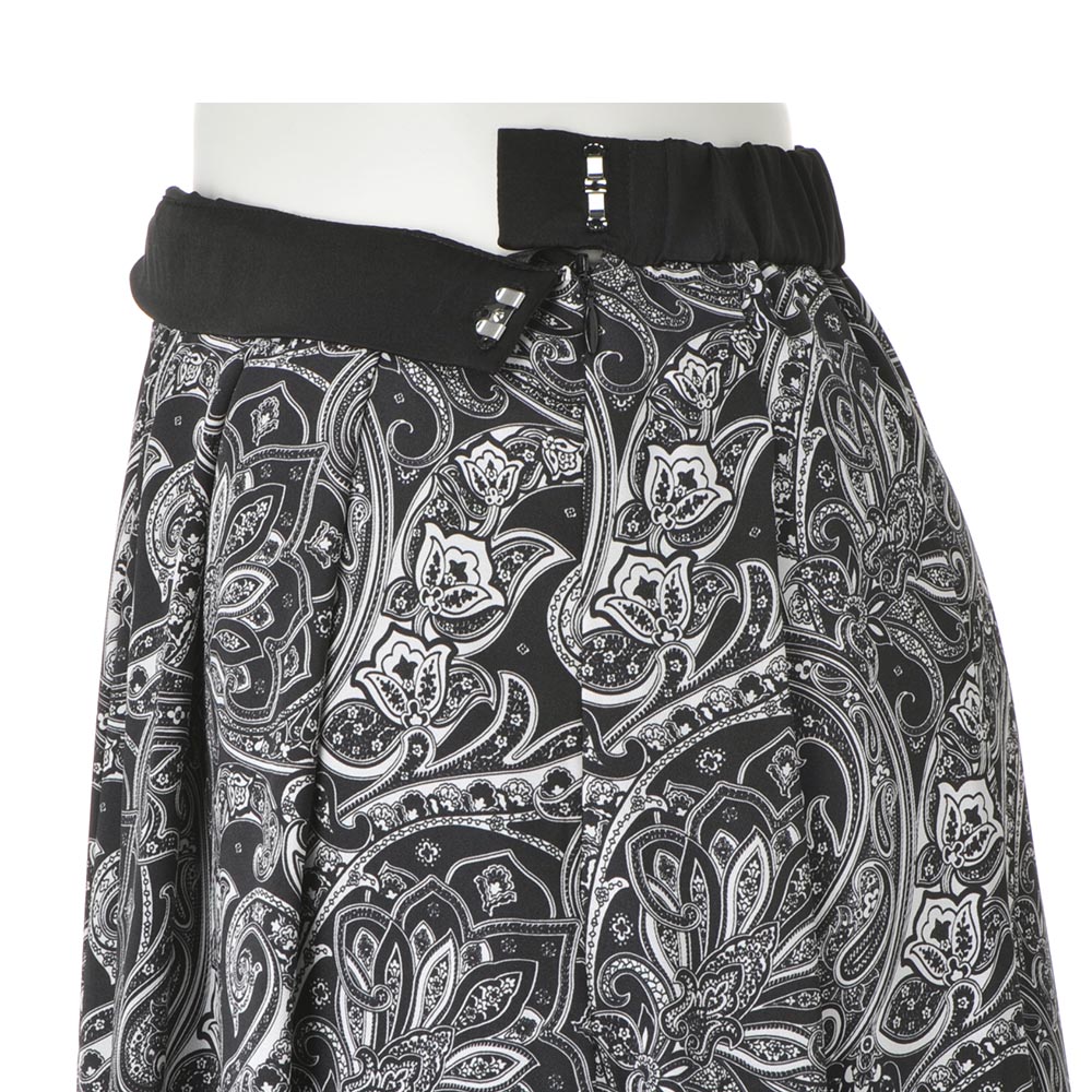 クラシックに気高さを纏って。黒の品格と白の清廉さは、美しい女性のワードローブに欠かせないもの。心華やぐ季節は、甘やかに女性らしく、品格に満ちた黒と白のエレガンスが似合います。華やかな黒×白の世界観。その甘美な気品に心躍る上品な光沢のツイル素材に、アーカイブから復刻したクラシックペイズリー柄を緻密に再現したイタリア製のプリントを使用。ウエスト周りにぐるりと同一方向のタックを入れることで、柄に動きを持たせつつ膨らみを抑えた上品なフェミニンシルエットを構築しました。≫ POINTウエストベルトはプリント部分と同じツイル素材のブラックで引き締まった印象。後ろウエストはゴム仕様で快適。