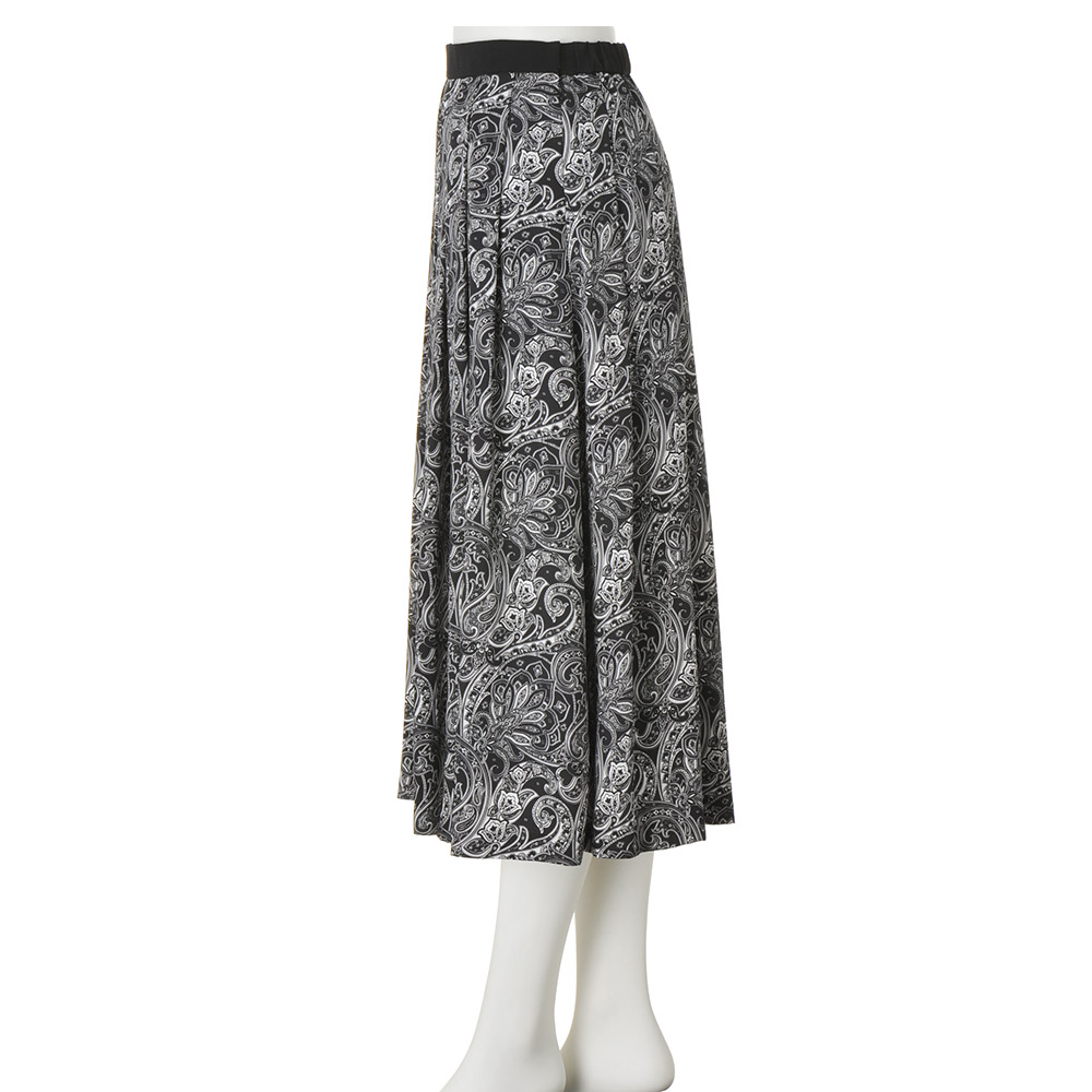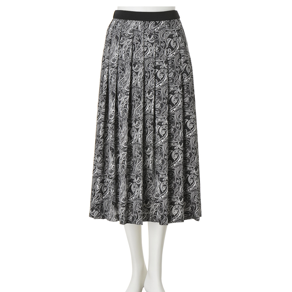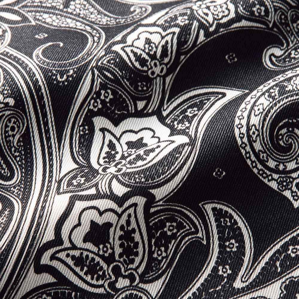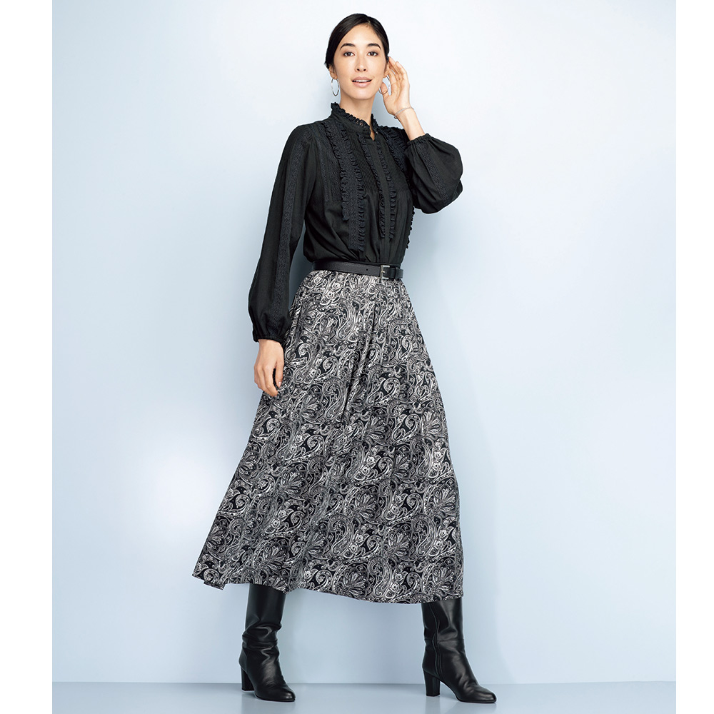 クラシックに気高さを纏って。黒の品格と白の清廉さは、美しい女性のワードローブに欠かせないもの。心華やぐ季節は、甘やかに女性らしく、品格に満ちた黒と白のエレガンスが似合います。華やかな黒×白の世界観。その甘美な気品に心躍る上品な光沢のツイル素材に、アーカイブから復刻したクラシックペイズリー柄を緻密に再現したイタリア製のプリントを使用。ウエスト周りにぐるりと同一方向のタックを入れることで、柄に動きを持たせつつ膨らみを抑えた上品なフェミニンシルエットを構築しました。≫ POINTウエストベルトはプリント部分と同じツイル素材のブラックで引き締まった印象。後ろウエストはゴム仕様で快適。