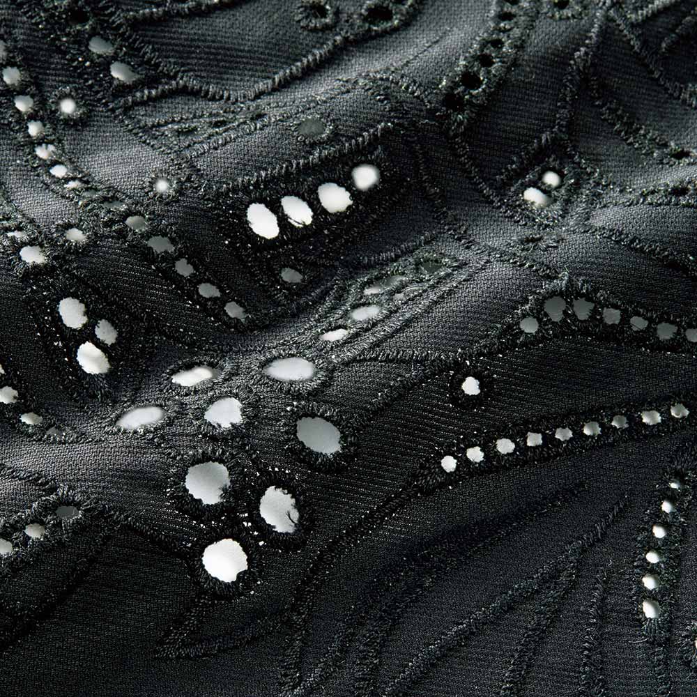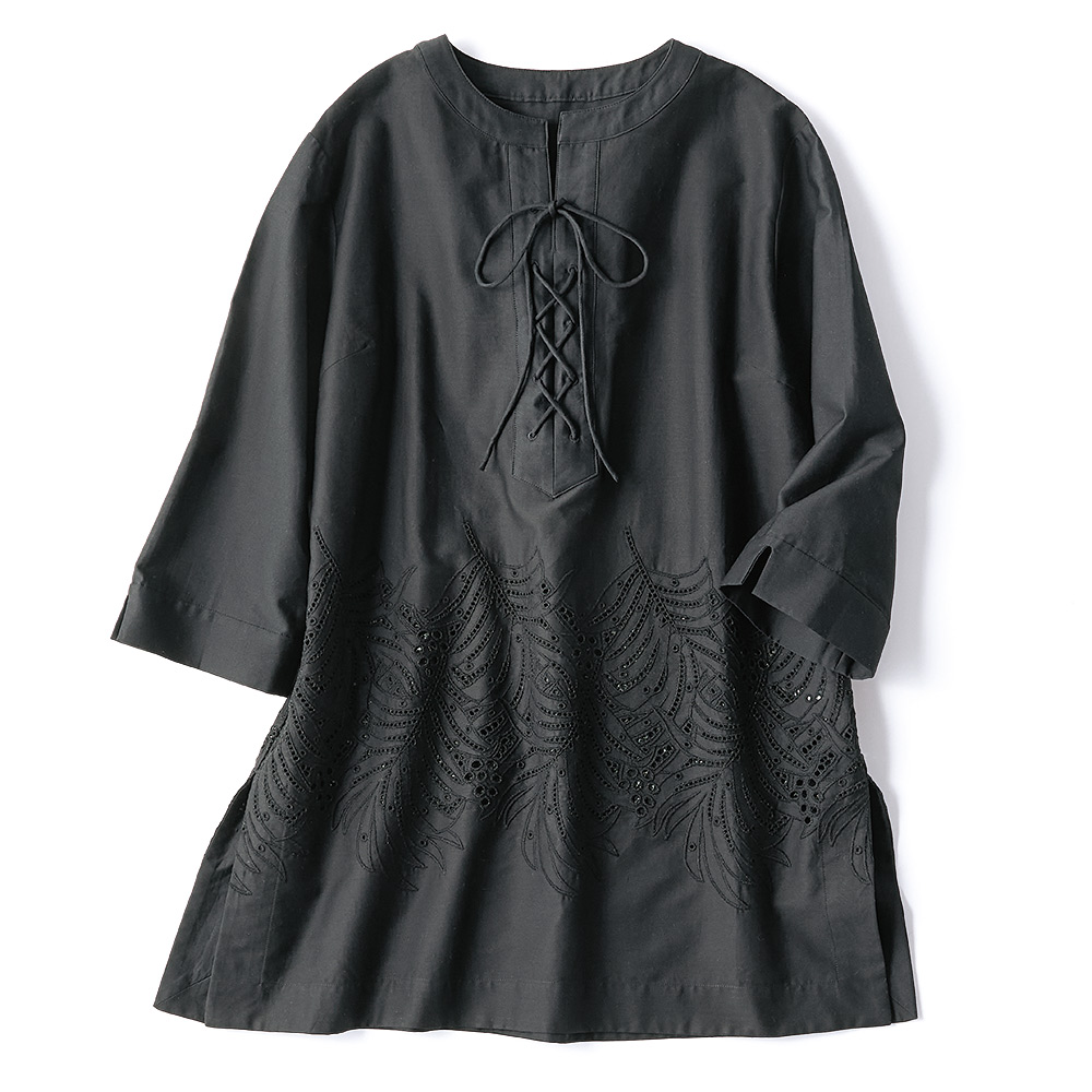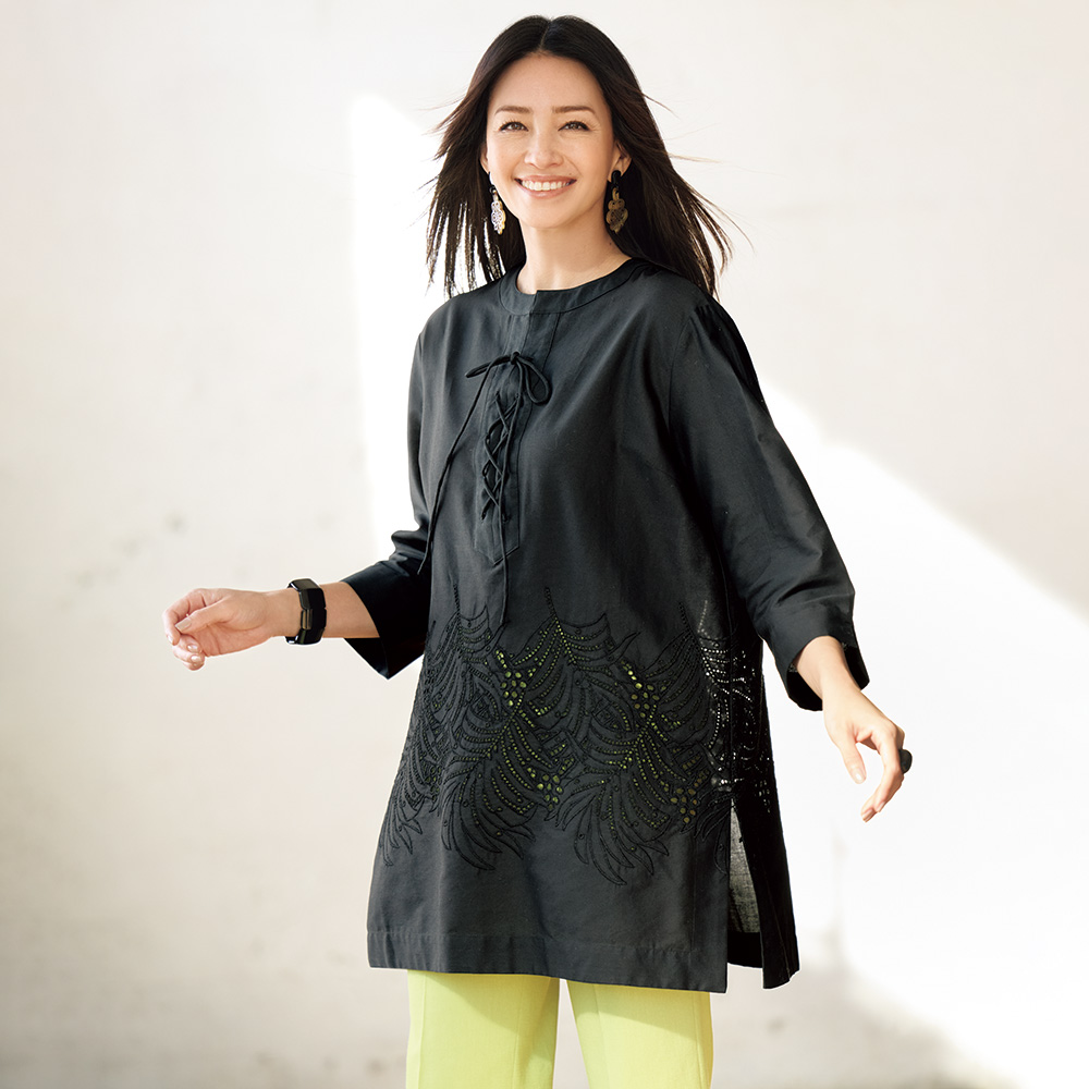 Botanical Chicトレンド継続のグリーンと、延長線上のアーシーな色合い。みずみずしさが香る“ボタニカル”なスパイスがフレッシュなときめきを運んできます。季節の煌めきをアイレットに刺し留めて南国に茂るモンステラの透かし柄が見事な、黒一色にして涼やかな素材は、レースの名匠「敦賀繊維(株)」によるもの。モンステラの葉っぱをカットワーク刺しゅうで前身頃と後ろ身頃にたっぷりとあしらいました。複雑な造形を繊細に表現していて、ハッと目を引く存在感があります。手の込んだ刺しゅうを気負いなく楽しめるよう、デザインは開放感のあるカフタン風チュニックに。身頃は体型カバーを叶えるゆったりとしたAラインに仕立て、手首が出る短めの袖&深めの裾スリットで抜け感をプラス。前開き部分にはレースアップを施して、フェミニンに仕上げました。≫ POINTカットワーク刺しゅうは後ろ身頃までぐるりと。スリット入りの袖口、背ヨーク下のボックスタックなど細部も端正。