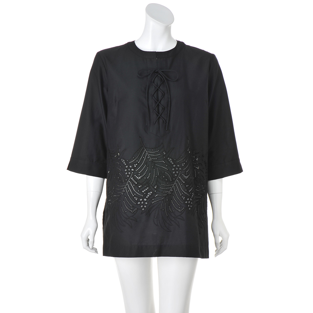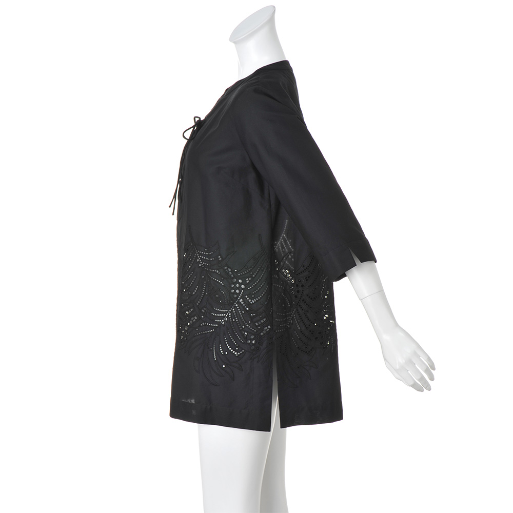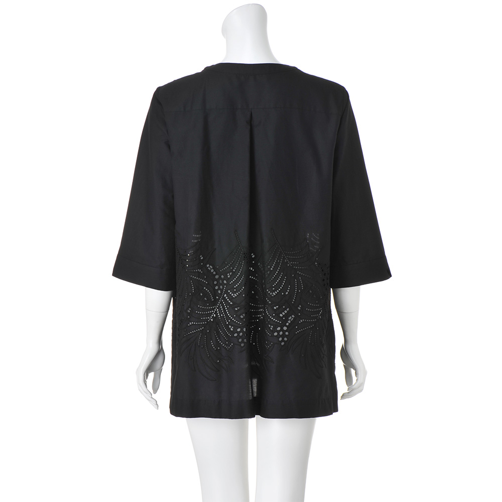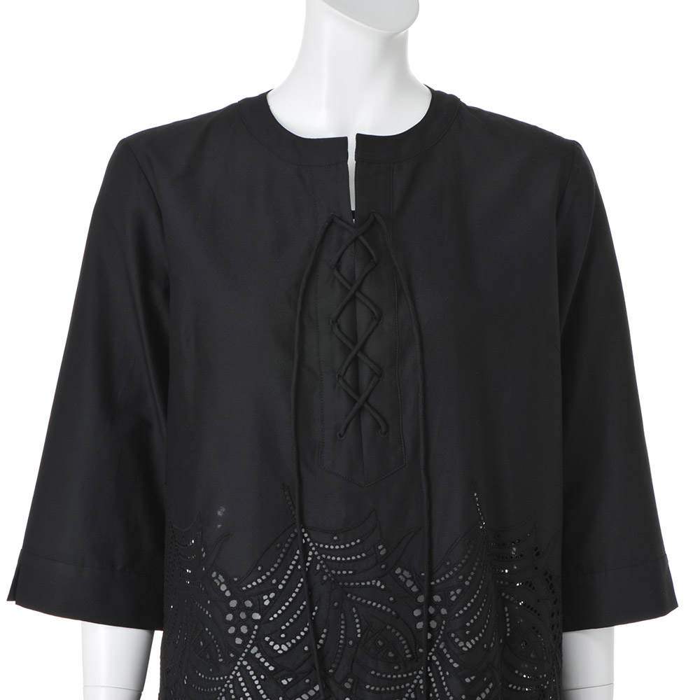 Botanical Chicトレンド継続のグリーンと、延長線上のアーシーな色合い。みずみずしさが香る“ボタニカル”なスパイスがフレッシュなときめきを運んできます。季節の煌めきをアイレットに刺し留めて南国に茂るモンステラの透かし柄が見事な、黒一色にして涼やかな素材は、レースの名匠「敦賀繊維(株)」によるもの。モンステラの葉っぱをカットワーク刺しゅうで前身頃と後ろ身頃にたっぷりとあしらいました。複雑な造形を繊細に表現していて、ハッと目を引く存在感があります。手の込んだ刺しゅうを気負いなく楽しめるよう、デザインは開放感のあるカフタン風チュニックに。身頃は体型カバーを叶えるゆったりとしたAラインに仕立て、手首が出る短めの袖&深めの裾スリットで抜け感をプラス。前開き部分にはレースアップを施して、フェミニンに仕上げました。≫ POINTカットワーク刺しゅうは後ろ身頃までぐるりと。スリット入りの袖口、背ヨーク下のボックスタックなど細部も端正。