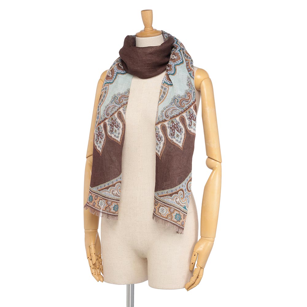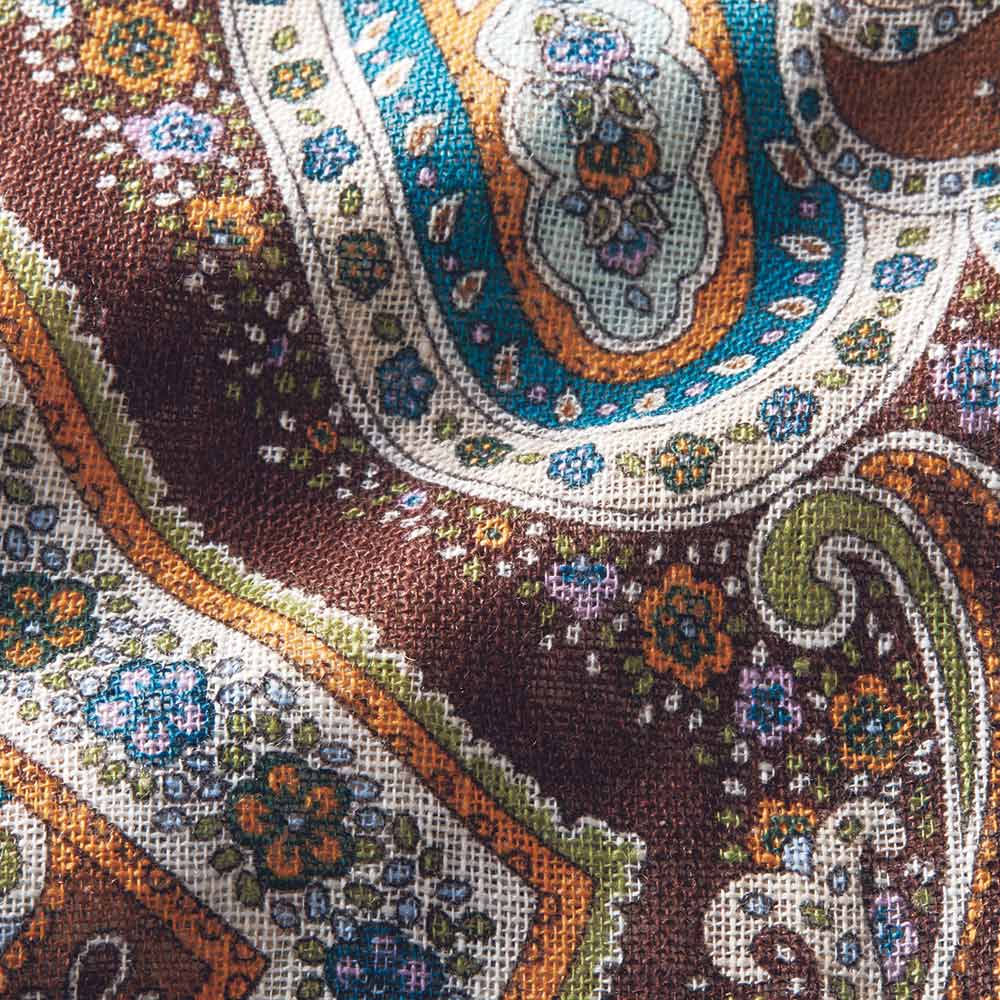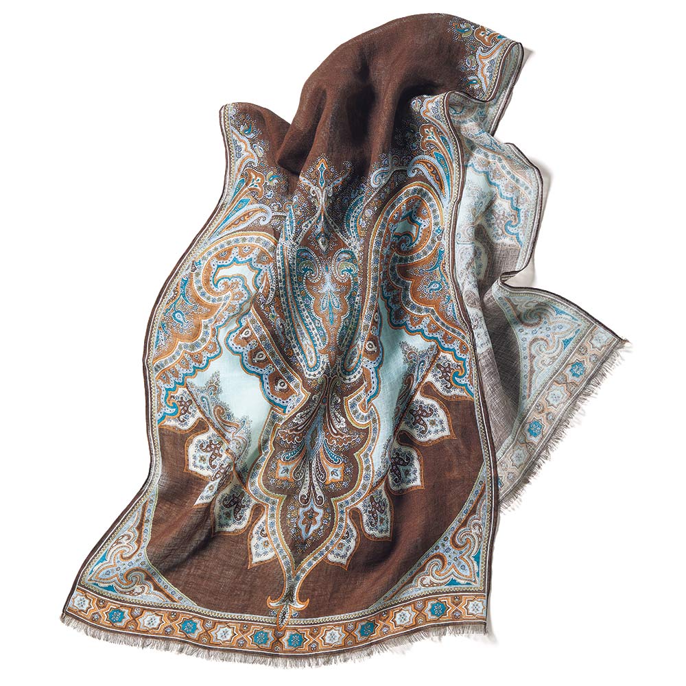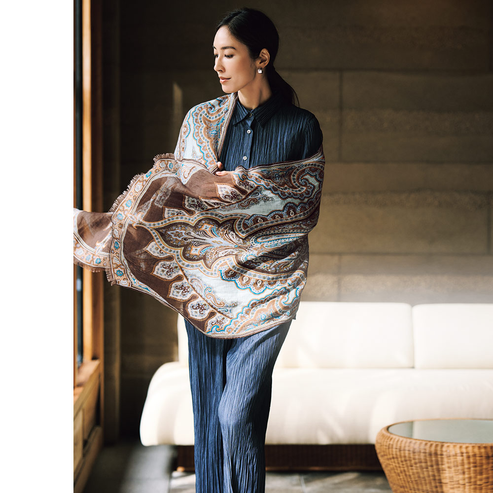 洗練を纏い、週末のエスケープへ日々の喧騒を離れて向かうショートトリップ。自然やアートで感性を刺激する旅のお洒落は、リラックス感がありながらも洗練された落ち着きが欲しいもの。着心地と品の良さを両立した、感度の高い旅カジュアルをご提案。美しい絵画を纏うように…緻密なペイズリー柄を堪能春夏の旅のワードローブにワンランク上の華やぎと利便性をもたらす、リネン素材の大判プリントストール。ひと巻きでエレガントに見せてくれる絵柄の美しさに拘って厳選した新柄は、ペルシャの文様や建築から着想を得たアーカイブプリントをペイズリー柄に再構築したもの。DAMAコレクションが信頼を寄せる「BINDA」社製プリントならではの精緻な美しさが存分に発揮されています。ブラウンを基調にターコイズやオレンジを配したイタリアらしい感性が薫る多色使いはどんな装いにもなじみやすく、朝晩の冷えこみや冷房対策にはらりと纏うだけで見違えるほどリュクスな魅力が漂います。≫ POINT均整の取れたペイズリーの絵柄が広がるので、どこで巻いても美しい一枚。両端フリンジ仕上げで優しげな表情に。