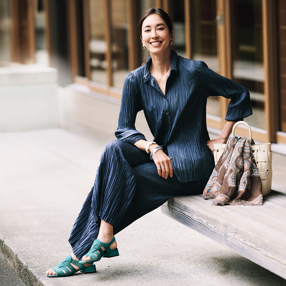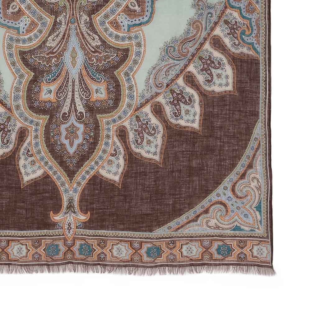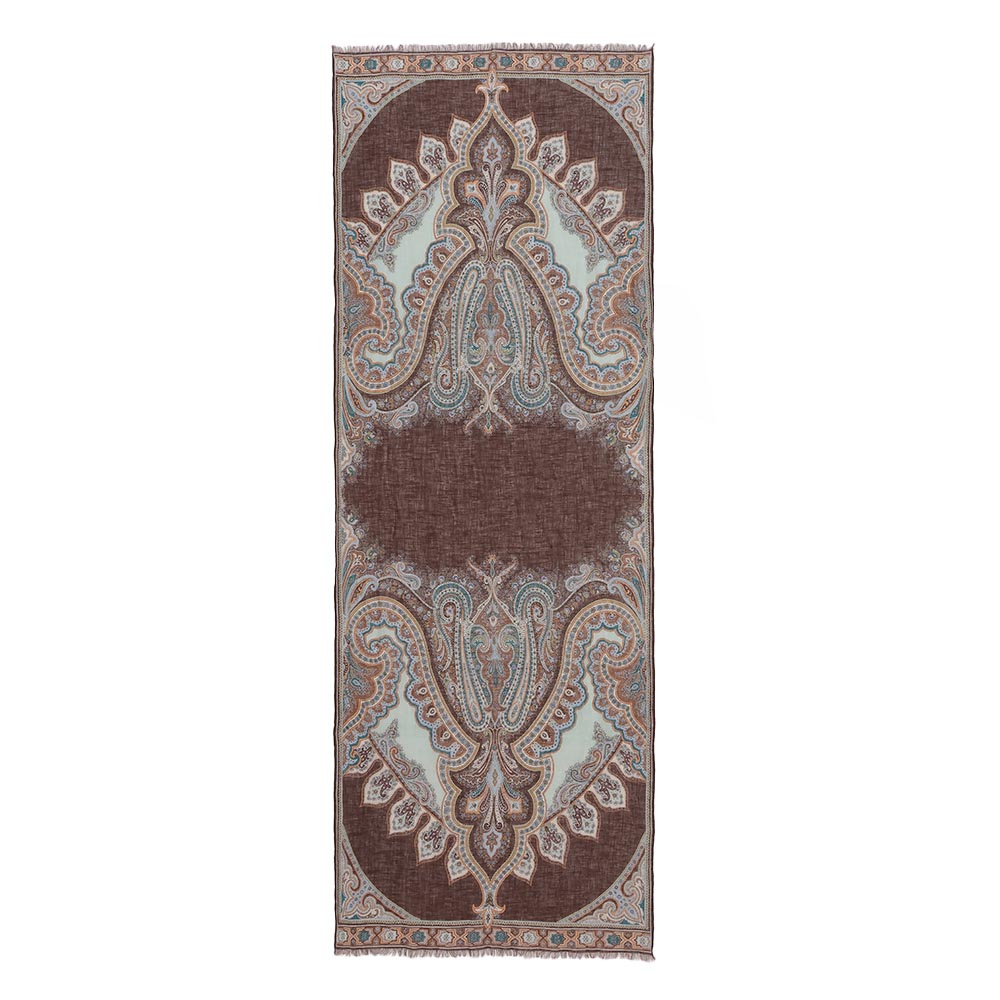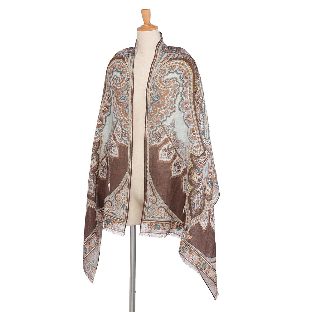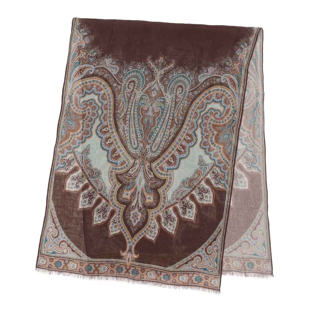 洗練を纏い、週末のエスケープへ日々の喧騒を離れて向かうショートトリップ。自然やアートで感性を刺激する旅のお洒落は、リラックス感がありながらも洗練された落ち着きが欲しいもの。着心地と品の良さを両立した、感度の高い旅カジュアルをご提案。美しい絵画を纏うように…緻密なペイズリー柄を堪能春夏の旅のワードローブにワンランク上の華やぎと利便性をもたらす、リネン素材の大判プリントストール。ひと巻きでエレガントに見せてくれる絵柄の美しさに拘って厳選した新柄は、ペルシャの文様や建築から着想を得たアーカイブプリントをペイズリー柄に再構築したもの。DAMAコレクションが信頼を寄せる「BINDA」社製プリントならではの精緻な美しさが存分に発揮されています。ブラウンを基調にターコイズやオレンジを配したイタリアらしい感性が薫る多色使いはどんな装いにもなじみやすく、朝晩の冷えこみや冷房対策にはらりと纏うだけで見違えるほどリュクスな魅力が漂います。≫ POINT均整の取れたペイズリーの絵柄が広がるので、どこで巻いても美しい一枚。両端フリンジ仕上げで優しげな表情に。