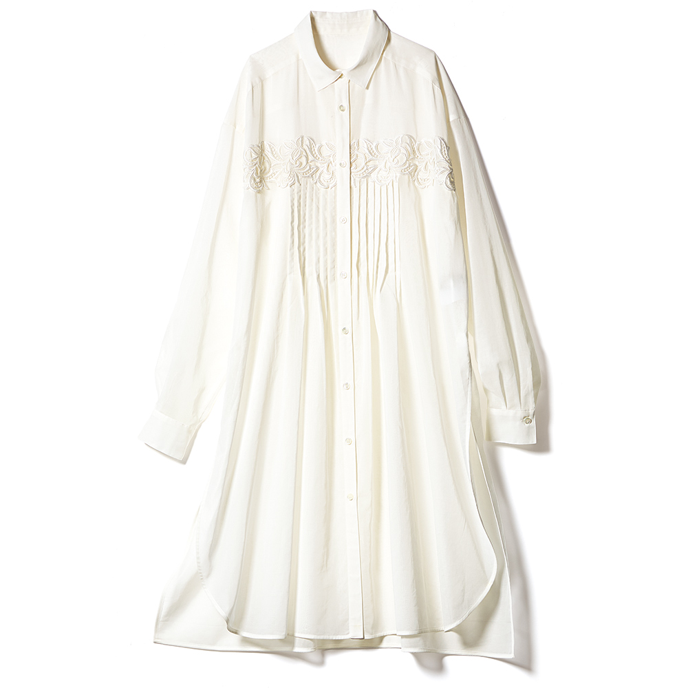 爽やかな初夏の風を感じて透き通る風、光を増す空が教えてくれる、夏の予感。空や海、花々の彩りを軽やかに纏えば、涼風と共にどこへでも行けそうです。たなびく裾に宿るのは大人のエレガンス風と戯れる裾に心も躍る、上品な透け感のコットンオーガンジー素材のロングシャツです。シアー素材は今や定番ですが、シャリ感のあるナチュラルな清涼感を求めるならやっぱりコットン。さらに大人の華やぎを添えるため、胸元にはリーフモチーフの爽やかなエンブロイダリーレースを。繊細なメッシュと重厚感のあるステッチのコントラストも、ラグジュアリーな美しさにあふれています。