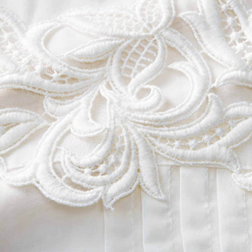 レース下と背ヨーク下にピンタックを寄せたふわりとした分量感、両サイドのロングベント、前後差をつけた裾など、ディテールへの拘りも優雅な躍動感となって周囲の視線を引きつけずにはおきません。≫ POINTリーフ柄の日本製レースもコットン。大柄で立体的ゆえに、コットンオーガンジーにのせたときの存在感はひときわ。