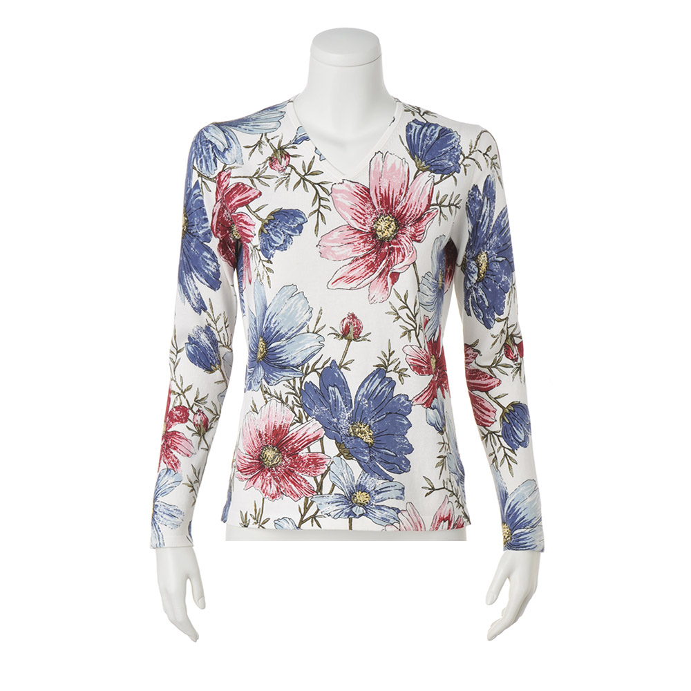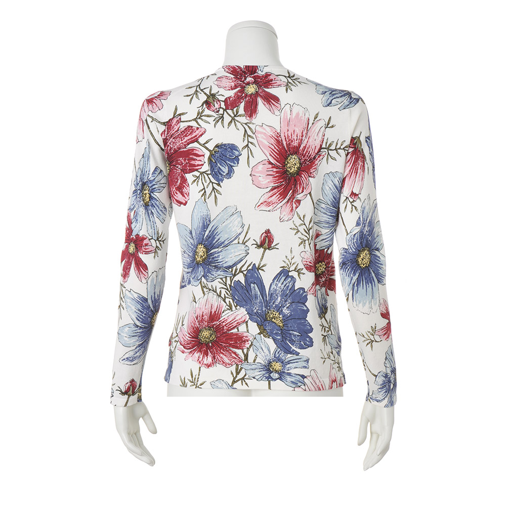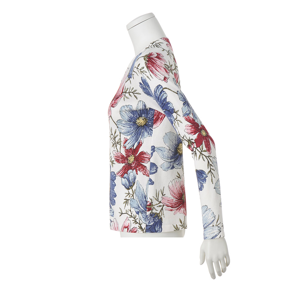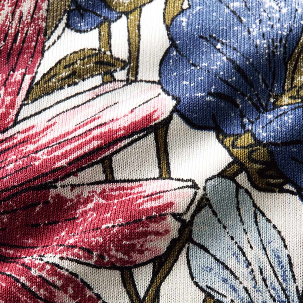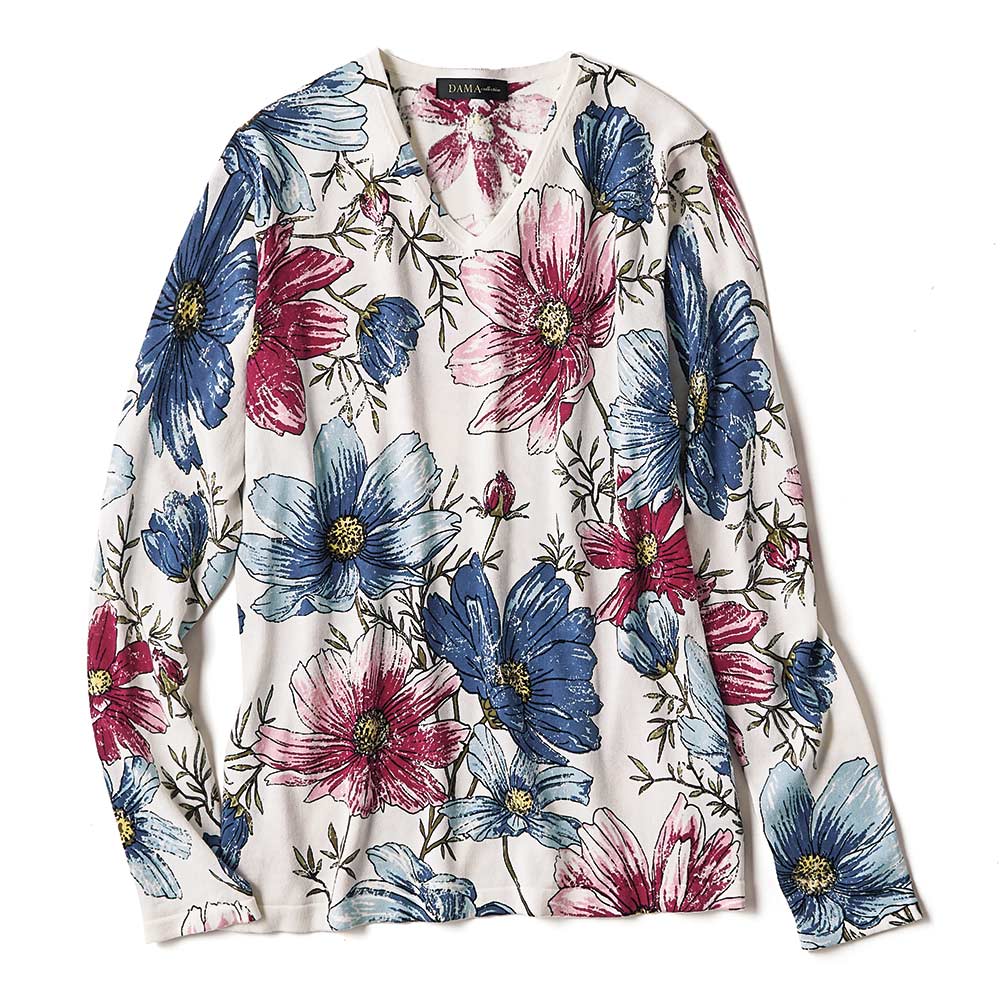 花笑みを誘う美柄プリントニットパッと華やかな存在感を放つプリントトップスも、デニムパンツとならワンツーコーデで簡単なのに失敗知らず。デニム合わせを意識したカラーリングで、着こなしの完成度も自然と高まります。一番の拘りは、肩から袖付けにかけてモチーフを極力途切れさせないよう、肩線と袖付けを接ぎ合わせた状態でプリントしていること。
