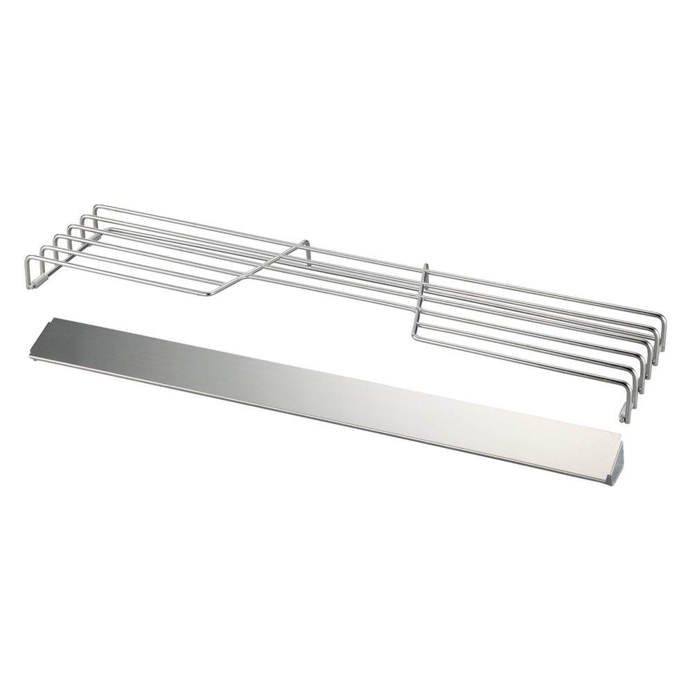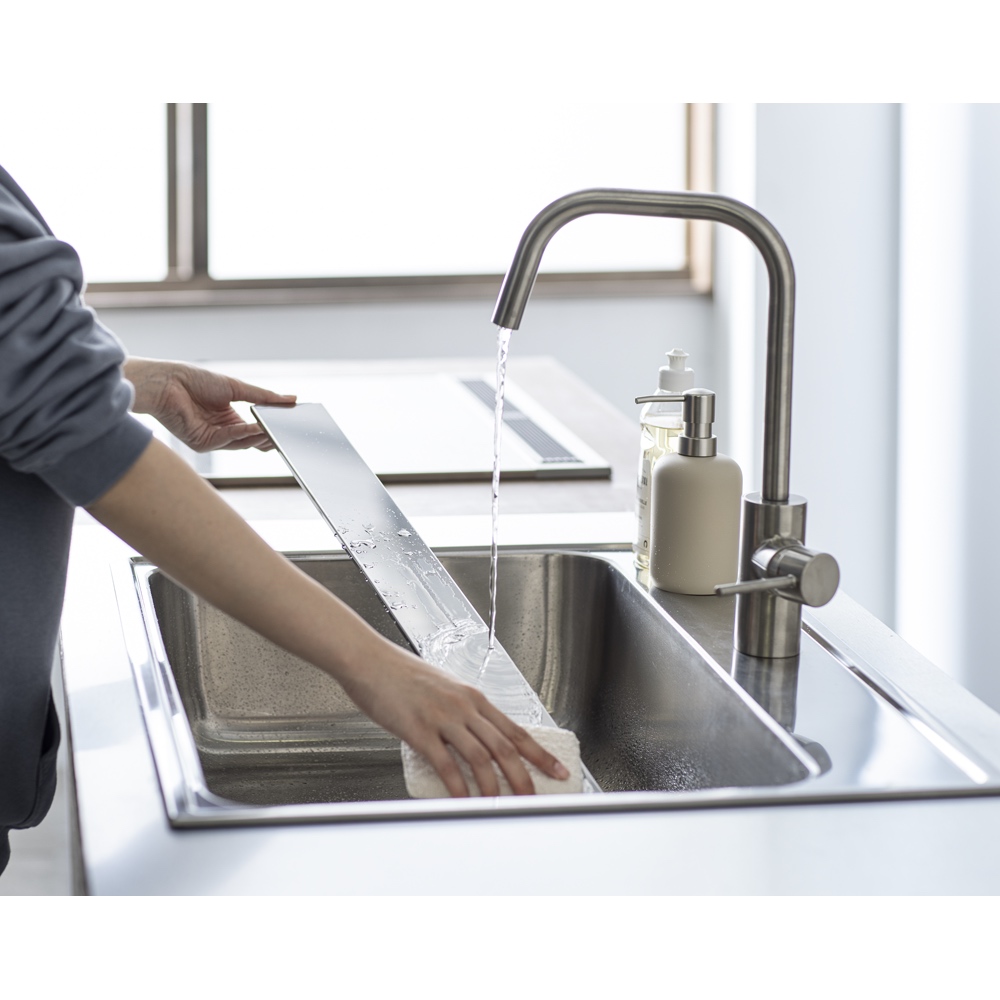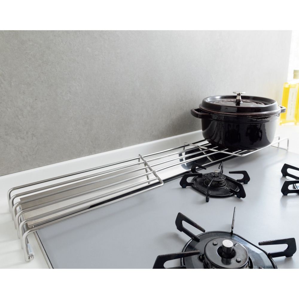 コンロ奥を有効活用できる排気口カバー付きのコンロ奥ラック。まるで作りつけのような一体感と頑丈さが魅力。これ一つでコンロが驚く程すっきりします。ステンレスのモノづくりが得意な燕三条製です。コンロ奥のデッドスペースを有効活用できるディノス企画のコンロ奥ラック「コンロ奥のデッドスペースをもっと有効活用したい!」そんな方におすすめしたい、耐荷重20kgもありとっても頑丈なコンロ奥ラックです。さらに「グリル排気口が汚れちゃうのをなんとかしたい!」という方におすすめの、排気口カバー付きをご用意。煮込み途中のお鍋や洗う前のフライパン、置き場に困るケトルの置き場としても大変重宝します。スタイリッシュなデザインでどんなテイストのキッチンにも合い、景観を損ねません。 汚れやすい排気口をきれいに保てる排気口カバー付き調理中、避けることのできない油ハネや調味料のハネから排気口をしっかり覆ってガード。お手入れしにくい排気口を清潔に保てます。頼れる耐荷重20kg!重たいお鍋や大型のフライパンも難なく置けます耐荷重はなんと20kg!極太の直径6mmのワイヤーを使用し、食材の入った重たい鍋や人気のホーロー鍋、直径30cmの大型フライパンも難なく置けます。すべての部材に、水回りアイテムによく使われる、サビに強く耐蝕性・耐久性に優れた18-8ステンレスを使用。18-8ステンレスは、機械の耐久部品等にも使われるほど、ステンレスの中でも錆びにくい素材のため、濡れたままのツールや高温のお鍋を置いても大丈夫。仮置きスペースを作ることで、空いたコンロで次の料理を作れ時短にも。コンロの口をふさがず、魚焼きグリルもそのまま使えますガスコンロからの鍋の上げ下ろしがスムーズな高さ設計で、サッと移動が出来てストレスフリー。本体は排気口をふさがないワイヤー仕様なので、魚焼きグリルを使用する際も、いちいちラックを動かす必要がありません。ワイヤーの交差部分に段差がないのでお手入れしやすい!ガスコンロのお手入れをする時も、サッと動かすだけなので邪魔にならずお手入れ簡単。さらに、ワイヤーの交差部分は段差がないので、溝に汚れが溜まったりすることもありません。手軽に洗える排気口カバー排気口カバー付きのタイプは、排気口カバーを取り外せるため、油汚れなどが気になったときにサッと洗える点もポイント。本体は18-8ステンレス製でキズやサビに強いので、汚れが気になったらシンクで丸洗いもでき、永くお使いいただけます。3口コンロの奥もちゃんと使える設計に鍋のラインに合わせたデザインで、3口コンロの奥でも大き目の両手鍋やフライパンがラックに当たらずに使えます。サイズは60cm用と75cm用の2サイズ展開。60cm用は幅62cm以内、70cm用は幅76cm以内のビルトインコンロ・IHクッキングヒーターに対応可能です。コンロの幅に合わせて選べるので、小さすぎたり大きすぎたり…ということがありません。