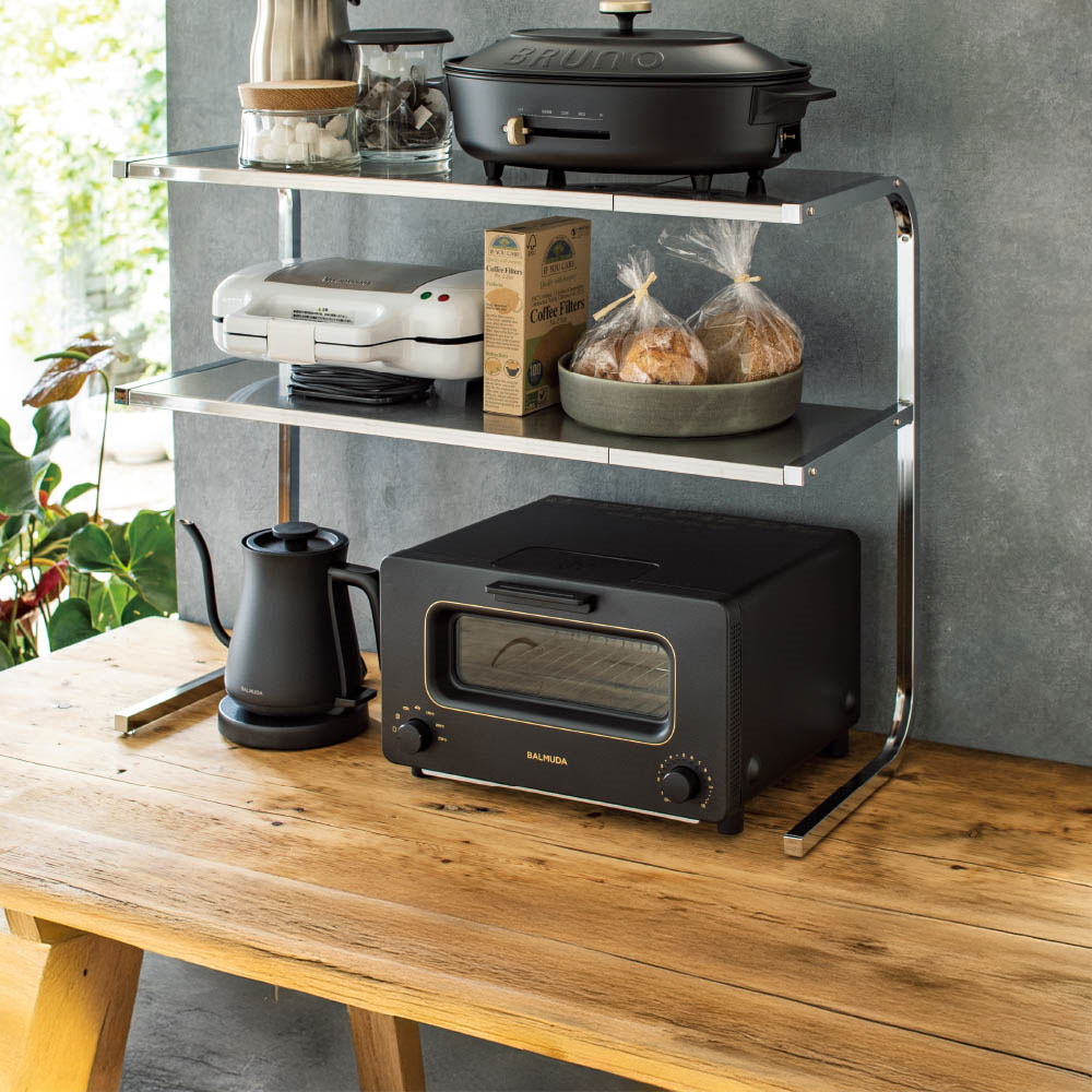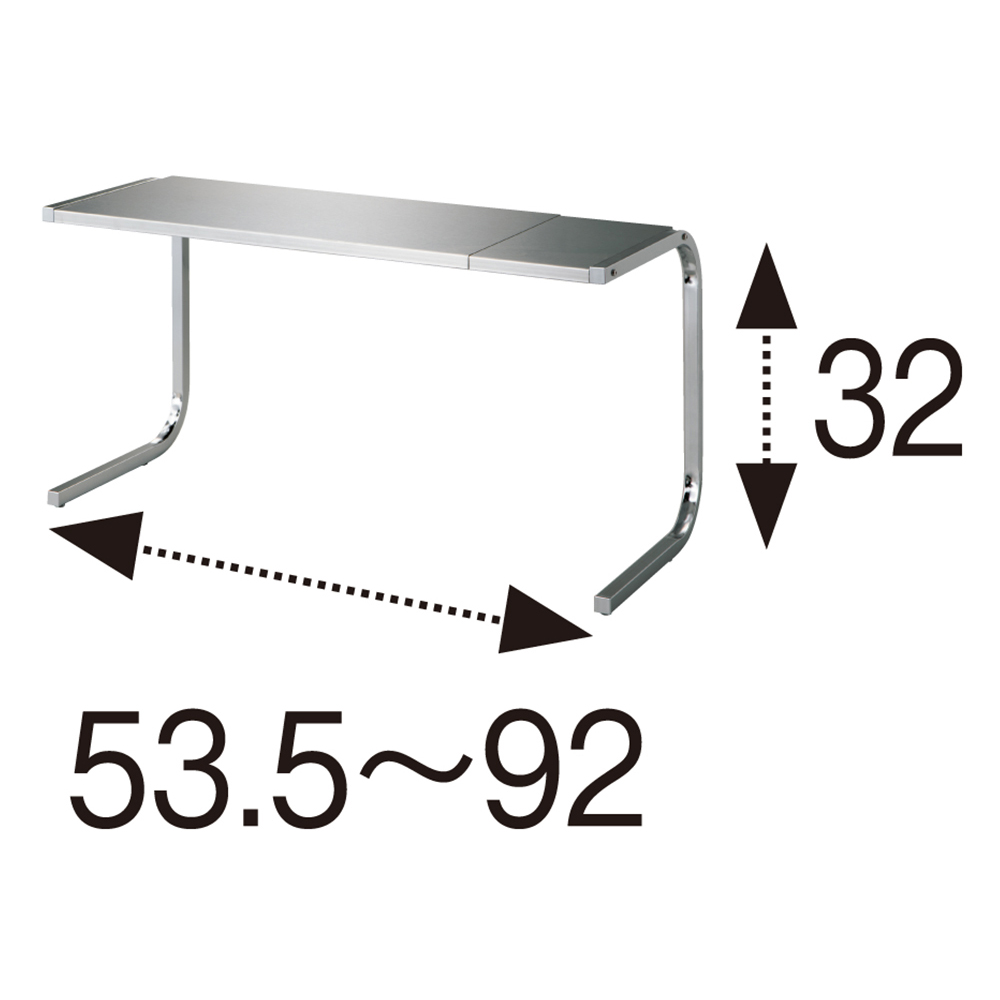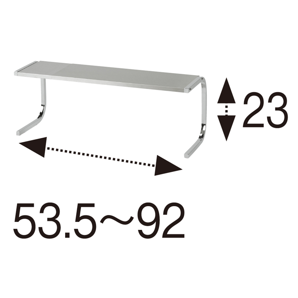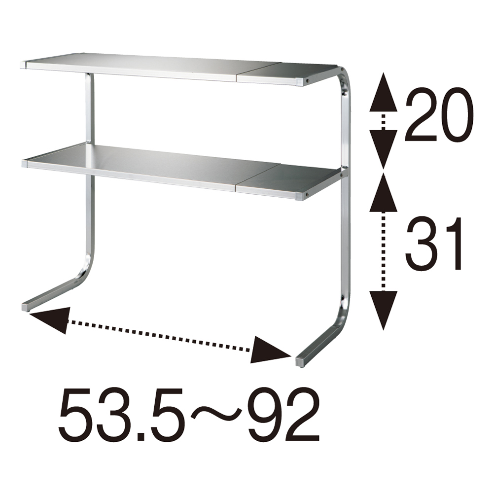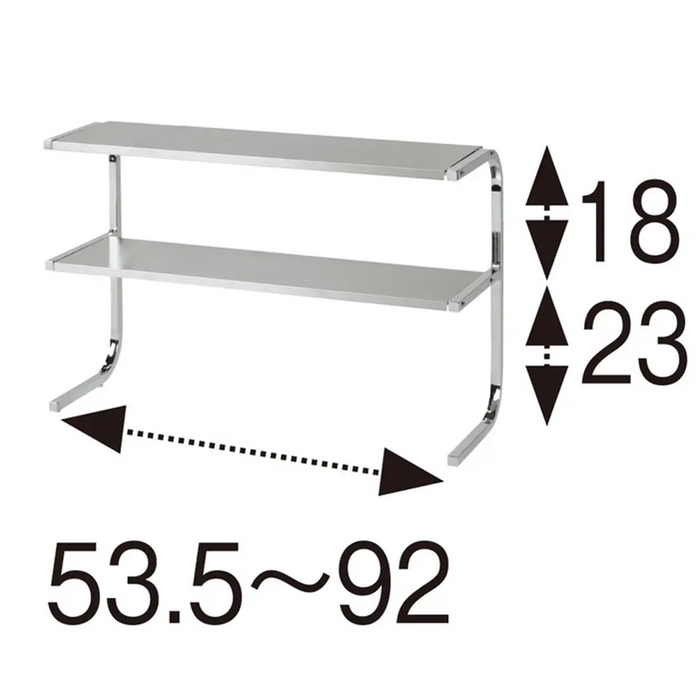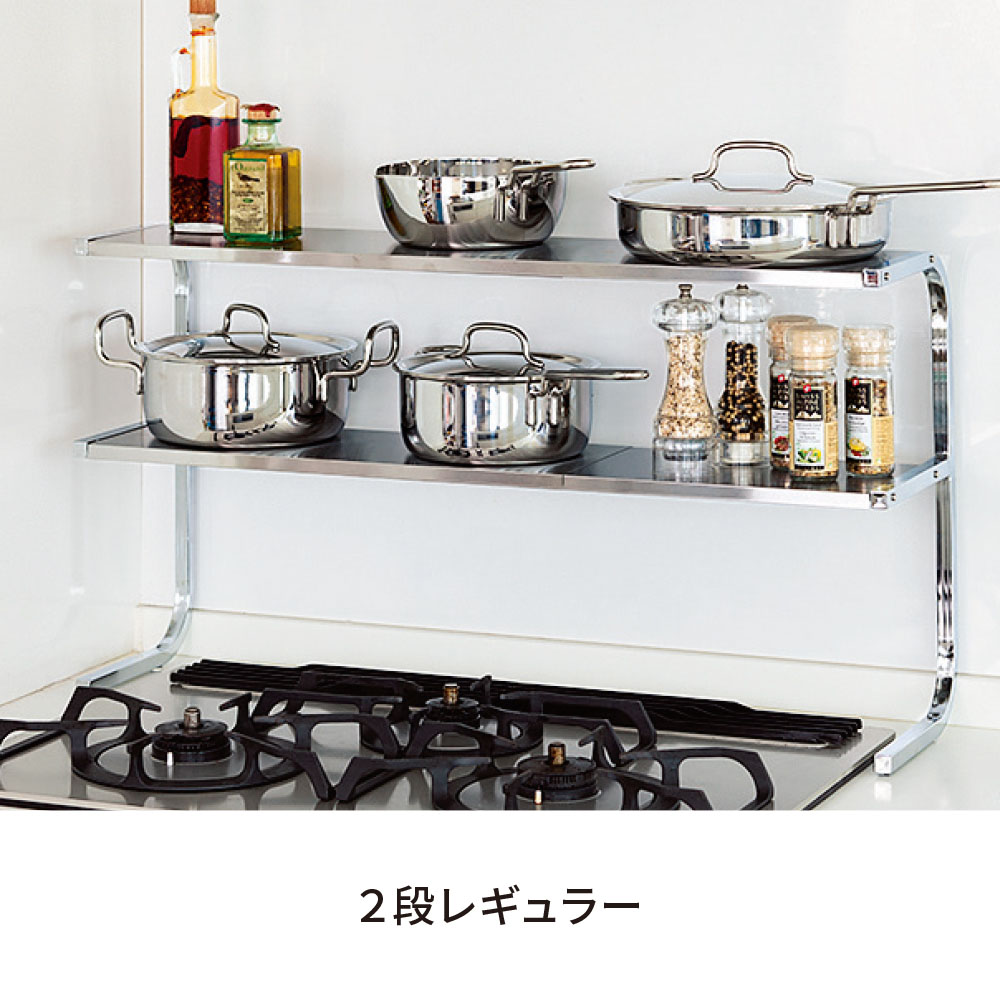 【発売15年目のロングセラー】コの字型だから手前がすっきりで作業もスムーズ。棚板は熱や水に強いステンレス製で、コンロ奥などさまざまな場所で活躍。ステンレスのモノづくりが得意な燕三条製です。どこにでも置けて、横幅は自在に伸縮可能!サイズバリエーションが豊富なうえ、横幅は自在に伸縮可能。棚板は水気や汚れに強く、熱々の鍋も置けるステンレス製なので設置場所を選びません。前脚のないコの字型で手前が広々使えます。幅が伸縮するので、あらゆる場所にフィットします。作業スペースでシンク上に置いてコンロ奥に置いて作業スペースで前脚がないのに耐荷重は12kg!2段タイプは耐荷重合計12kg!