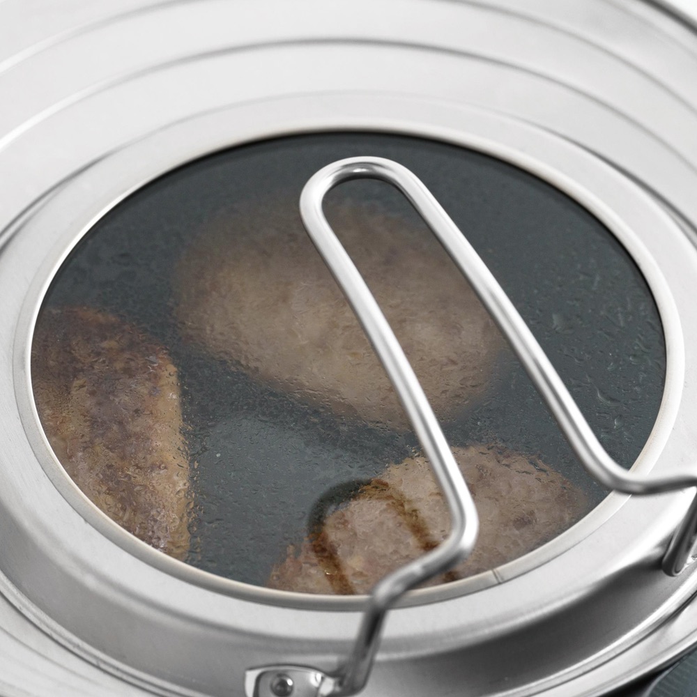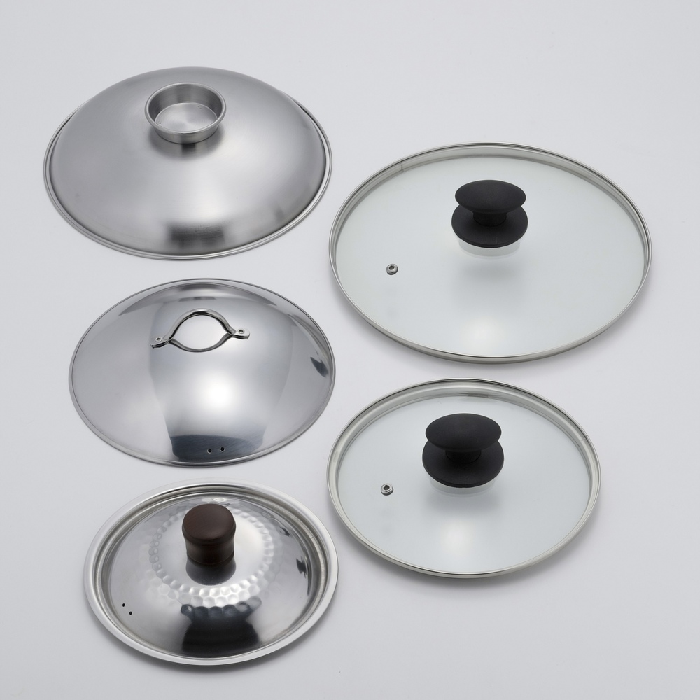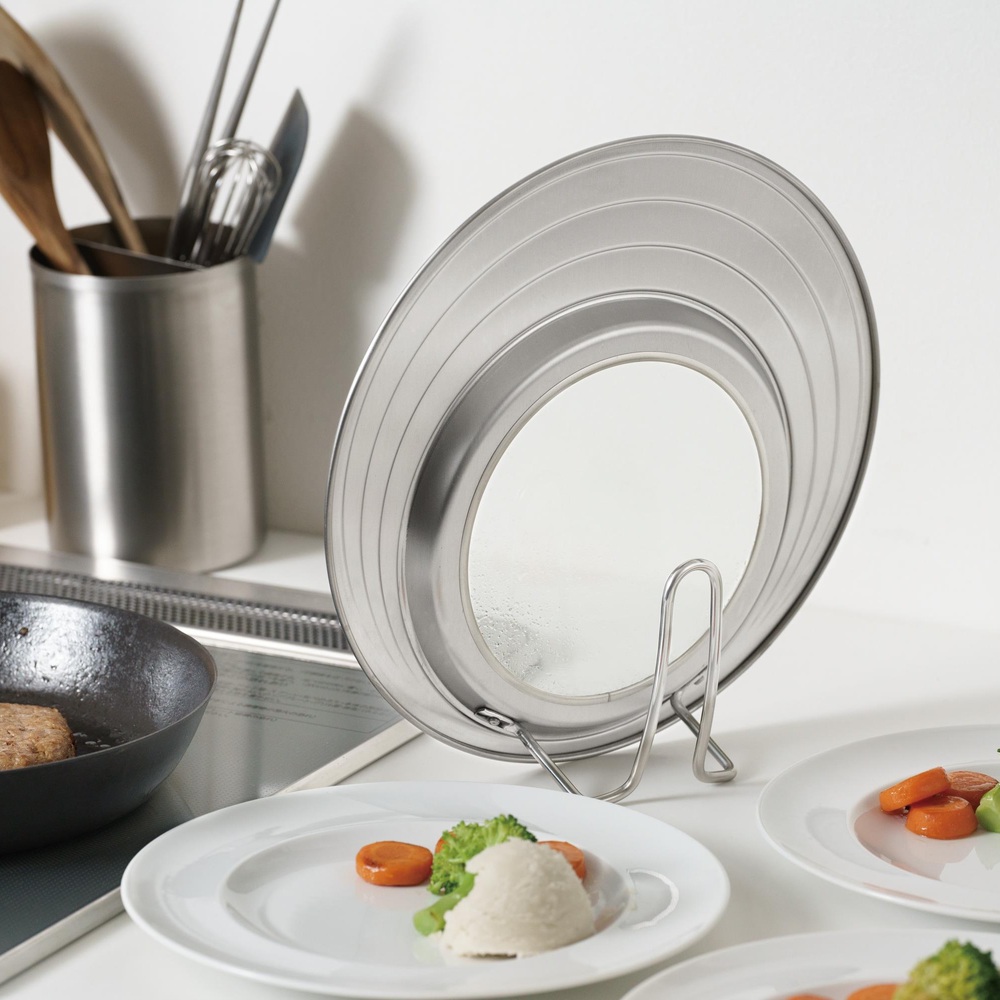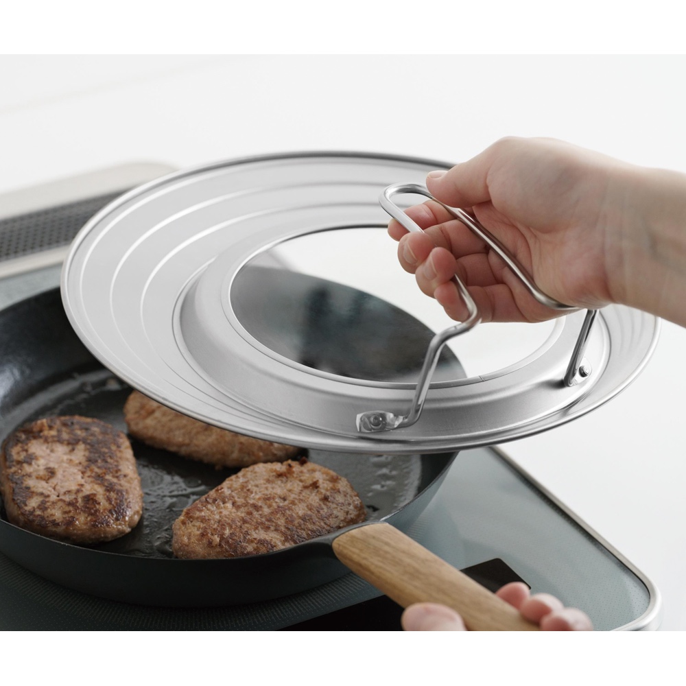 1つで4サイズのフライパンに対応!あったら嬉しいが実現!の画期的な蓋。ハンドルまでステンレス製です。1つで4サイズのフライパンに対応!直径20・22・24・26cmのフライパン・鍋で使えるよう、2cm間隔で溝が施されています。それぞれのサイズに合うように段差が施されているので、ズレる心配もありません。複数のフライパンや鍋と共有して使えるので、フタを何個も持たずに済むのが本当に便利です!サイズ違いの蓋を収納しておく必要がないので、収納スペースもすっきりします。スタンドも兼ねたハンドルで調理がスムーズアール付きのハンドルは握りやすく、自立するので使わない時は立てて置いておけるのも便利なポイントです!調理中にサッと立てることができ、置き場所に困りません。蓋を置くためにスペースを空けずに済むので、調理がスムーズに進みます。ハンドルは本体と十分な距離があるので開閉の際にうっかり指が触れる心配が少なく、さすが家事問屋の使いやすさです。食材の様子が確認しやすいガラス窓タイプフタには直径約15cmのガラスの窓があり、調理中の食材の様子が確認できます。蓋の開閉が減り、調理温度を保ちやすいというメリットも!どんなフライパンにも合わせやすいすっきりとしたデザインガラス窓以外はステンレス製なのでサビに強く、見た目もすっきり美しい。重さは約380gと軽すぎず重すぎず、立てた状態でも安定します。