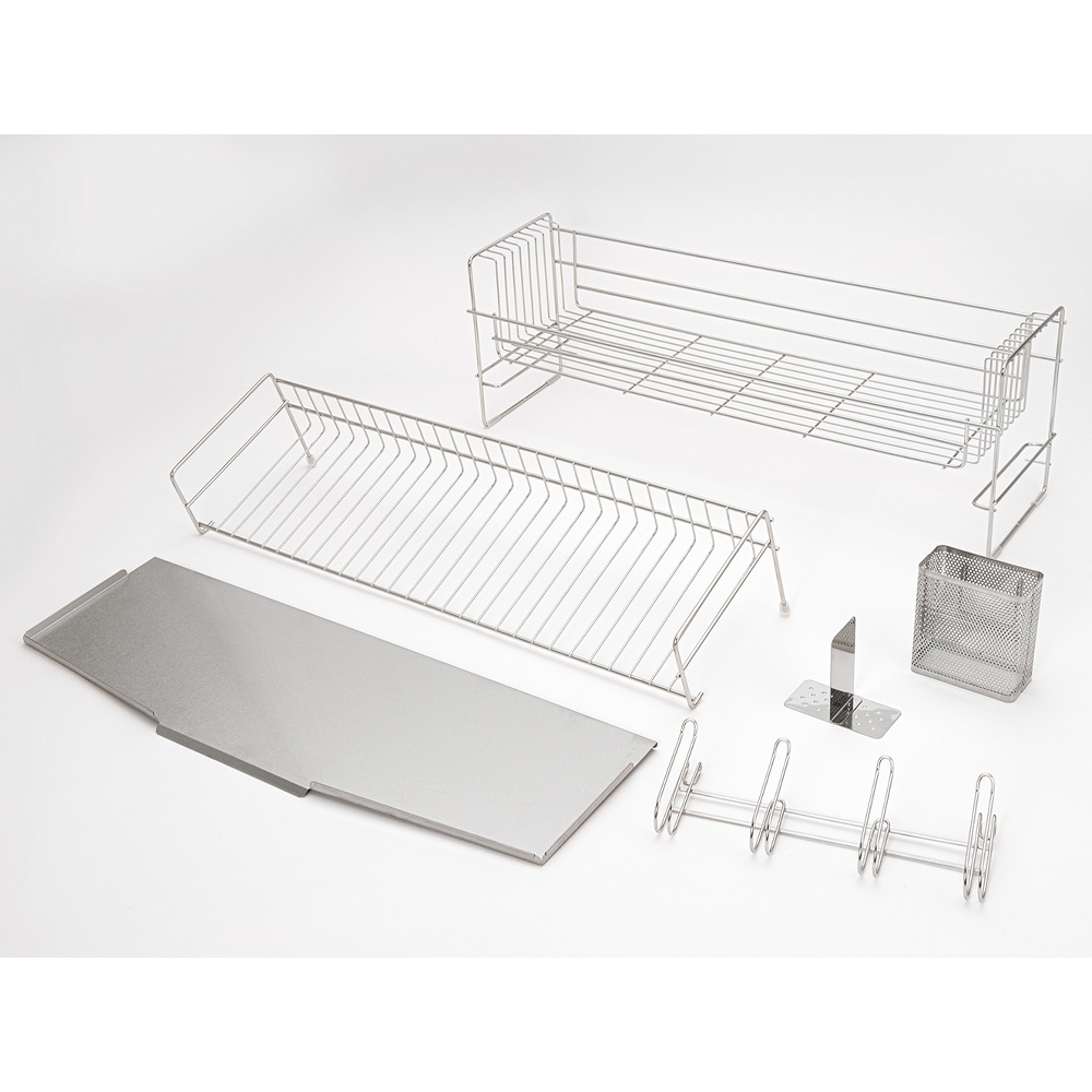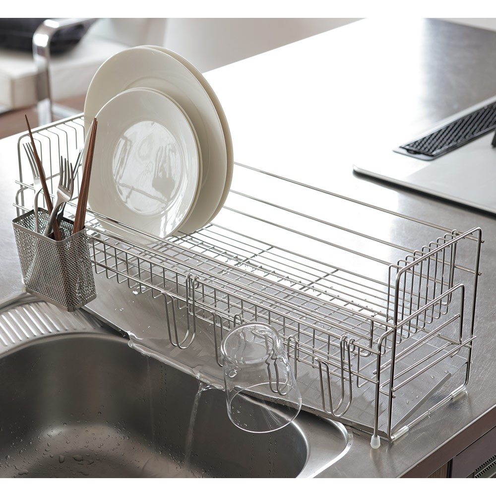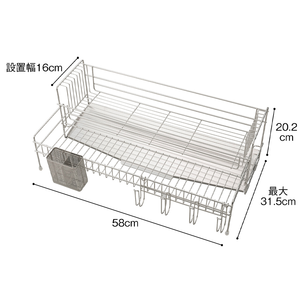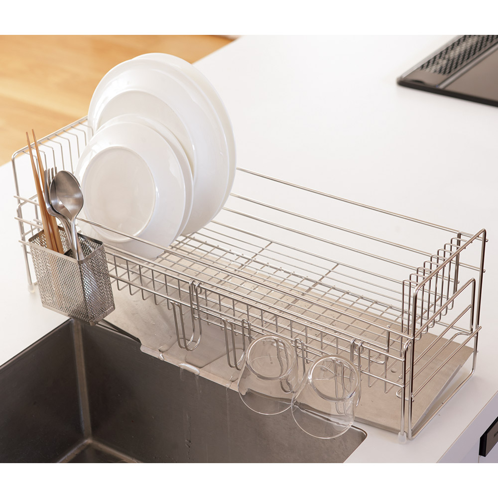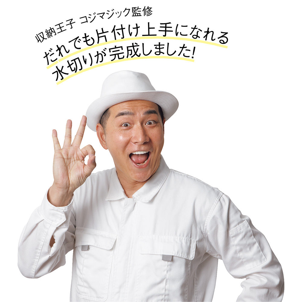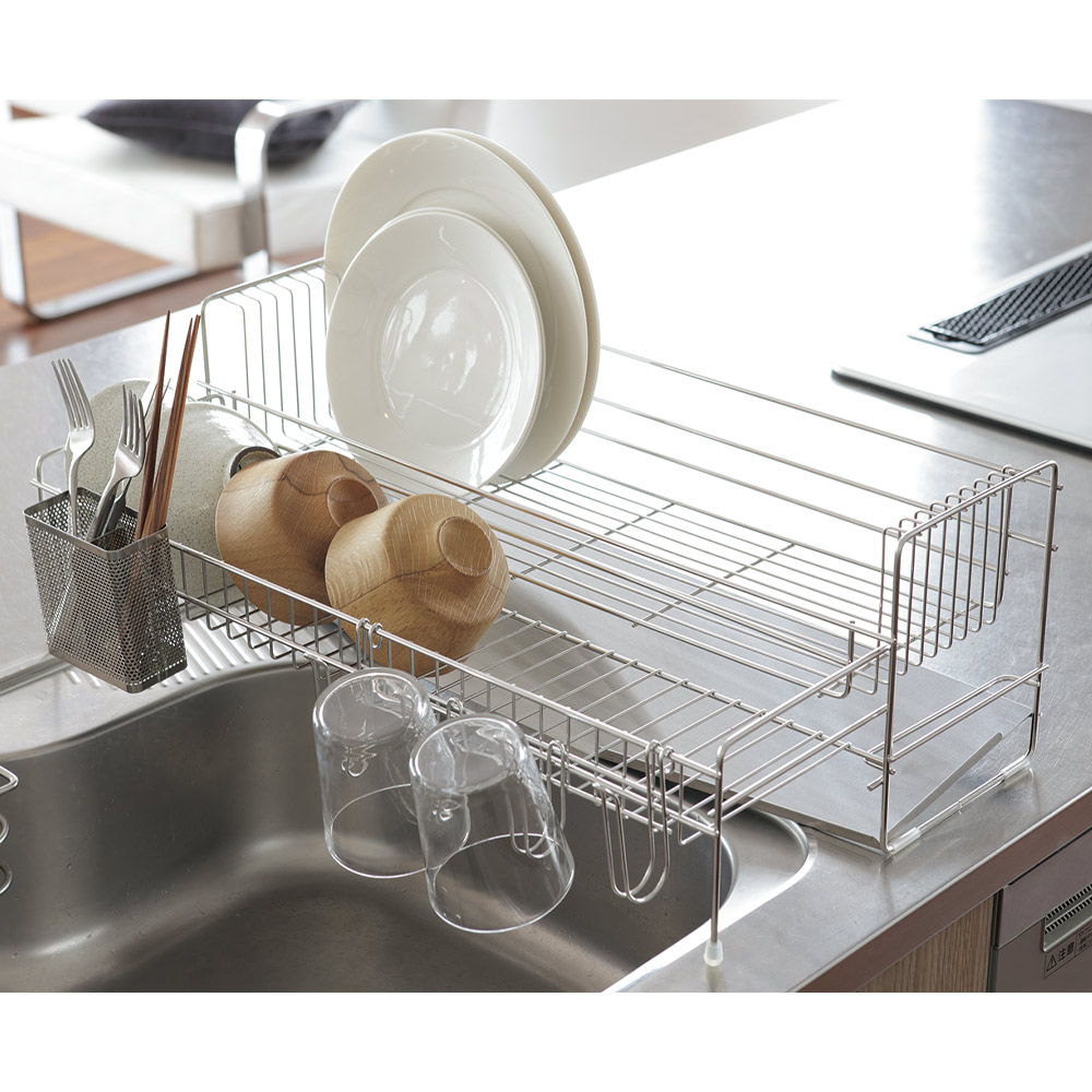 ※ご注意ステンレス部分にはキズ防止用のフィルム状保護シートが付いている場合があります。一度剥がしてしまいますと、ご返品をお受けできませんので十分ご注意ください。2023年11月8日(水)放映フジテレビ系「ホンマでっか!?TV」でご紹介!収納王子コジマジック監修!収納メソッドが詰まった水切り。食器をたくさん乾かせて、洗い物も片づけもスムーズに。キッチンが片付く!コジマジック式伸縮スリム水切り伸縮式の水切りで設置幅16cmととってもコンパクトなのに、広げると大容量に!かごを広げると家族4人分の食器を置けます。上のかごにお皿が乗った状態でも下のかごを引き出せる設計になっていてかごを閉じた状態で洗い物を始めても、食器の量が多ければ途中で伸ばすことができます。2つのカゴのワイヤーの向きが異なるのがポイントワイヤーがそれぞれお皿やお椀を置きやすい向き・幅になっていて、食器を定位置に収納することができるんです。食器を定位置に置くと作業がスムーズになりますコジマジックさんによると、片付けで重要なのは「物を定位置に戻す」ということ。このメソッドを活かして、食器を定位置に置くことができる設計の水切りになりました。これにより、食器洗いの時に洗う順番やどのようにかごに立てていくかを考えなくても定位置に立てて置くことができるのです。また、食器を分類して置いておくことで、水切りかごから食器棚に収納するときも作業がスムーズに。洗い物の動きを考えているから使いやすいさらに、人が洗い物をするときの動きを考え、シンクで洗ったお皿はタテ向きに、お椀はヨコ向きに置いていく、というのがとてもスムーズで使いやすいんです。お椀を立てて乾かすことで、乾きが早いのもうれしいポイント。オールステンレス製のシンプルデザイン水切り自体の洗いやすさも考え、シンプルなデザインにもこだわりました。見た目にも美しいオールステンレス製で、金属加工のまち燕三条で作られています。全てのパーツをバラして洗えるので、衛生的です。箸立ての底まで洗えますぬめりやすい箸立ての底まで外して洗えるこだわり。燕三条の技術が光ります。