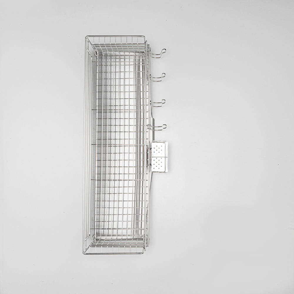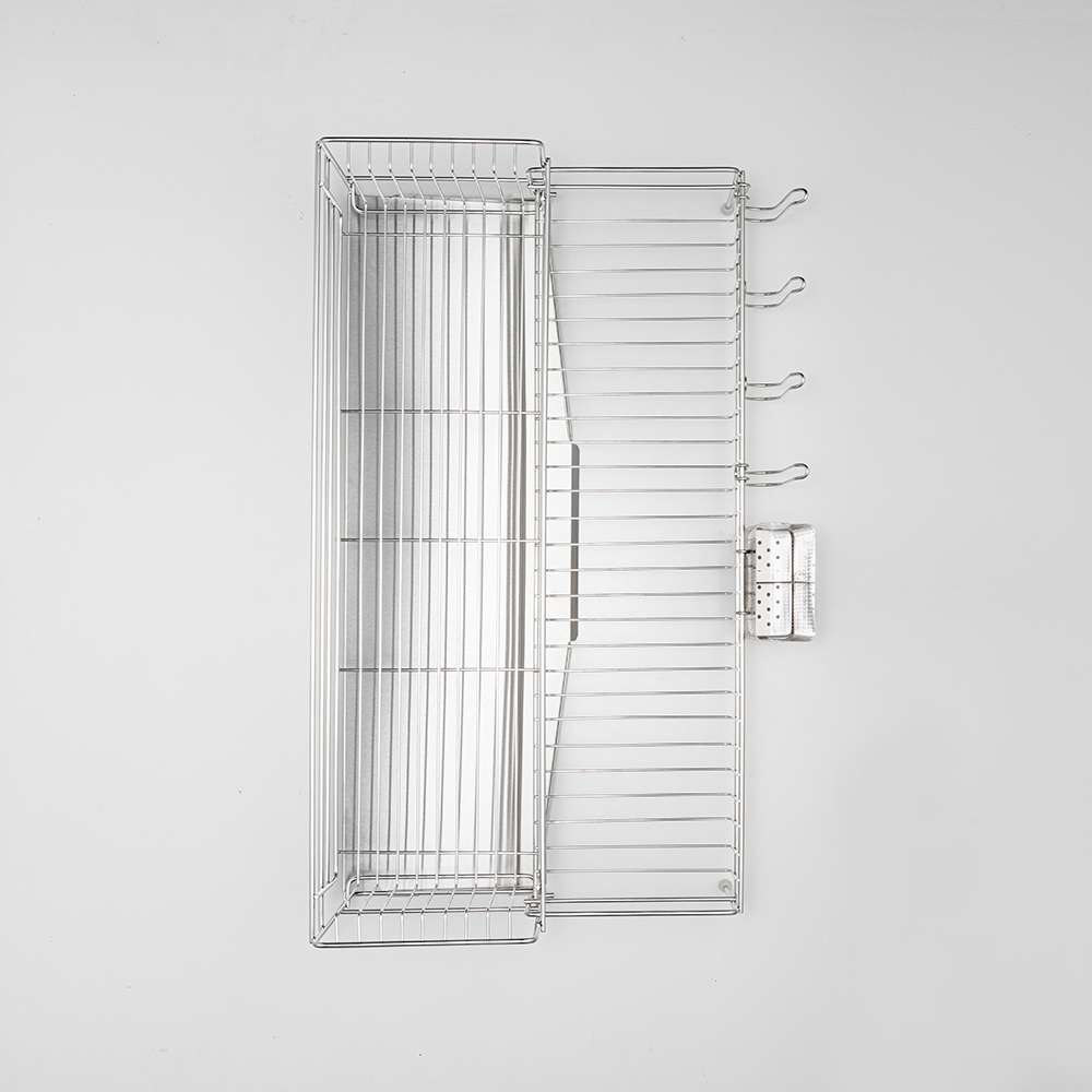 上のかごに食器が入っていても食器が引っかからずに下のかごを引き出せる設計。