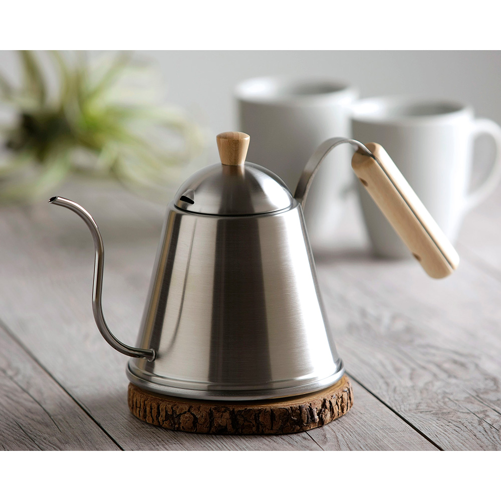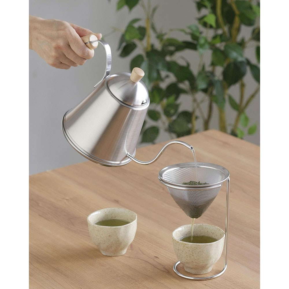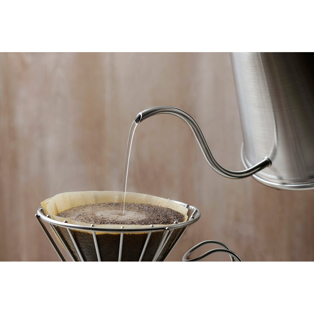 雫のようにポタリポタリ、糸のようにツーっと、微妙なお湯の量が調整できます。超極細6mm径の注ぎ口は、お湯の注ぎ過ぎを防ぎ、こだわり味をブレさせない思い通りのハンドドリップができます。約15cmと長い注ぎ口がドリップに適した温度にお湯を冷まします。金属加工技術でも知られる新潟県燕市から、丁寧に作った至極のドリップポットで美味しいコーヒーを!IH電磁調理器対応。