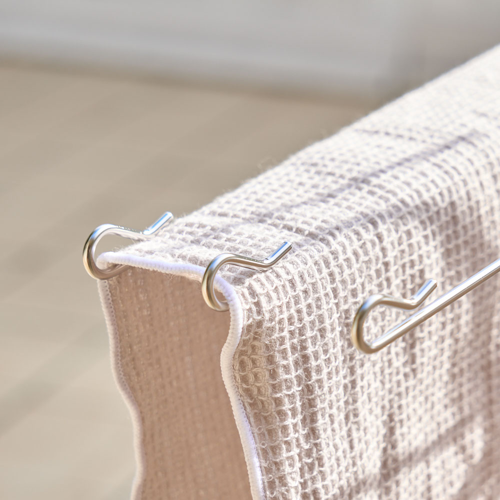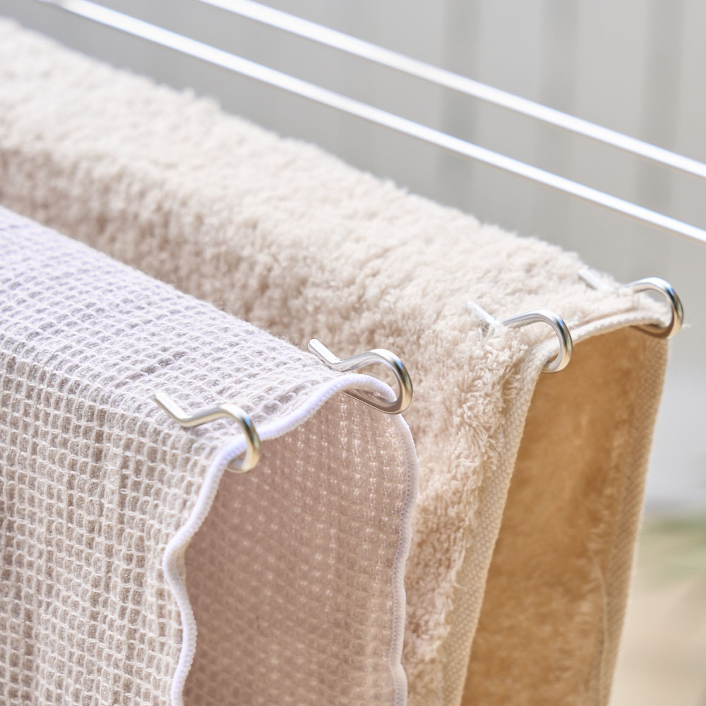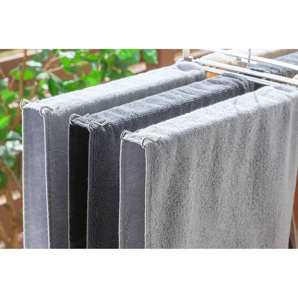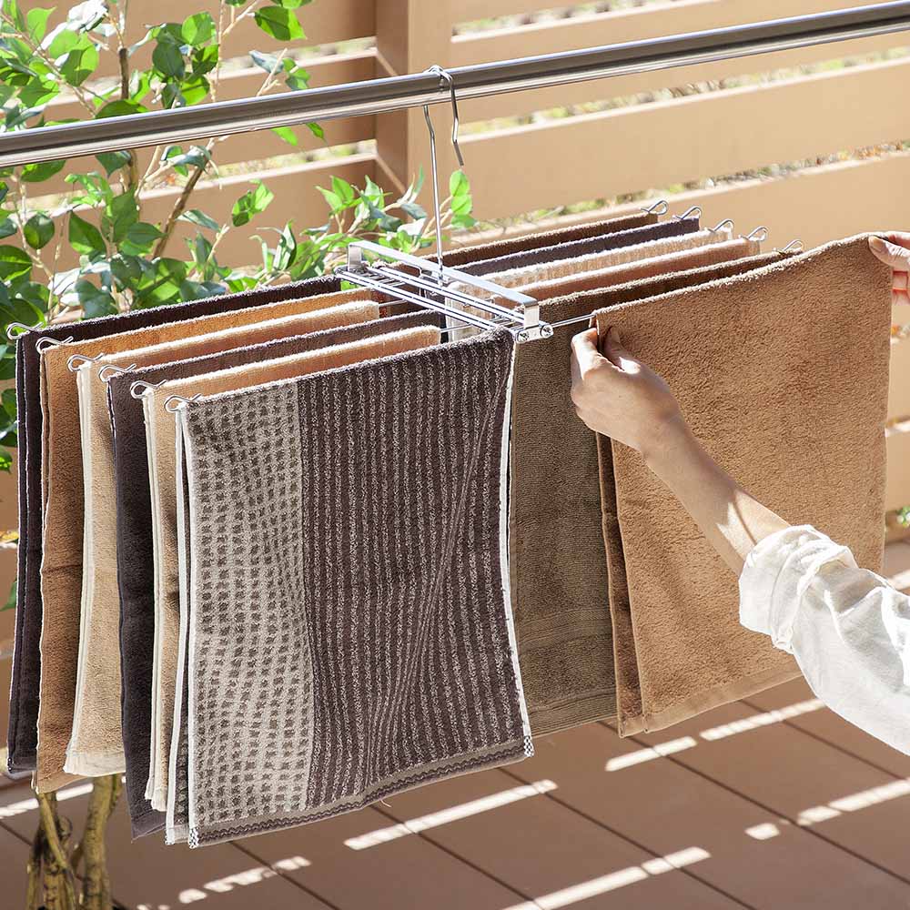 タオル12枚をまとめて干せる、丈夫なステンレス製ハンガー。フェイスタオル幅の仕様。収納時は厚さ約4cmに。