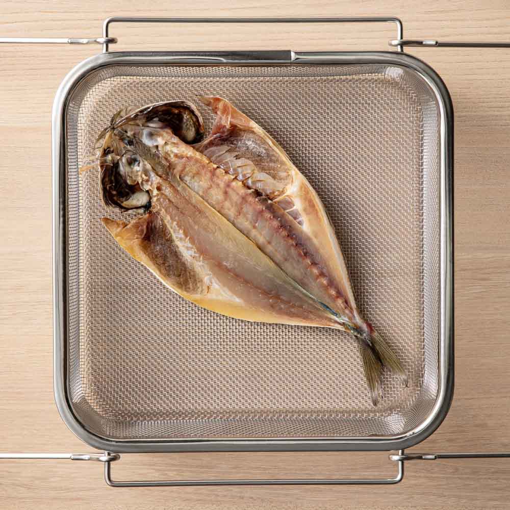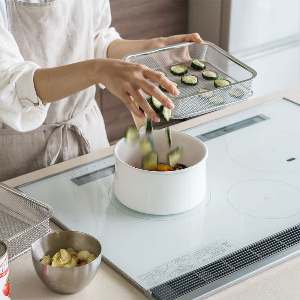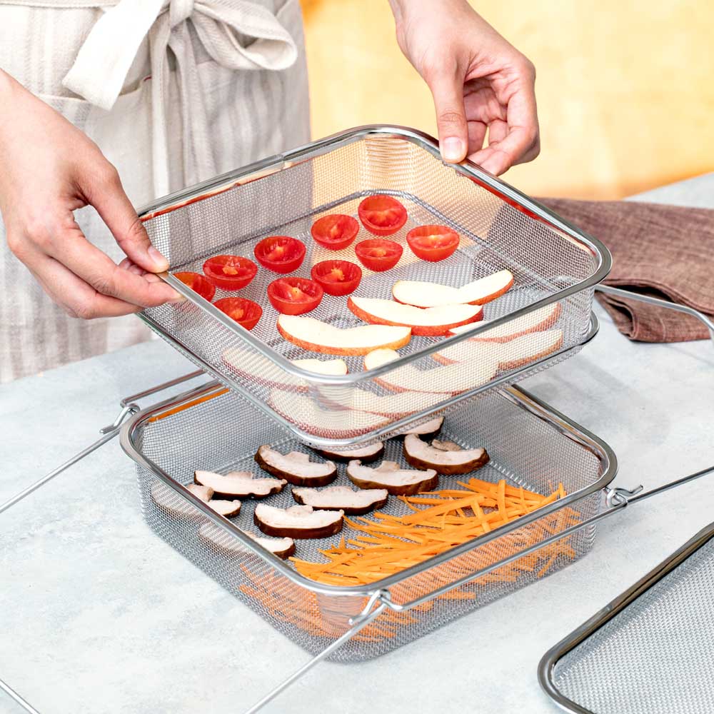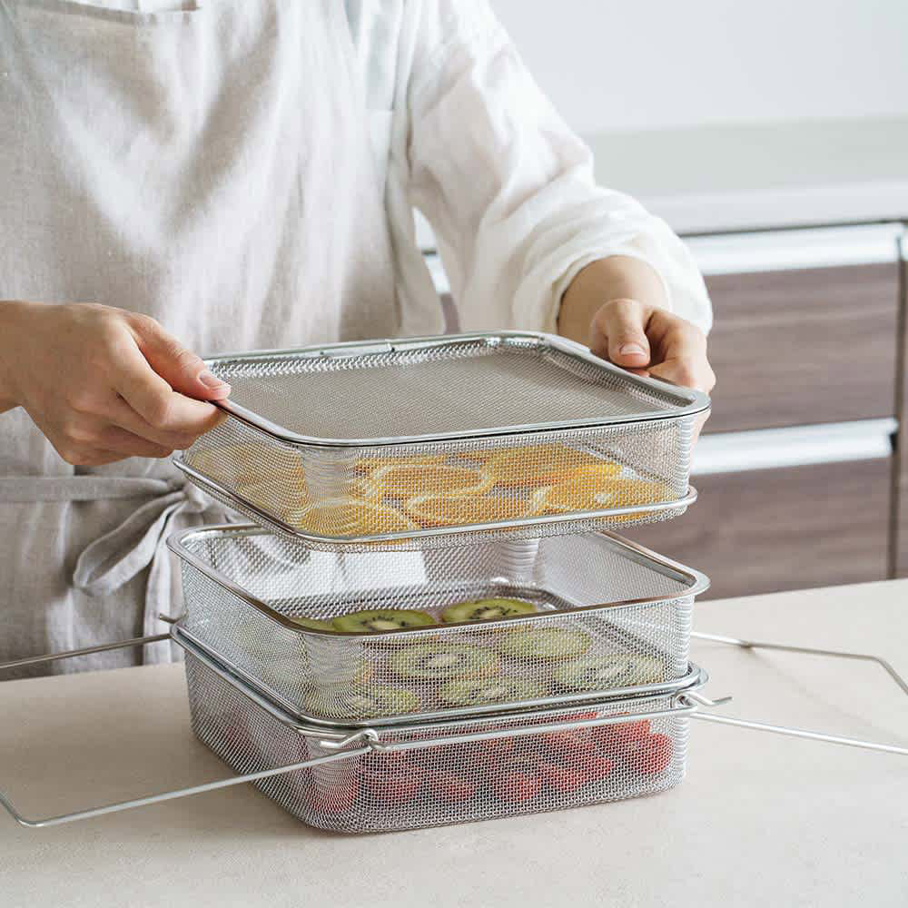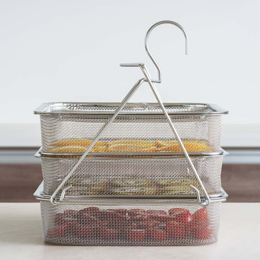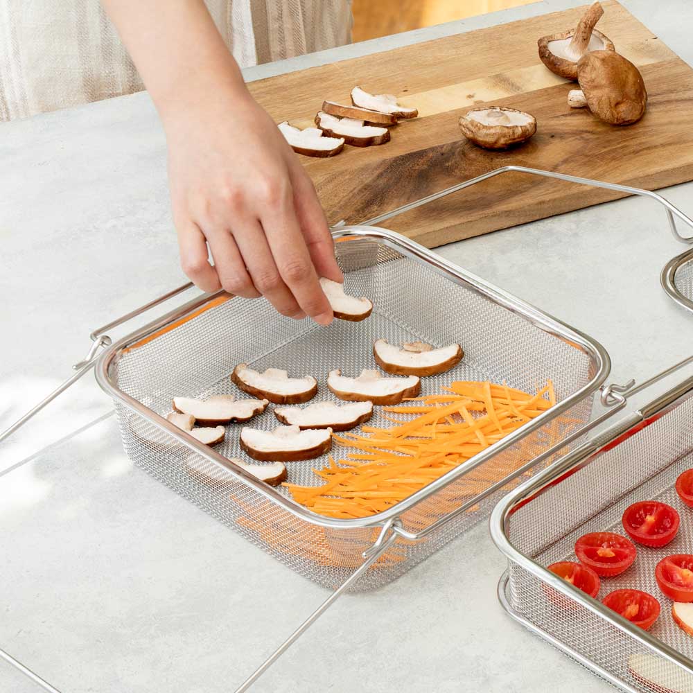 おしゃれで衛生的な干しかごで自家製の干し野菜やドライフルーツを楽しんでみませんか?ステンレス製で丸洗いできるので、汚れやニオイを気にしなくてOK。重ねて省スペースで干せるのも魅力です。半端に残った野菜や果物をムダにせず、旨味と栄養をギュッと凝縮して一石二鳥!フタ付きなのでホコリや虫の侵入を防ぎます。食材が風で飛んでしまうこともありません。別売りのかごを単品で買い足して、最大4段にすることもできます(かごはメーカーサイトにてご購入いただけます)。干しかごのイメージを裏切るスタイリッシュな見た目!容量もたっぷり。ザル1枚は約22cm角の四角形。野菜を干さないときは通常のザルとしてお使いいただけます。ステンレス製でニオイ移りしにくく、丸洗いできるので衛生的。使い方は簡単。ザルを重ねてフックを起こすだけのシンプルな構造です。フックがあるので物干しざおなどに掛けられます。干し網のように手を入れる必要がないので、食材が並べやすい。上から置けるので、すき間なくきれいに並べられます。ストレスなく、作業がサクサクはかどります。ザルは程よい細かさのメッシュ状。風を通しつつも、細かい食材がこぼれ落ちないようにつくられています。水分が抜けているので、火の通りが早く時短にも。生のままとは異なる食感や味が面白い!炒め物に使えばシャキッとした歯ごたえが楽しめます。水っぽくなりがちなキャベツも驚くほどおいしく!他にも揚げ物やパスタ、スープに和え物など、様々な料理に活用できます。野菜や果物、干物の干し方も分かるレシピブック付きなので、次は何を干そうかなと、晴れの日が楽しみになりますね!王道の切り干し大根。できるだけ細く、薄く、表面積が広くなるようにカットすると失敗が少ないです。切り干し大根は戻し汁にも栄養や旨味がたっぷり。みそ汁やスープの具材にもおすすめです。調理例。カットした切り干し大根入りのキーマカレー。干した大根は肉料理との相性が◎。切り干し大根の歯応えがアクセントに。ほかにも干した野菜の活用方法はいろいろ!●野菜のピクルスゆでるなどの下ごしらえ不要で、そのまま漬けられます。干しているので余分な水分が出ず、ピクルス液が野菜にしっかりしみ込みます。●環境にやさしいベジブロス野菜の皮やヘタ、芯などを活用して作る栄養たっぷりの出汁のこと。野菜くずの汚れを落として水分を拭き取ったら、干しかごで乾燥させることで保存性がアップ。通常は新鮮な野菜で作りますが、乾燥させれば必要なときにすぐ使えて便利です。野菜を5種類以上使うと、より深い味わいに仕上がります。