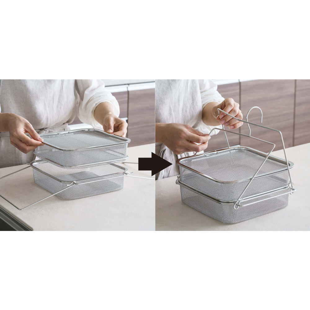使い方は簡単。ザルを重ねてフックを起こすだけのシンプルな構造です。