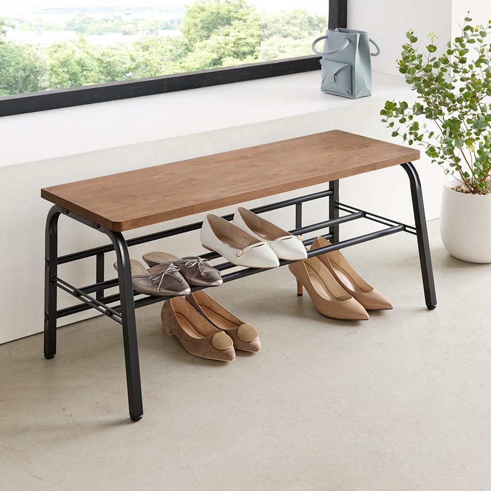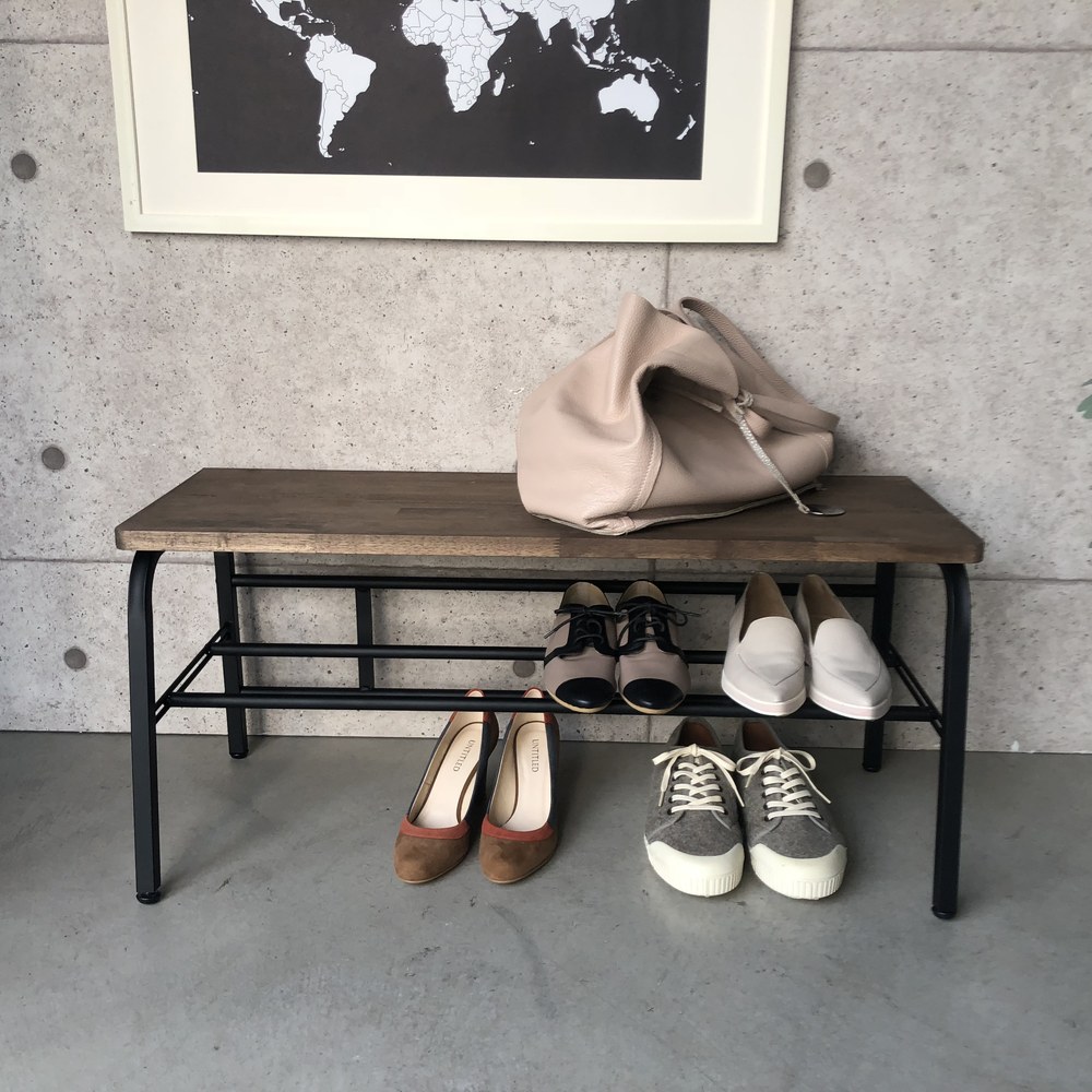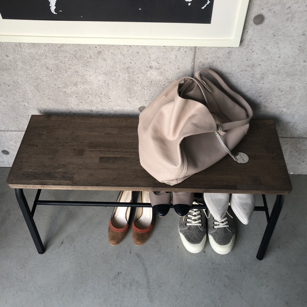スチールフレームに天然木の座面が映えるシックなデザイン。腰掛けたり荷物を置いたり、下段には靴もしまえて、玄関が美しく保てます。狭い玄関にあると便利な、ベンチ。靴を履くときに腰掛けたり、荷物を置いたり。ひとつあると、何かと重宝します。座面は木目の美しいラバーウッド。下段の棚は脱いだ靴の一時置きにも使用できます。天然木が映えるように、フレームは黒でしめて、シンプルシックな玄関ベンチになりました。