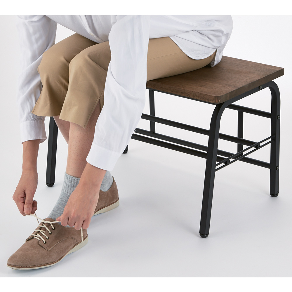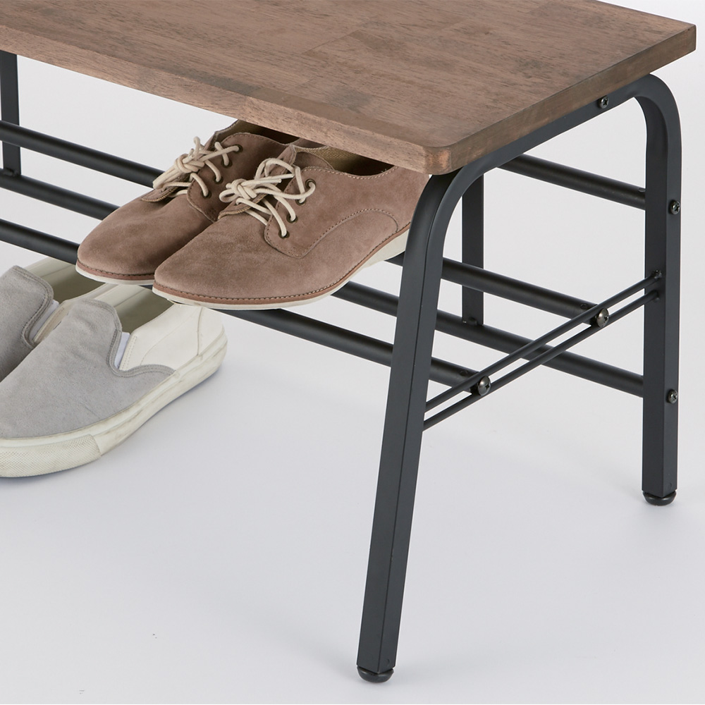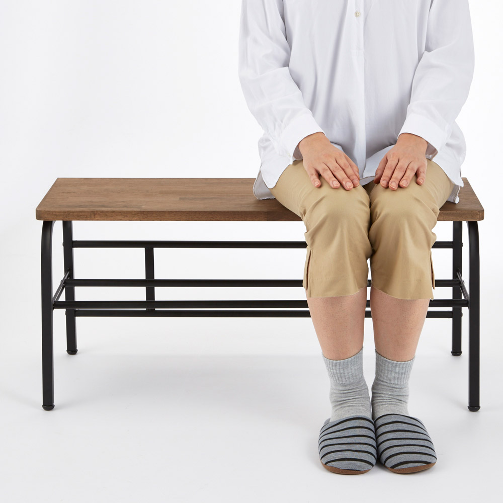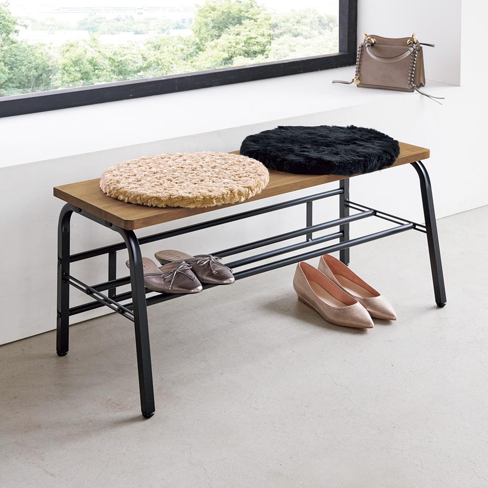 スチールフレームに天然木の座面が映えるシックなデザイン。腰掛けたり荷物を置いたり、下段には靴もしまえて、玄関が美しく保てます。狭い玄関にあると便利な、ベンチ。靴を履くときに腰掛けたり、荷物を置いたり。ひとつあると、何かと重宝します。座面は木目の美しいラバーウッド。下段の棚は脱いだ靴の一時置きにも使用できます。天然木が映えるように、フレームは黒でしめて、シンプルシックな玄関ベンチになりました。