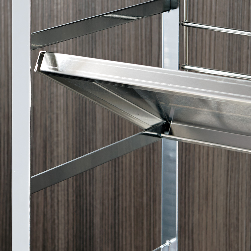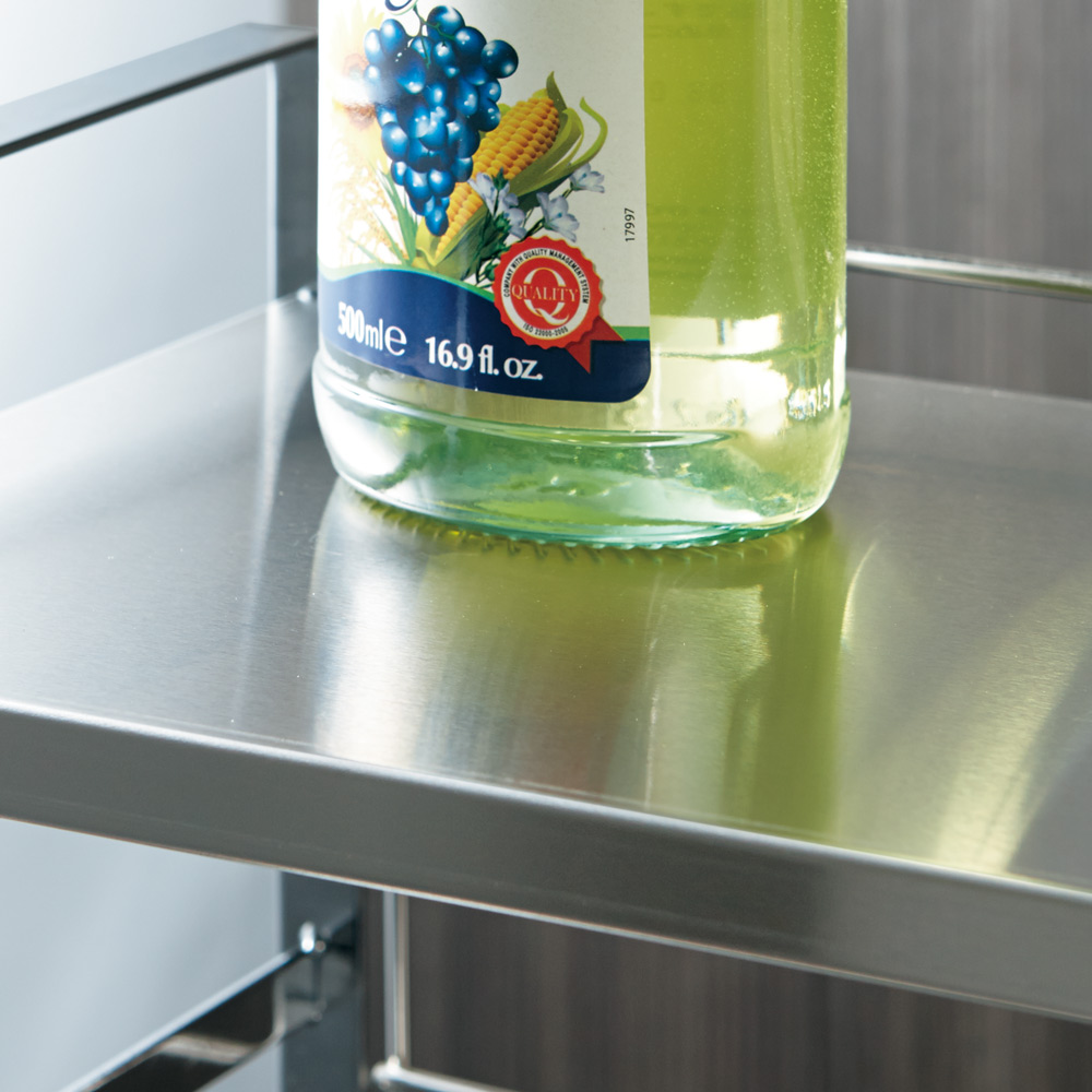 コンロ奥にも設置できるシェルフ。デッドスペースになりがちなコンロ奥のコーナースペースまで立体的に有効活用。1段あたりの耐荷重約20kg!簡単組み立ての頑丈棚サビに強く丈夫なステンレス製ラックは、キッチンカウンターやコンロ奥のスペースなどにぴったり!デッドスペースを利用してたっぷり収納することができます。耐荷重は1段あたり約20kgという頑丈さで、小物や調味料類はもちろん、重たい鍋やフライパンなども気兼ねなく置けるのが魅力。置いた物が取り出しやすいから、お料理もスピーディに仕上がります。調理中のチョイ置きスペースとしても便利にお使い頂けます。置くものの高さに合わせて、棚の高さを選べる5段階調節機能付き棚の高さは、使い勝手に合わせて約10cmピッチ、5段階に調節OK。後ろからの落下を防ぐバックネット、接地面の傷つきを防ぐゴム脚付きで、大事なキッチンを傷付けません。棚板はサイドのフレームに差し込むだけの簡単設置なのに、安定していて横揺れに強いところもうれしいポイントです。金属加工で有名な新潟県・燕三条地域のメーカーが手がけています天板は熱々のお鍋だって置くことができる、清潔で丈夫なステンレス製。サビや汚れや水気にも強く、蒸気の出るケトルや炊飯器のような家電も安心。メンテナンスも簡単です。しっかりと安定感ある作りは、金属加工で有名な新潟県・燕三条地域のメーカーが手がけた証です。