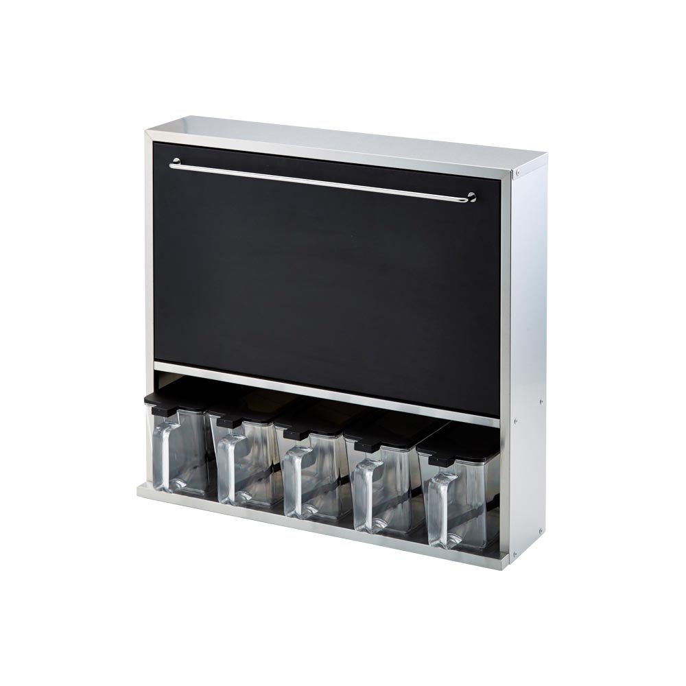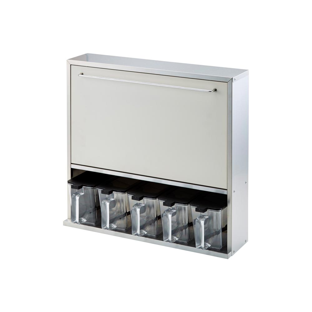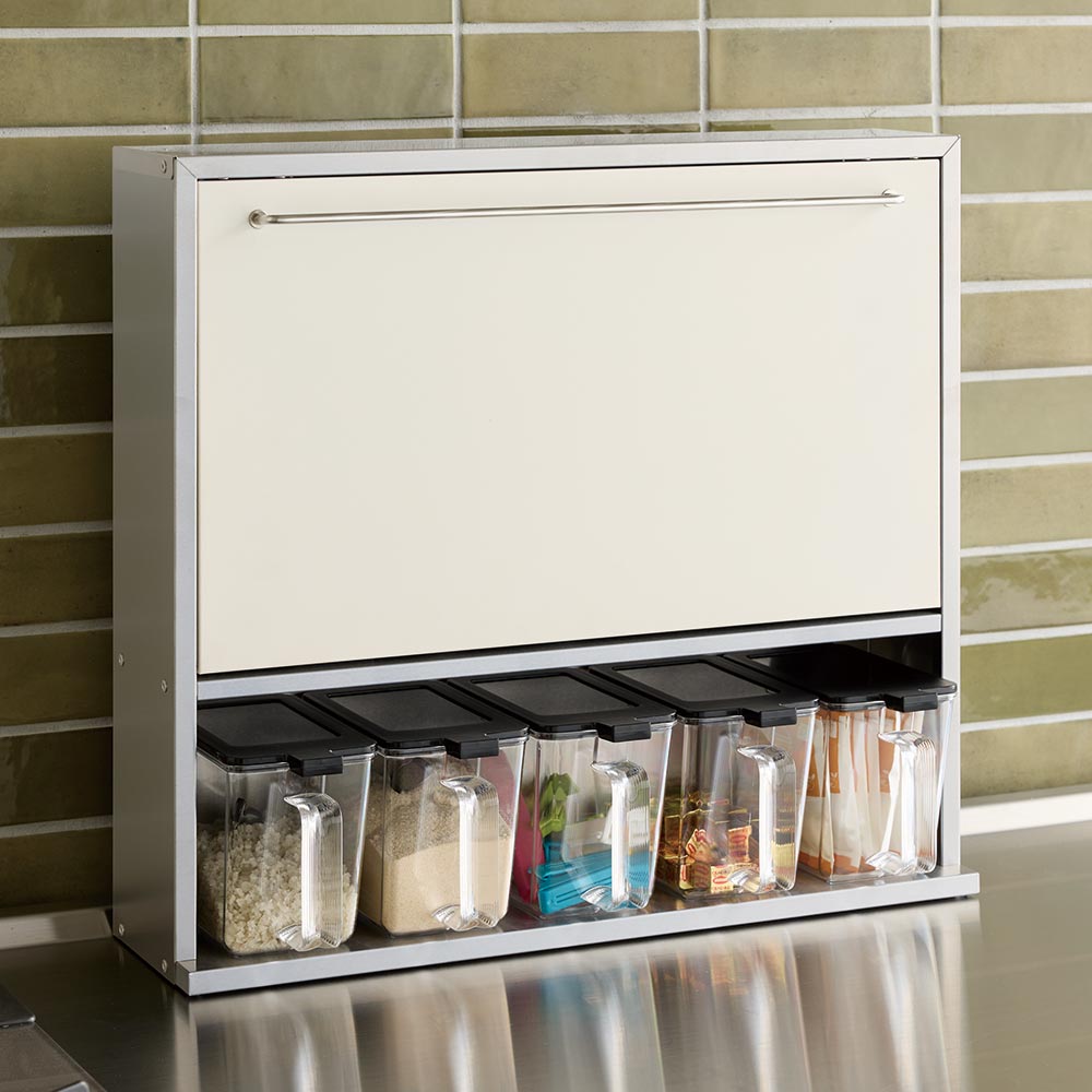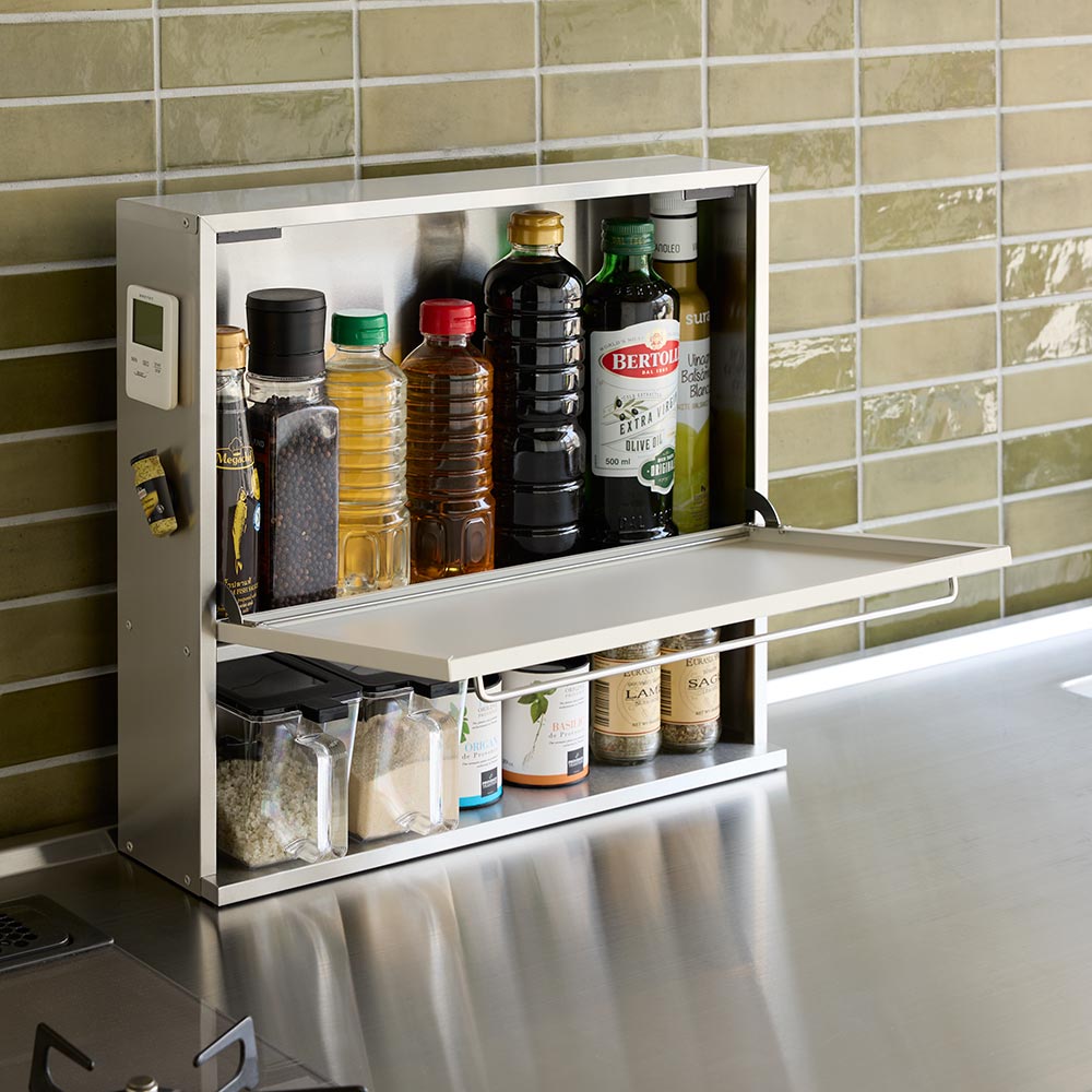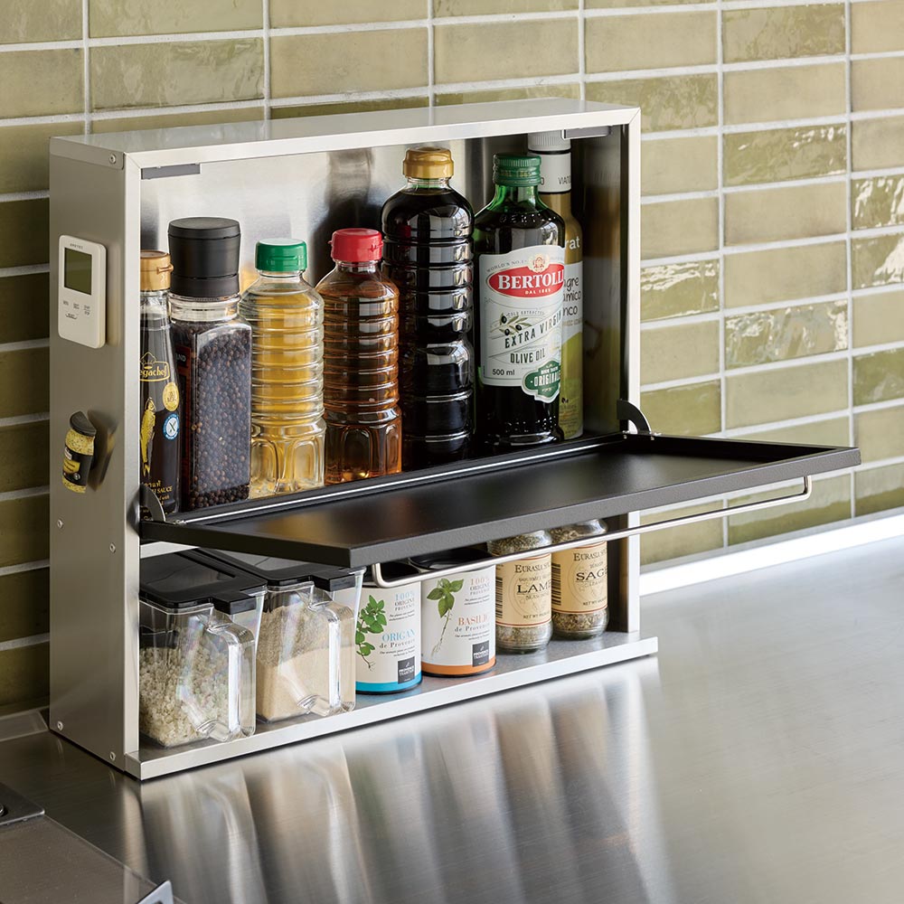 扉が80度で止まる使い勝手のよいスパイスラック。高めのボトルもすっきり隠せて、よく使う調味料の指定席にも。スリムなのに大容量!まとめて隠せる調味料&スパイスラック扉付きで調味料を汚れから守りつつ収納できる、隠せるスパイスラック。スパイスなどの小さな調味料から油などの大きいボトルまで整理しながら一括収納できます。扉が80度で止まったまま固定ができ、調理中の取り出しもラクラク。本体にはマグネットもつけられるので、キッチン周りでよく使うタイマーやちょっとしたメモを貼るのにも便利です。調味料を隠して汚れからガード!選べるおしゃれな2つのカラー扉の中は奥行き9cm・高さ25cmで、油や醤油など大きめのボトルが入ってすっきり隠せます。扉を閉めたまま取出せる下段は奥行12cm・高さ13cmで、お持ちの調味料ストッカーなどを収納可能。数が増えてごちゃつきがちな調味料をすっきりとひとまとめ。生活感を隠しつつ汚れからガードします。キッチンの印象やテイストに合わせて、ブラック・ホワイトの2色からお選びください。