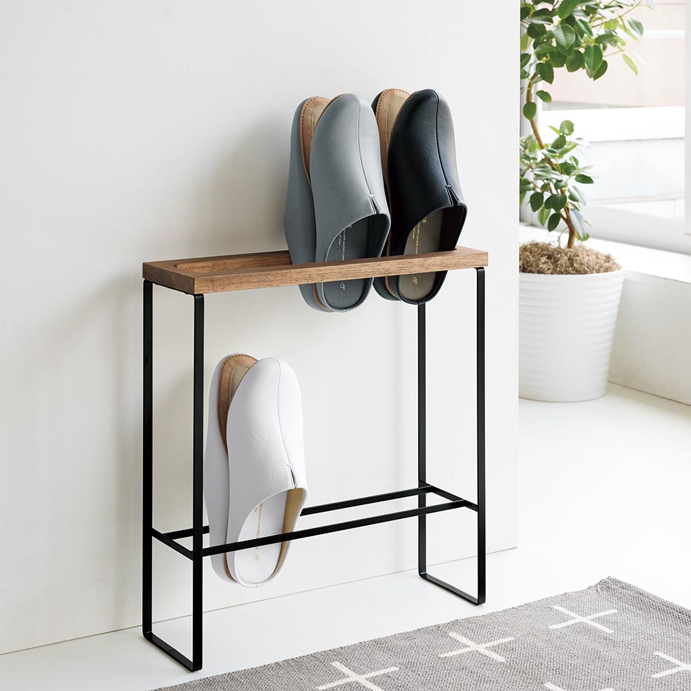 天然木とスチールの異素材使いがスマートな印象のスリッパラック。奥行15cmで場所を取らずにスリッパを約8足できるタイプです。玄関をおしゃれに見せる、シックな木目×ブラックのデザイン。スリッパで人気のルームズも入る仕様です。■高級感を演出するラバーウッド天然木とスチールの組み合わせ。落ち着いた印象の天然木に焼付塗装をされたスチールが高級感をプラス。シンプルなのに質の良さを感じさせるこだわりの一品です。天板は美しい木目と耐久性を両立し、マットなブラックで塗装された脚部がインテリアのアクセントに。■スリムなサイズ感に使いやすさを兼ね備えたフォルム玄関や廊下でも邪魔になりにくい、奥行15cm。すっきりとした細いラインで、圧迫感を軽減します。スリッパは約4足収納可能。脚部は高めの設計で、スリッパを収納したまま床の掃除ができます。■人気のroom'sスリッパに合わせて設計しっとりとした靴と同じ製法で作られた履き心地で人気のルームズスリッパが入るサイズで企画。ディノスオリジナル商品です。LLサイズも上下に収まるつくり。甲の高いスリッパも干渉しません。商品開発に関する口コミもお待ちしております。