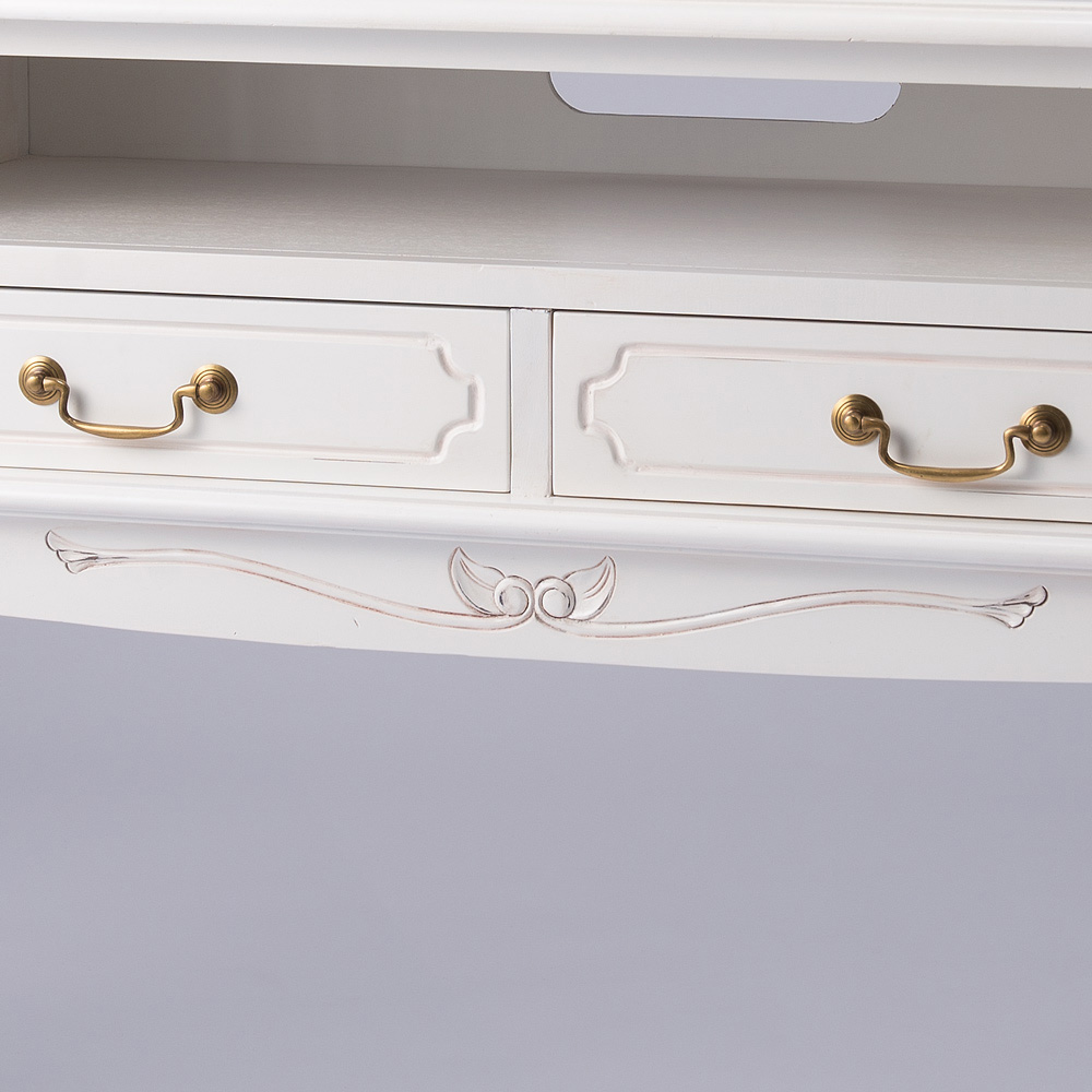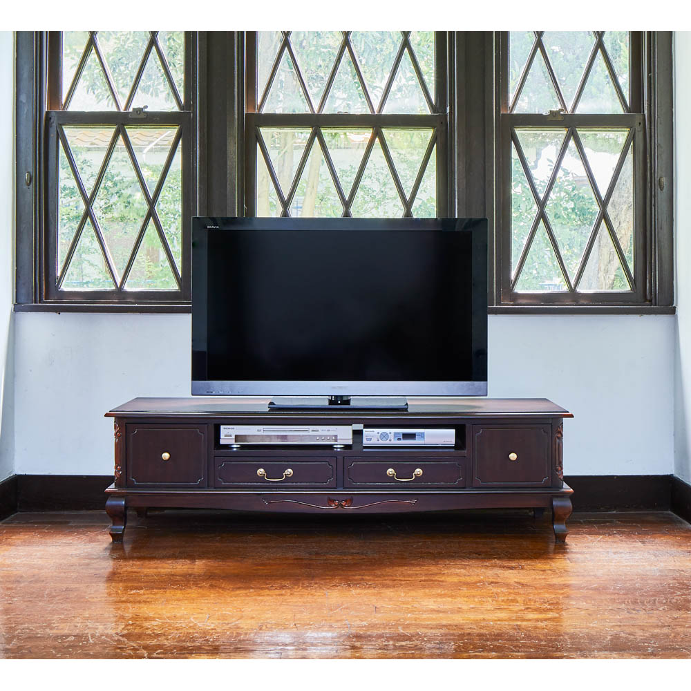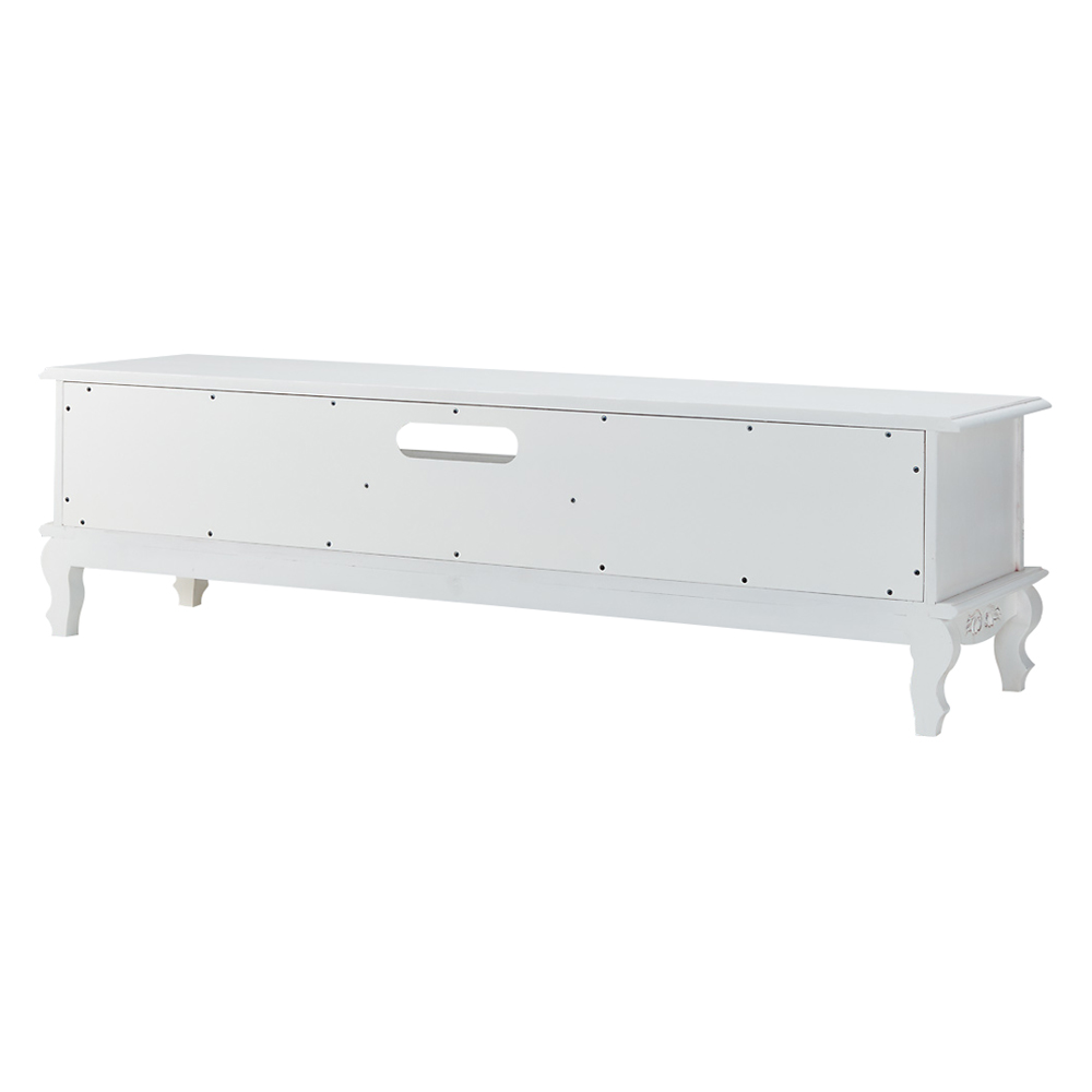 クラシックなスタイルと味わい深い仕上げが魅力のテレビボード。アンティーク風家具の魅力を引き出すために丁寧に塗装部分を削り加工を施しています。デッキ2台とDVDソフトも収納できる人気のTV台です。〜エレガントなアンティーク風輸入家具のテレビボード〜◆凝った彫刻と猫脚のデザインが華やかなアンティーク空間を演出するクラシックインテリアのテレビ台。◆まるでアンティークのように、使い込んだかのような仕上げで味わい深い印象に作りました。◆フレンチアンティークや白家具の世界をご自宅に再現できます。◆マホガニー天然木を贅沢に使用しているので美しく、キャビネットやリビングボードのようにお使い頂けます。◆デッキ類2台が収納でき、引き出しにはDVDソフトが収納できるTVボード。◆背板にはコード穴が1ヵ所付いているので配線も可能です。◆脚部には見た目が艶やかで、細やかな装飾を施してあります。◆ホワイト、ダークブラウンともに趣きのある仕上げになっています。◆お部屋のコーディネートで外国で暮らすような雰囲気を作り出す逸品です。〜本物志向のあなたにおすすめしたい、丹念な手作業の逸品〜◆ひとつずつ、職人の手で丁寧に磨かれたアンティーク風仕上げの人気商品です。◆脚部の猫足がやわらかな中世フランスのヨーロピアンインテリアを感じさせます。◆シリーズ商品にはキャビネットやチェストのタイプもございます、ぜひご覧ください。◆引出しはしっかりと作った作りになっています。◆取っ手ひとつのデザイン・色もおしゃれにこだわりました。◆完成品でお届けしますので届いたその日からすぐにお使いになれます。※こちらのシリーズはアンティーク風仕上げの塗装に削り加工を施し長年使い込んだような味わいのある風合い(塗装むら、塗装はがれなど)が特徴の商品となります。天然素材ならではの風合いをお楽しみください。〜アンティーク家具の特集はこちら〜アンティーク家具の世界