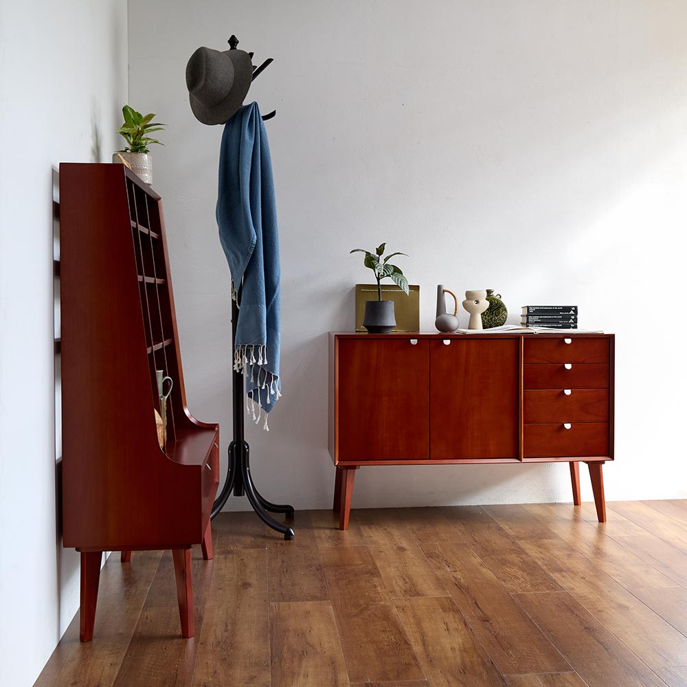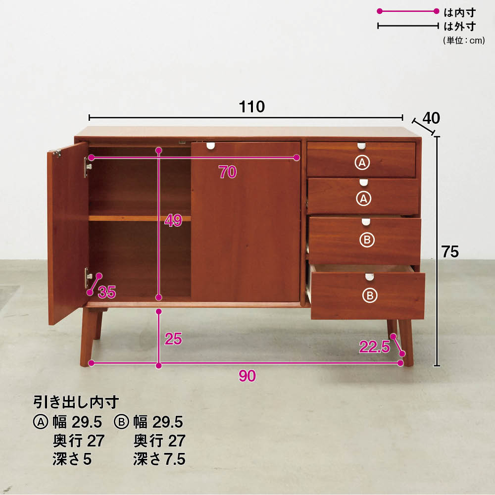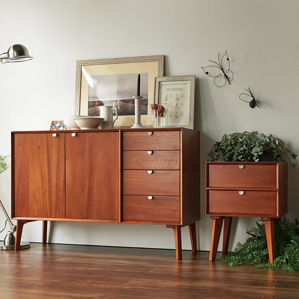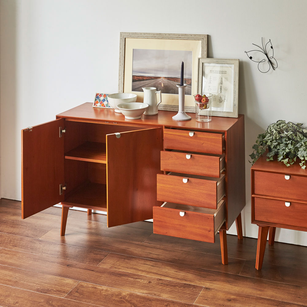 北欧ヴィンテージデザインをリアルに再現したおしゃれなリビング収納シリーズ。1950年代頃のデンマークによく見られる、長い脚のついた家具のスタイルをリアルに再現しました。表情豊かなマホガニーの木目を生かした仕上げ。たっぷりした収納力で、リビングキャビネット、サイドボードとして、窓下のストック収納としても使いやすい実用性も兼ね備えています。北欧ヴィンテージスタイルをリアルに再現したリビング収納シリーズ1950年代頃のデンマークによく見られる、長い脚のついた家具のスタイルをリアルに再現したシリーズ。この頃のものにみられる赤みのある色合いも丁寧に表現しました。角の仕上げから、真鍮の取っ手まで、本物のビンテージのようなインテリア空間を気軽にお楽しみいただけます。マホガニーの木目が美しいたっぷり収納のリビングキャビネット■前面・天板・サイドにはマホガニーの突板を贅沢に使用しました。天然ならではの一つ一つ表情の違う自然な木目が魅力です。■脚部にはマホガニーの天然木を採用。本物の素材感をお楽しみいただけます。柔らかく光る取っ手は真鍮製。見た目だけでなく、つかみやすさもポイント。■シルバーに光る取っ手は真鍮を採用しました。ヴィンテージな質感を出すため、表面をマットな仕上げにし、優しい輝きを目指しました。■取っ手は手前に向かって斜めに傾斜するつまみタイプ。指でつかみやすいサイズ感と形で、日常の使いやすさにも配慮しました。ヴィンテージ感をより高める、フレームのような縁取りデザインがおしゃれなシリーズ■正面の縁にある額縁のようなあしらいがヴィンテージの雰囲気をより感じさせてくれます。■奥に向かってV字にカットし、さらに角もV字にカットする丁寧な仕上げ。■かつて手作業で行われていた繊細な細工を丁寧に再現しました。奥行浅めの薄型収納は、設置場所を選ばずリビング収納・書棚としても。■薄型収納は窓下や廊下・リビングの空きスペースなど、カウンター下以外のデッドスペースも有効活用できます。■廊下や寝室などの窓下に設置して書斎・本棚に収まりきらない雑誌収納やCD収納、DVD収納としても。■リビングの窓下などに設置すれば、FAX台や電話台、ローボードや窓下収納としても活躍。リビングに散らばりがちな小物、生活雑貨をまとめて。スライドレール付きで開閉スムーズな引き出し、整理整頓もお任せなリビングチェスト■引き出しには前段スライドレールを採用。滑らかに開閉できます。■こまごましたものを整理整頓しやすいよう、深さの違う2タイプの引き出しを4杯設けました。大きな扉には書類や小物などをしまって、雑多になりがちなリビングをすっきりと■大きな扉内部には一を調節できる棚板付き。収納場所に困るご家庭の書類やプリント類・取扱説明書などの収納に便利。■そのほか、薬箱やコピー用紙など置き場所に困るストック品をまとめるのもおすすめです。お届け後、すぐに使える半完成品■お届けの後、箱から出して脚と取っ手をつけるだけの簡単取り付け。■すぐにご使用いただけますので、整理整頓もスムーズです。