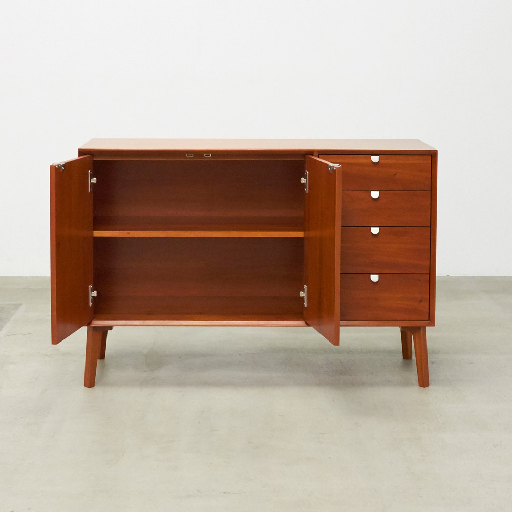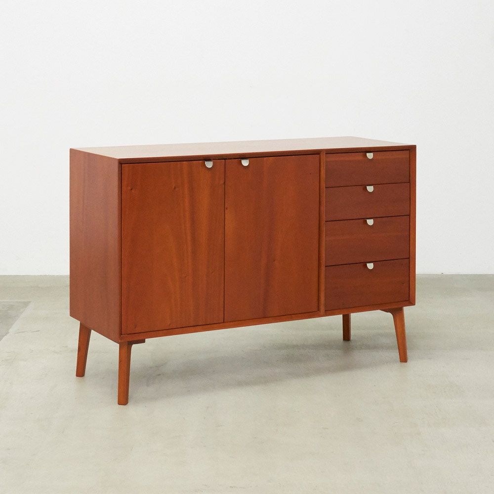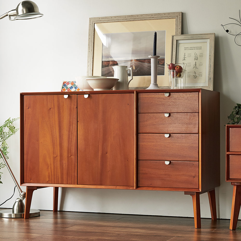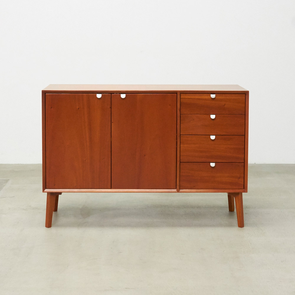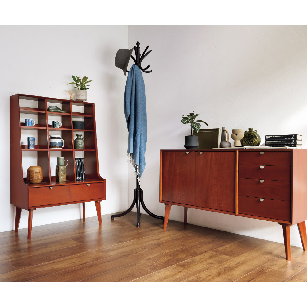 北欧ヴィンテージデザインをリアルに再現したおしゃれなリビング収納シリーズ。1950年代頃のデンマークによく見られる、長い脚のついた家具のスタイルをリアルに再現しました。表情豊かなマホガニーの木目を生かした仕上げ。たっぷりした収納力で、リビングキャビネット、サイドボードとして、窓下のストック収納としても使いやすい実用性も兼ね備えています。北欧ヴィンテージスタイルをリアルに再現したリビング収納シリーズ1950年代頃のデンマークによく見られる、長い脚のついた家具のスタイルをリアルに再現したシリーズ。この頃のものにみられる赤みのある色合いも丁寧に表現しました。角の仕上げから、真鍮の取っ手まで、本物のビンテージのようなインテリア空間を気軽にお楽しみいただけます。マホガニーの木目が美しいたっぷり収納のリビングキャビネット■前面・天板・サイドにはマホガニーの突板を贅沢に使用しました。天然ならではの一つ一つ表情の違う自然な木目が魅力です。■脚部にはマホガニーの天然木を採用。本物の素材感をお楽しみいただけます。柔らかく光る取っ手は真鍮製。見た目だけでなく、つかみやすさもポイント。■シルバーに光る取っ手は真鍮を採用しました。ヴィンテージな質感を出すため、表面をマットな仕上げにし、優しい輝きを目指しました。■取っ手は手前に向かって斜めに傾斜するつまみタイプ。指でつかみやすいサイズ感と形で、日常の使いやすさにも配慮しました。ヴィンテージ感をより高める、フレームのような縁取りデザインがおしゃれなシリーズ■正面の縁にある額縁のようなあしらいがヴィンテージの雰囲気をより感じさせてくれます。■奥に向かってV字にカットし、さらに角もV字にカットする丁寧な仕上げ。■かつて手作業で行われていた繊細な細工を丁寧に再現しました。奥行浅めの薄型収納は、設置場所を選ばずリビング収納・書棚としても。■薄型収納は窓下や廊下・リビングの空きスペースなど、カウンター下以外のデッドスペースも有効活用できます。■廊下や寝室などの窓下に設置して書斎・本棚に収まりきらない雑誌収納やCD収納、DVD収納としても。■リビングの窓下などに設置すれば、FAX台や電話台、ローボードや窓下収納としても活躍。リビングに散らばりがちな小物、生活雑貨をまとめて。スライドレール付きで開閉スムーズな引き出し、整理整頓もお任せなリビングチェスト■引き出しには前段スライドレールを採用。滑らかに開閉できます。■こまごましたものを整理整頓しやすいよう、深さの違う2タイプの引き出しを4杯設けました。大きな扉には書類や小物などをしまって、雑多になりがちなリビングをすっきりと■大きな扉内部には一を調節できる棚板付き。収納場所に困るご家庭の書類やプリント類・取扱説明書などの収納に便利。■そのほか、薬箱やコピー用紙など置き場所に困るストック品をまとめるのもおすすめです。お届け後、すぐに使える半完成品■お届けの後、箱から出して脚と取っ手をつけるだけの簡単取り付け。■すぐにご使用いただけますので、整理整頓もスムーズです。