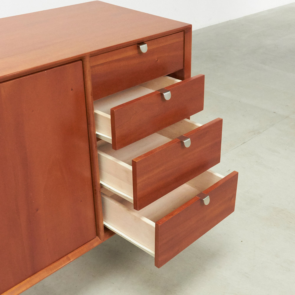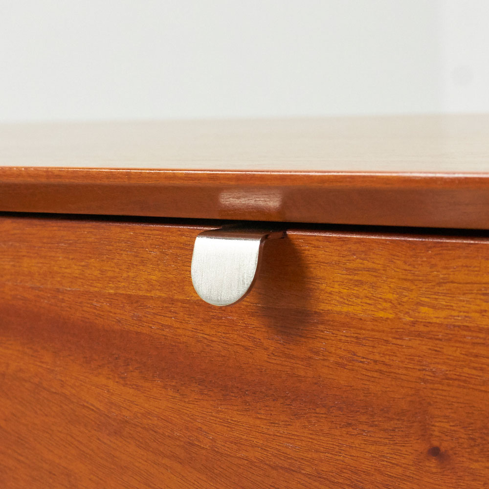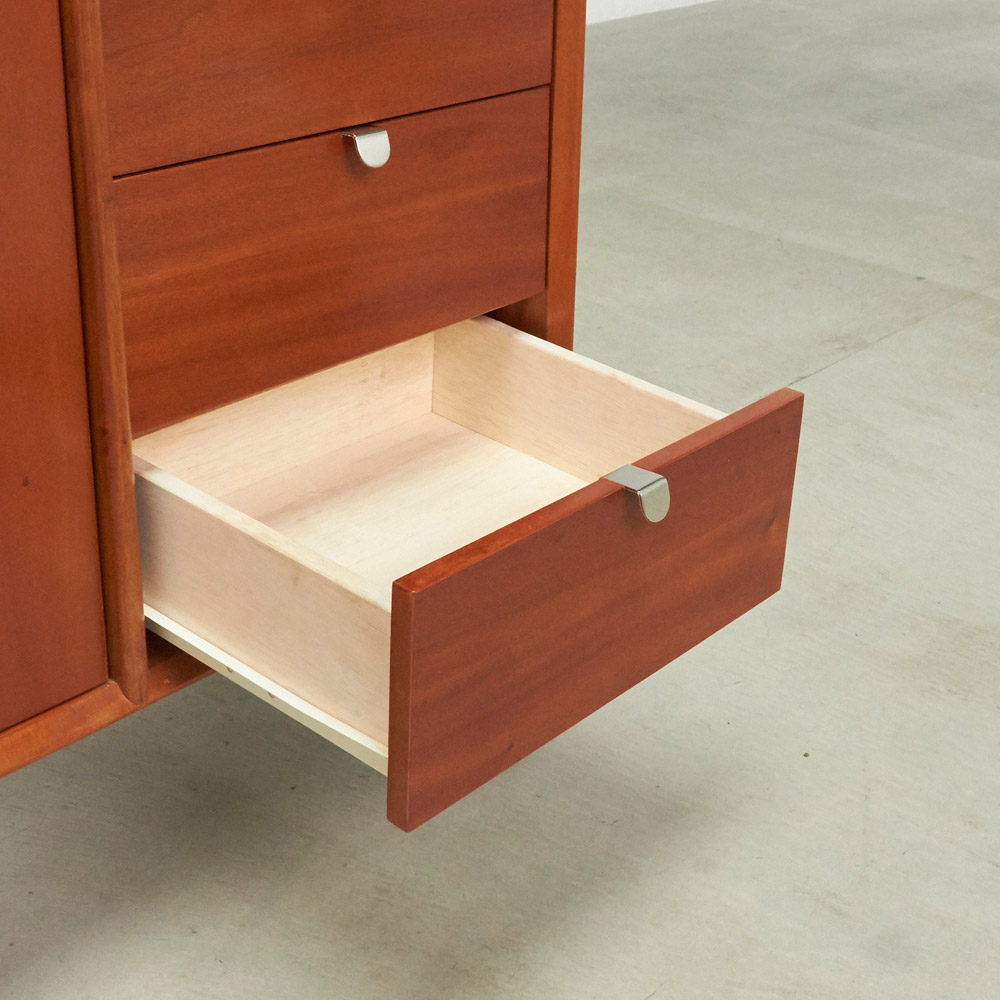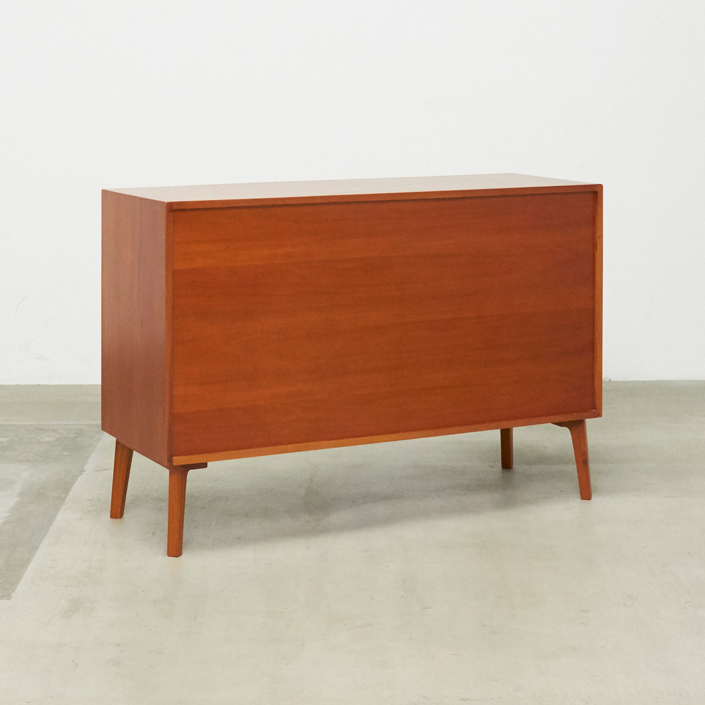 北欧ヴィンテージデザインをリアルに再現したおしゃれなリビング収納シリーズ。1950年代頃のデンマークによく見られる、長い脚のついた家具のスタイルをリアルに再現しました。表情豊かなマホガニーの木目を生かした仕上げ。たっぷりした収納力で、リビングキャビネット、サイドボードとして、窓下のストック収納としても使いやすい実用性も兼ね備えています。北欧ヴィンテージスタイルをリアルに再現したリビング収納シリーズ1950年代頃のデンマークによく見られる、長い脚のついた家具のスタイルをリアルに再現したシリーズ。この頃のものにみられる赤みのある色合いも丁寧に表現しました。角の仕上げから、真鍮の取っ手まで、本物のビンテージのようなインテリア空間を気軽にお楽しみいただけます。マホガニーの木目が美しいたっぷり収納のリビングキャビネット■前面・天板・サイドにはマホガニーの突板を贅沢に使用しました。天然ならではの一つ一つ表情の違う自然な木目が魅力です。■脚部にはマホガニーの天然木を採用。本物の素材感をお楽しみいただけます。柔らかく光る取っ手は真鍮製。見た目だけでなく、つかみやすさもポイント。■シルバーに光る取っ手は真鍮を採用しました。ヴィンテージな質感を出すため、表面をマットな仕上げにし、優しい輝きを目指しました。■取っ手は手前に向かって斜めに傾斜するつまみタイプ。指でつかみやすいサイズ感と形で、日常の使いやすさにも配慮しました。ヴィンテージ感をより高める、フレームのような縁取りデザインがおしゃれなシリーズ■正面の縁にある額縁のようなあしらいがヴィンテージの雰囲気をより感じさせてくれます。■奥に向かってV字にカットし、さらに角もV字にカットする丁寧な仕上げ。■かつて手作業で行われていた繊細な細工を丁寧に再現しました。奥行浅めの薄型収納は、設置場所を選ばずリビング収納・書棚としても。■薄型収納は窓下や廊下・リビングの空きスペースなど、カウンター下以外のデッドスペースも有効活用できます。■廊下や寝室などの窓下に設置して書斎・本棚に収まりきらない雑誌収納やCD収納、DVD収納としても。■リビングの窓下などに設置すれば、FAX台や電話台、ローボードや窓下収納としても活躍。リビングに散らばりがちな小物、生活雑貨をまとめて。スライドレール付きで開閉スムーズな引き出し、整理整頓もお任せなリビングチェスト■引き出しには前段スライドレールを採用。滑らかに開閉できます。■こまごましたものを整理整頓しやすいよう、深さの違う2タイプの引き出しを4杯設けました。大きな扉には書類や小物などをしまって、雑多になりがちなリビングをすっきりと■大きな扉内部には一を調節できる棚板付き。収納場所に困るご家庭の書類やプリント類・取扱説明書などの収納に便利。■そのほか、薬箱やコピー用紙など置き場所に困るストック品をまとめるのもおすすめです。お届け後、すぐに使える半完成品■お届けの後、箱から出して脚と取っ手をつけるだけの簡単取り付け。■すぐにご使用いただけますので、整理整頓もスムーズです。