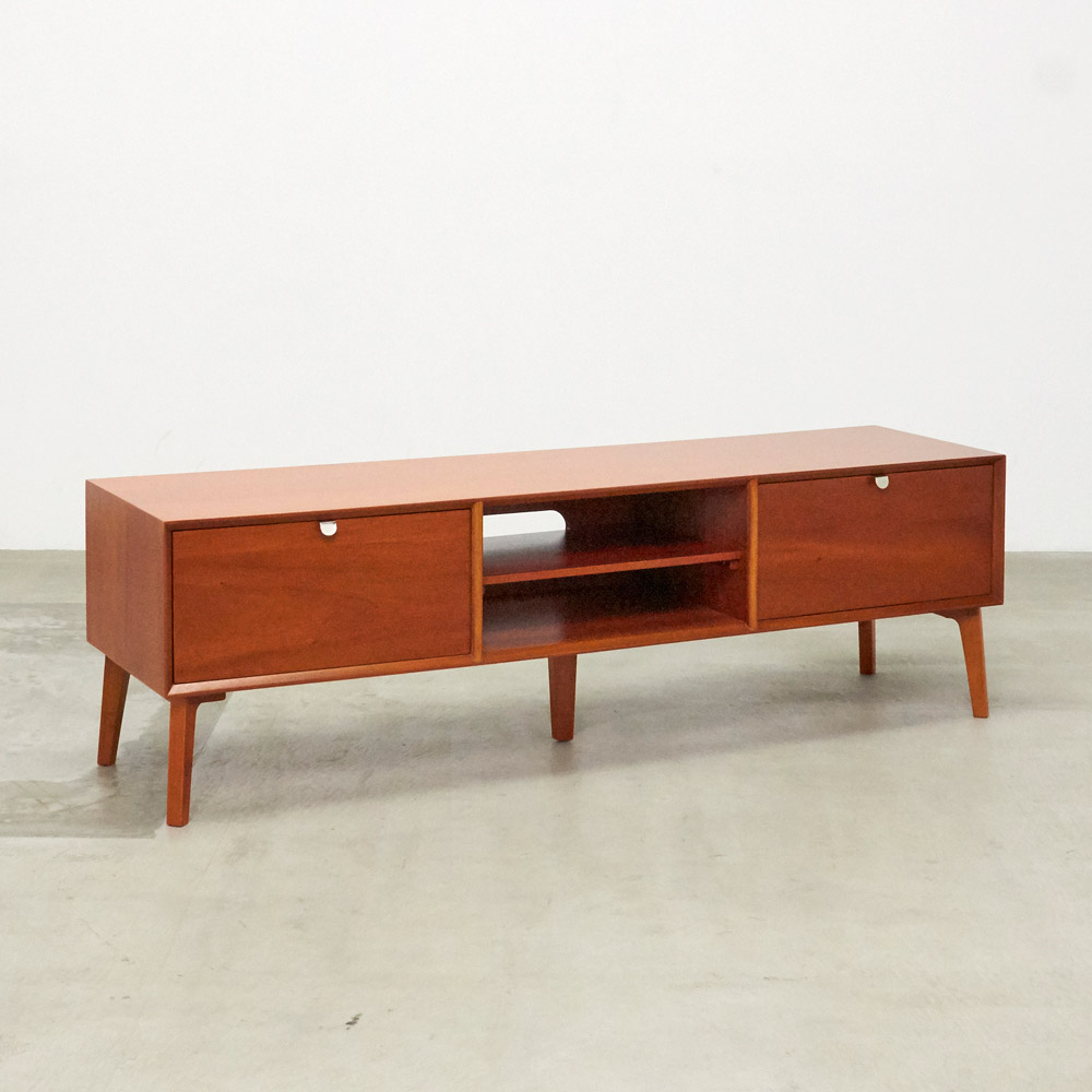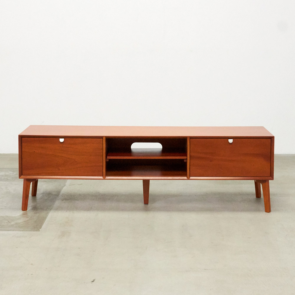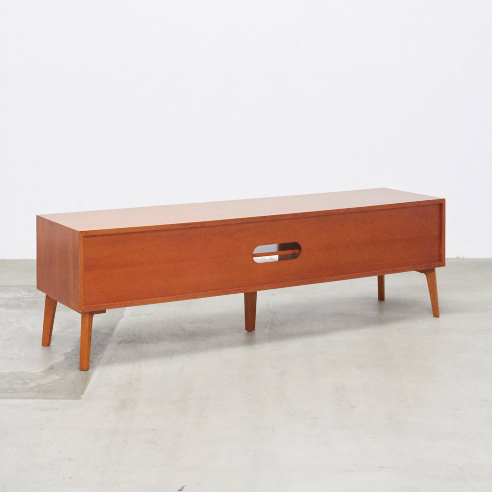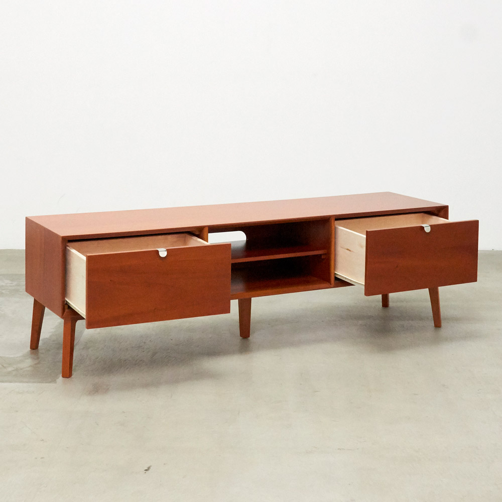 北欧ヴィンテージデザインをリアルに再現したおしゃれなリビング収納シリーズ。1950年代頃のデンマークによく見られる、長い脚のついた家具のスタイルをリアルに再現しました。表情豊かなマホガニーの木目を生かした仕上げ。デッキやDVDプレイヤーの設置や配線への配慮はもちろん、CDやDVDの収納も可能な実用性も兼ね備えたテレビボード、テレビ台です。北欧ヴィンテージスタイルをリアルに再現したリビング収納シリーズ1950年代頃のデンマークによく見られる、長い脚のついた家具のスタイルをリアルに再現したシリーズ。この頃のものにみられる赤みのある色合いも丁寧に表現しました。角の仕上げから、真鍮の取っ手まで、本物のビンテージのようなインテリア空間を気軽にお楽しみいただけます。マホガニーの木目が美しいたっぷり収納のテレビ台■前面・天板・サイドにはマホガニーの突板を贅沢に使用しました。天然ならではの一つ一つ表情の違う自然な木目が魅力です。■脚部にはマホガニーの天然木を採用。本物の素材感をお楽しみいただけます。柔らかく光る取っ手は真鍮製。見た目だけでなく、つかみやすさもポイント。■シルバーに光る取っ手は真鍮を採用しました。ヴィンテージな質感を出すため、表面をマットな仕上げにし、優しい輝きを目指しました。■取っ手は手前に向かって斜めに傾斜するつまみタイプ。指でつかみやすいサイズ感と形で、日常の使いやすさにも配慮しました。ヴィンテージ感をより高める、フレームのような縁取りデザインがおしゃれなシリーズ■正面の縁にある額縁のようなあしらいがヴィンテージの雰囲気をより感じさせてくれます。■奥に向かってV字にカットし、さらに角もV字にカットする丁寧な仕上げ。■かつて手作業で行われていた繊細な細工を丁寧に再現しました。インテリア性だけでなく使いやすさにこだわった高機能なテレビボード■ブルーレイやDVDなどを2台設置できるオープン棚付き。■配線しやすいよう、奥にコード穴を設けています。■右端の引き出しにはCD、DVDの背表紙を見せて収納できます。■引き出しには開閉しやすいスライドレール付きお届け後、すぐに使える半完成品■お届けの後、箱から出して脚と取っ手をつけるだけの簡単取り付け。■すぐにご使用いただけますので、整理整頓もスムーズです。