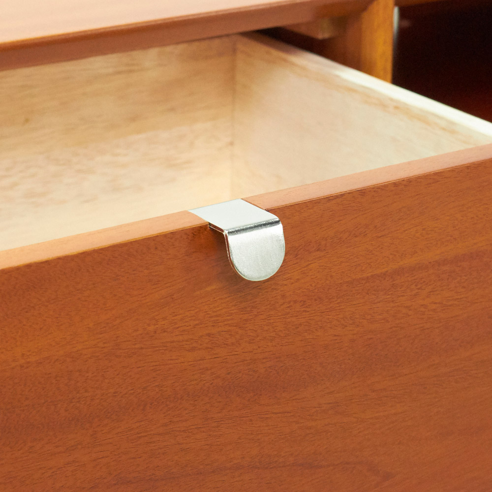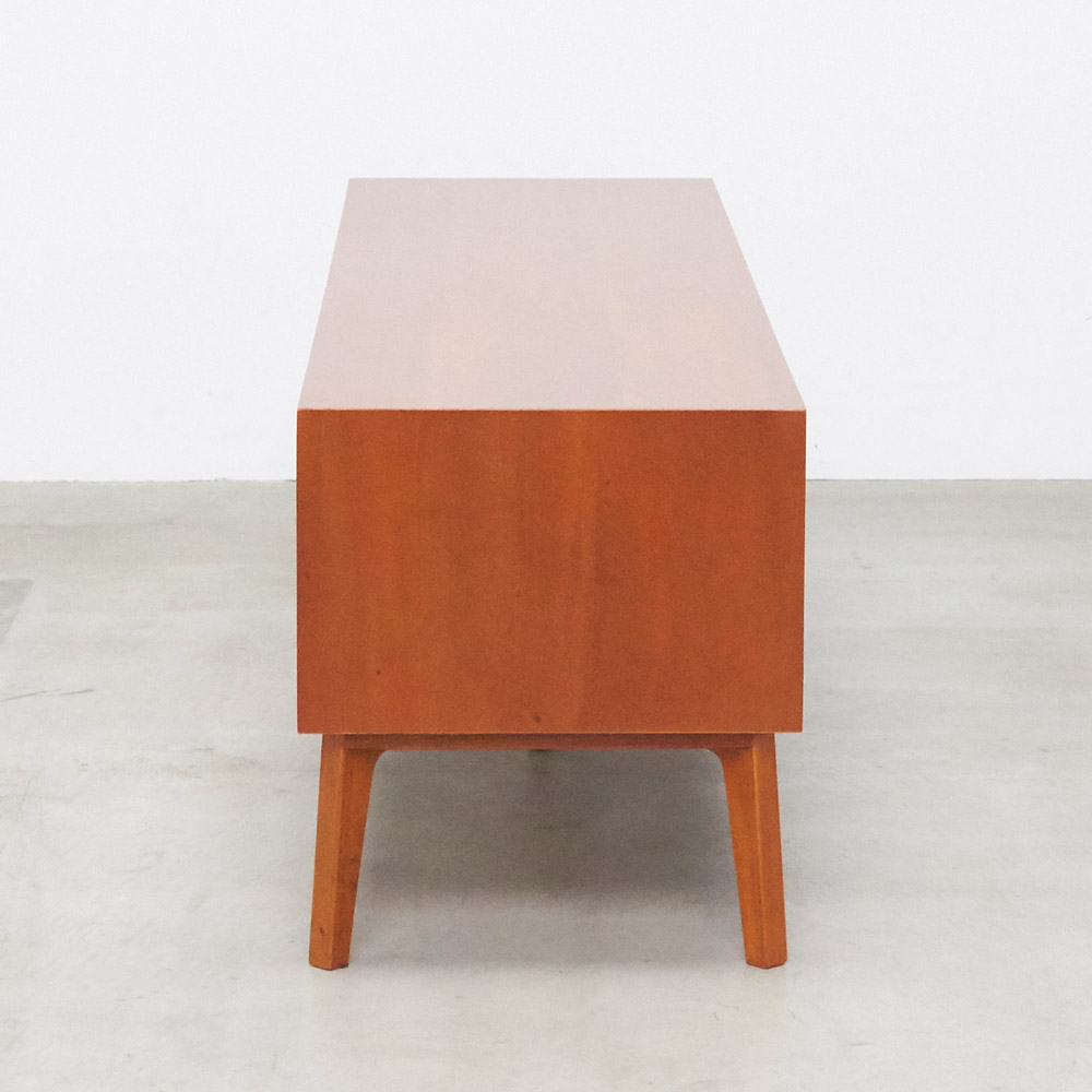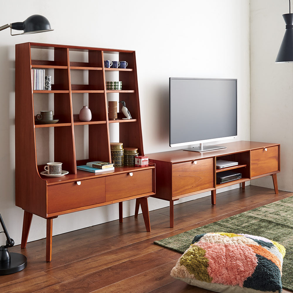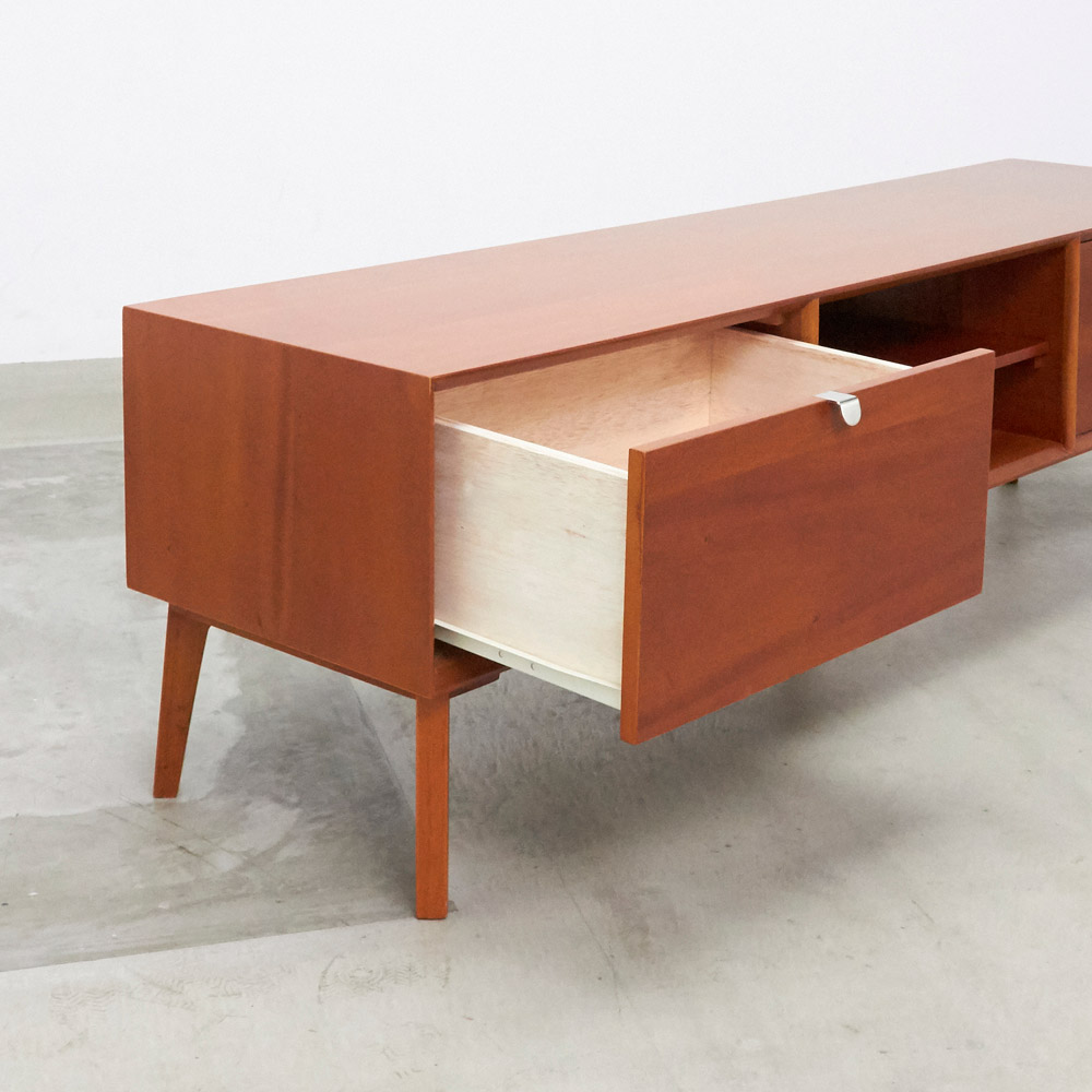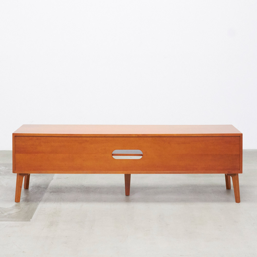 北欧ヴィンテージデザインをリアルに再現したおしゃれなリビング収納シリーズ。1950年代頃のデンマークによく見られる、長い脚のついた家具のスタイルをリアルに再現しました。表情豊かなマホガニーの木目を生かした仕上げ。デッキやDVDプレイヤーの設置や配線への配慮はもちろん、CDやDVDの収納も可能な実用性も兼ね備えたテレビボード、テレビ台です。北欧ヴィンテージスタイルをリアルに再現したリビング収納シリーズ1950年代頃のデンマークによく見られる、長い脚のついた家具のスタイルをリアルに再現したシリーズ。この頃のものにみられる赤みのある色合いも丁寧に表現しました。角の仕上げから、真鍮の取っ手まで、本物のビンテージのようなインテリア空間を気軽にお楽しみいただけます。マホガニーの木目が美しいたっぷり収納のテレビ台■前面・天板・サイドにはマホガニーの突板を贅沢に使用しました。天然ならではの一つ一つ表情の違う自然な木目が魅力です。■脚部にはマホガニーの天然木を採用。本物の素材感をお楽しみいただけます。柔らかく光る取っ手は真鍮製。見た目だけでなく、つかみやすさもポイント。■シルバーに光る取っ手は真鍮を採用しました。ヴィンテージな質感を出すため、表面をマットな仕上げにし、優しい輝きを目指しました。■取っ手は手前に向かって斜めに傾斜するつまみタイプ。指でつかみやすいサイズ感と形で、日常の使いやすさにも配慮しました。ヴィンテージ感をより高める、フレームのような縁取りデザインがおしゃれなシリーズ■正面の縁にある額縁のようなあしらいがヴィンテージの雰囲気をより感じさせてくれます。■奥に向かってV字にカットし、さらに角もV字にカットする丁寧な仕上げ。■かつて手作業で行われていた繊細な細工を丁寧に再現しました。インテリア性だけでなく使いやすさにこだわった高機能なテレビボード■ブルーレイやDVDなどを2台設置できるオープン棚付き。■配線しやすいよう、奥にコード穴を設けています。■右端の引き出しにはCD、DVDの背表紙を見せて収納できます。■引き出しには開閉しやすいスライドレール付きお届け後、すぐに使える半完成品■お届けの後、箱から出して脚と取っ手をつけるだけの簡単取り付け。■すぐにご使用いただけますので、整理整頓もスムーズです。