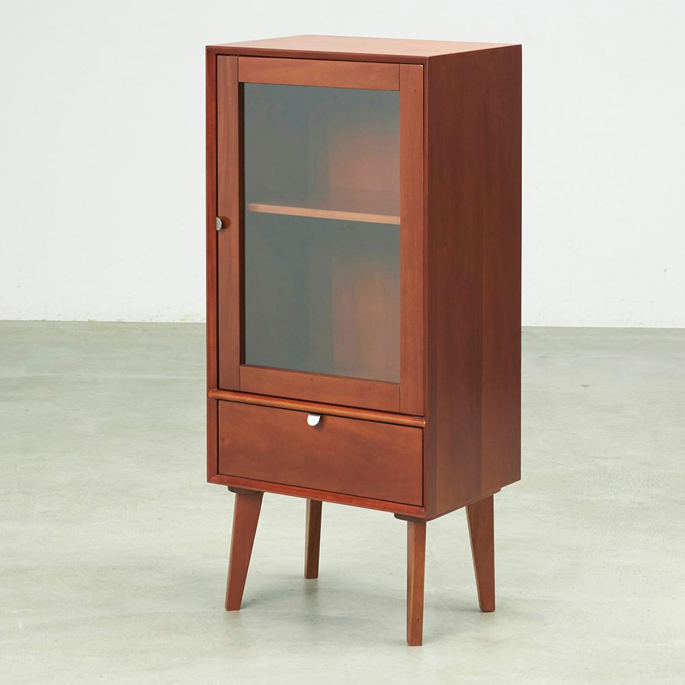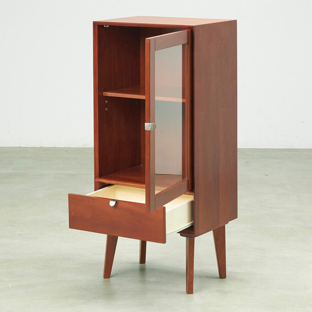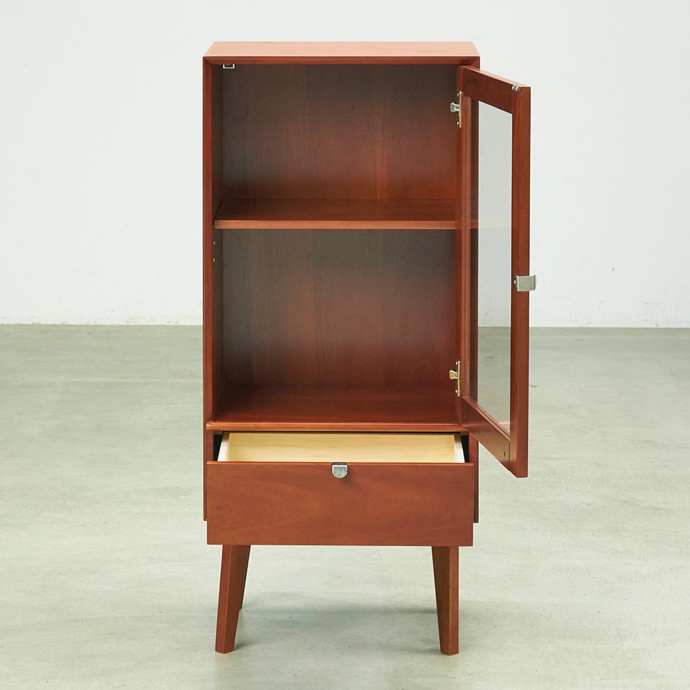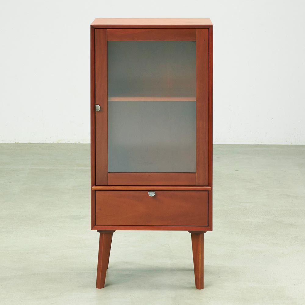 北欧ヴィンテージデザインをリアルに再現したおしゃれなキャビネット。1950年代頃のデンマークによく見られる、長い脚のついた家具のスタイルをリアルに再現しました。表情豊かなマホガニーの木目を生かした仕上げ。扉収納、引き出し付きで使いやすい実用性も兼ね備えています。北欧ヴィンテージスタイルをリアルに再現したシリーズ1950年代頃のデンマークによく見られる、長い脚のついた家具のスタイルをリアルに再現したシリーズ。この頃のものにみられる赤みのある色合いも丁寧に表現しました。角の仕上げから、真鍮の取っ手まで、本物のビンテージのようなインテリア空間を気軽にお楽しみいただけます。マホガニーの木目が美しいガラスキャビネット■前面・天板・サイドにはマホガニーの突板を贅沢に使用しました。天然ならではの一つ一つ表情の違う自然な木目が魅力です。■脚部にはマホガニーの天然木を採用。本物の素材感をお楽しみいただけます。柔らかく光る取っ手は真鍮製。見た目だけでなく、つかみやすさもポイント。■シルバーに光る取っ手は真鍮を採用しました。ヴィンテージな質感を出すため、表面をマットな仕上げにし、優しい輝きを目指しました。■取っ手は手前に向かって斜めに傾斜するつまみタイプ。指でつかみやすいサイズ感と形で、日常の使いやすさにも配慮しました。ヴィンテージ感をより高める、フレームのような縁取りデザインがおしゃれなシリーズ■正面の縁にある額縁のようなあしらいがヴィンテージの雰囲気をより感じさせてくれます。■奥に向かってV字にカットし、さらに角もV字にカットする丁寧な仕上げ。■かつて手作業で行われていた繊細な細工を丁寧に再現しました。見せる収納が可能なガラスキャビネット■上部はガラス扉で中の物が見えるデザイン。中には可動棚が1枚付いており、書類や書籍等はもちろん、趣味の物まで幅広く収納可能です。■下部には引き出しをつけ、収納スペースを十分確保。お届け後、すぐに使える半完成品■お届けの後、箱から出して脚と取っ手をつけるだけの簡単取り付け。■すぐにご使用いただけますので、整理整頓もスムーズです。