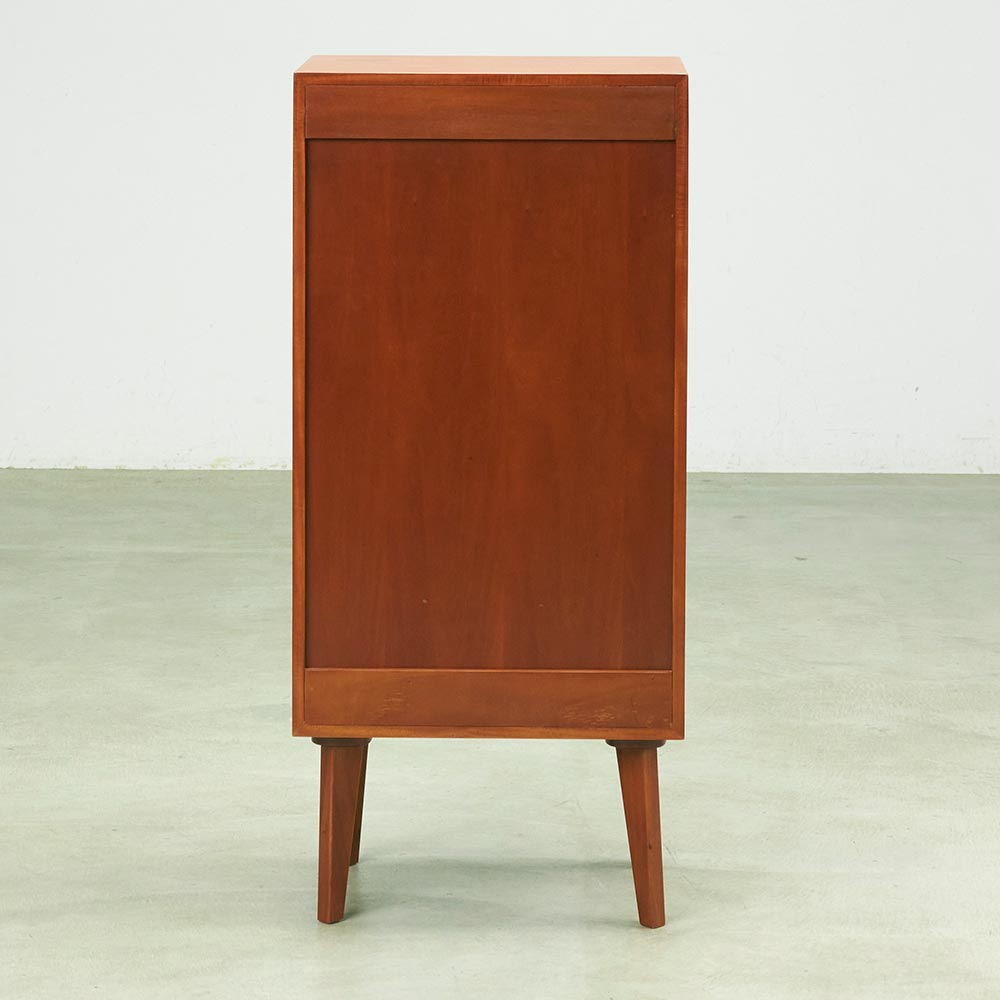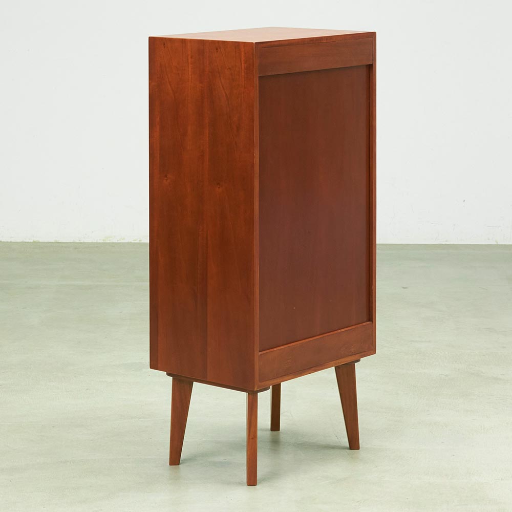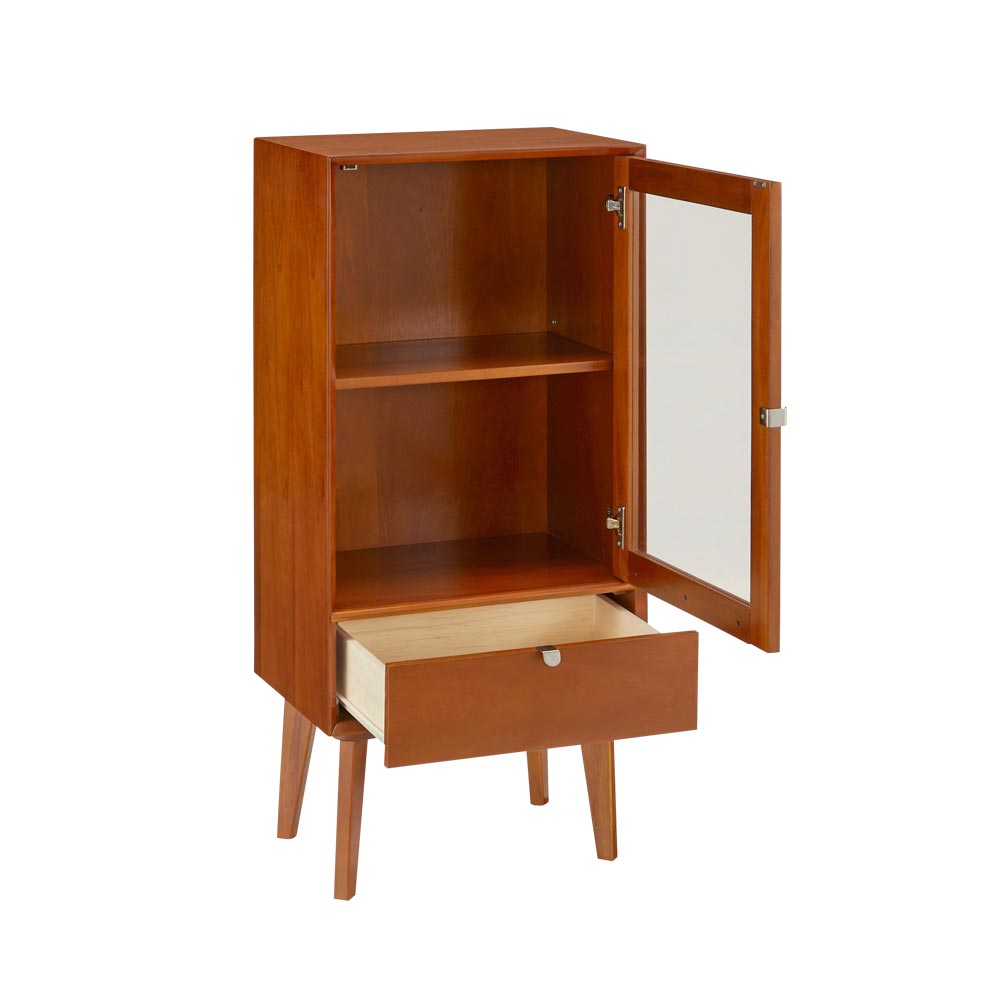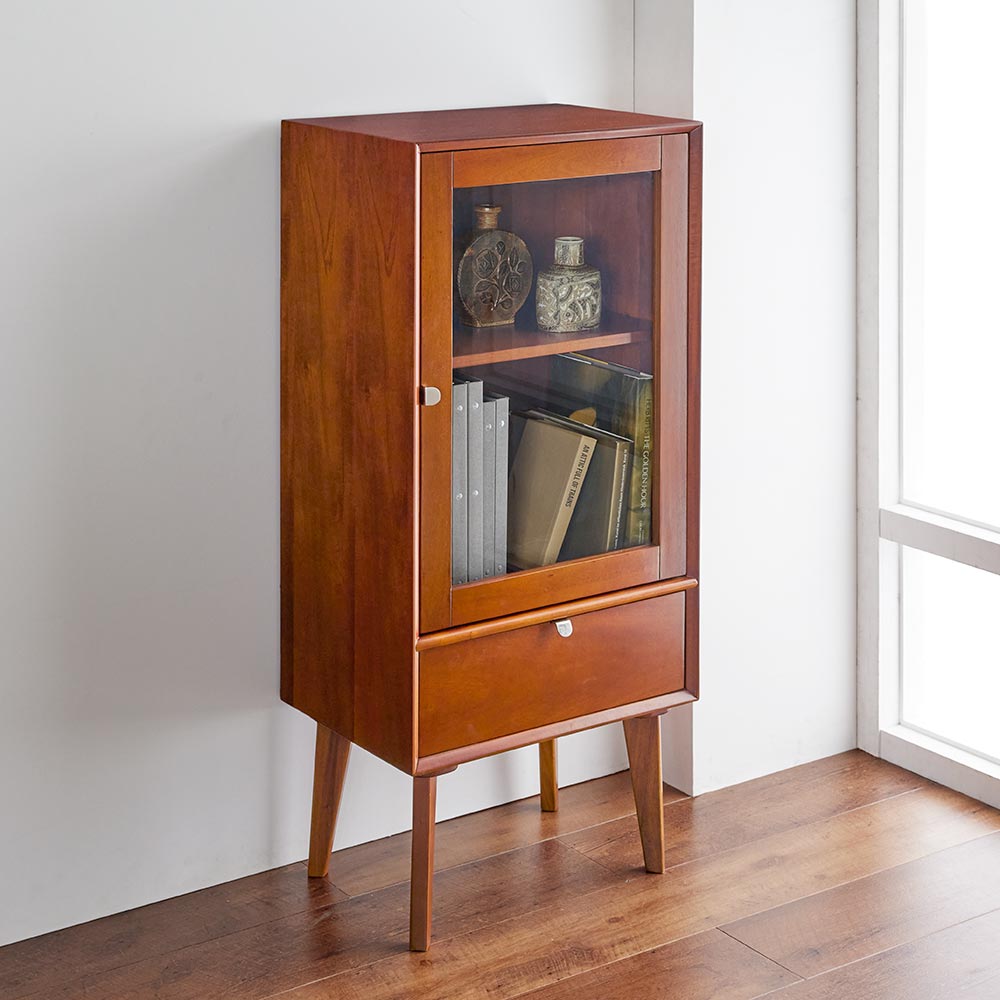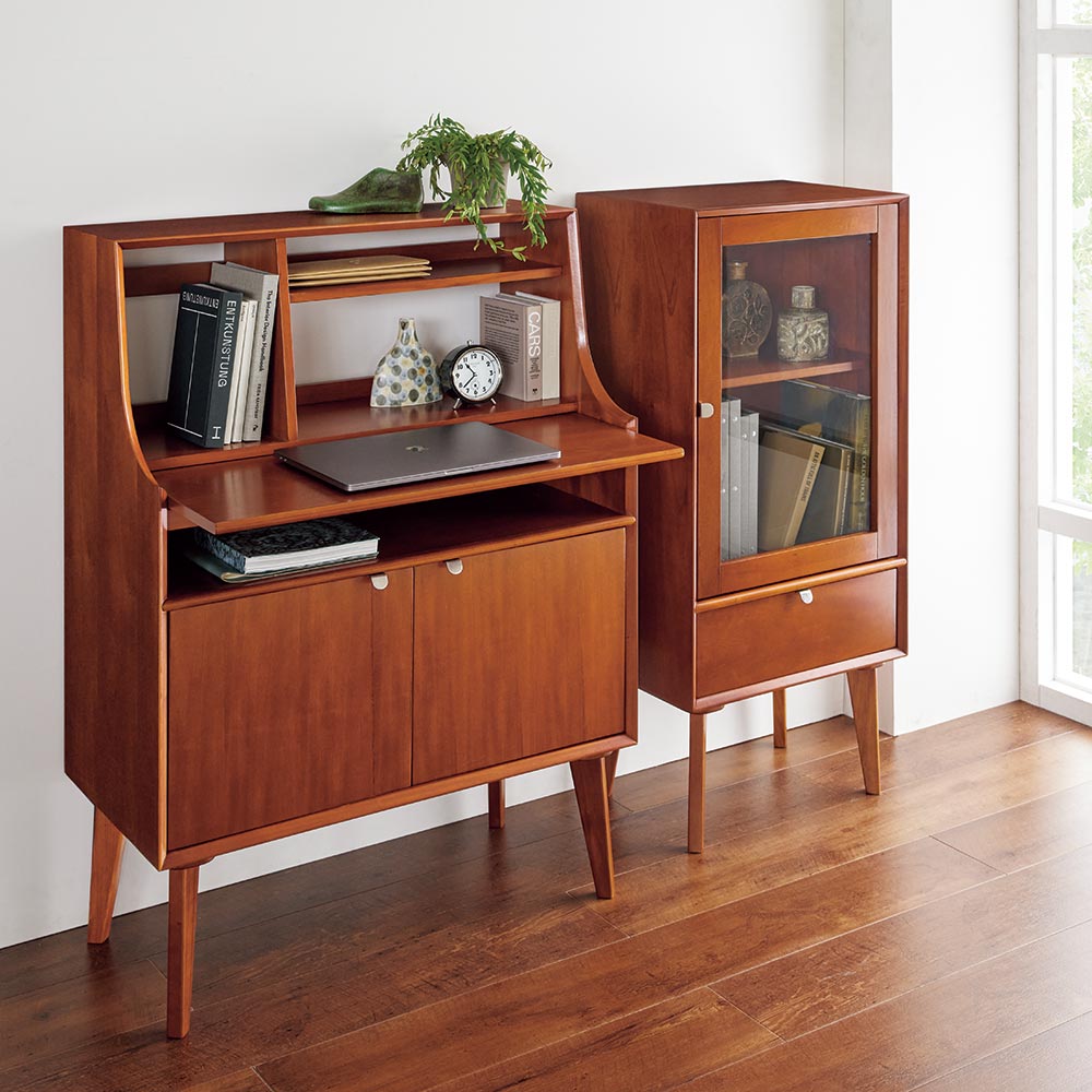 北欧ヴィンテージデザインをリアルに再現したおしゃれなキャビネット。1950年代頃のデンマークによく見られる、長い脚のついた家具のスタイルをリアルに再現しました。表情豊かなマホガニーの木目を生かした仕上げ。扉収納、引き出し付きで使いやすい実用性も兼ね備えています。北欧ヴィンテージスタイルをリアルに再現したシリーズ1950年代頃のデンマークによく見られる、長い脚のついた家具のスタイルをリアルに再現したシリーズ。この頃のものにみられる赤みのある色合いも丁寧に表現しました。角の仕上げから、真鍮の取っ手まで、本物のビンテージのようなインテリア空間を気軽にお楽しみいただけます。マホガニーの木目が美しいガラスキャビネット■前面・天板・サイドにはマホガニーの突板を贅沢に使用しました。天然ならではの一つ一つ表情の違う自然な木目が魅力です。■脚部にはマホガニーの天然木を採用。本物の素材感をお楽しみいただけます。柔らかく光る取っ手は真鍮製。見た目だけでなく、つかみやすさもポイント。■シルバーに光る取っ手は真鍮を採用しました。ヴィンテージな質感を出すため、表面をマットな仕上げにし、優しい輝きを目指しました。■取っ手は手前に向かって斜めに傾斜するつまみタイプ。指でつかみやすいサイズ感と形で、日常の使いやすさにも配慮しました。ヴィンテージ感をより高める、フレームのような縁取りデザインがおしゃれなシリーズ■正面の縁にある額縁のようなあしらいがヴィンテージの雰囲気をより感じさせてくれます。■奥に向かってV字にカットし、さらに角もV字にカットする丁寧な仕上げ。■かつて手作業で行われていた繊細な細工を丁寧に再現しました。見せる収納が可能なガラスキャビネット■上部はガラス扉で中の物が見えるデザイン。中には可動棚が1枚付いており、書類や書籍等はもちろん、趣味の物まで幅広く収納可能です。■下部には引き出しをつけ、収納スペースを十分確保。お届け後、すぐに使える半完成品■お届けの後、箱から出して脚と取っ手をつけるだけの簡単取り付け。■すぐにご使用いただけますので、整理整頓もスムーズです。