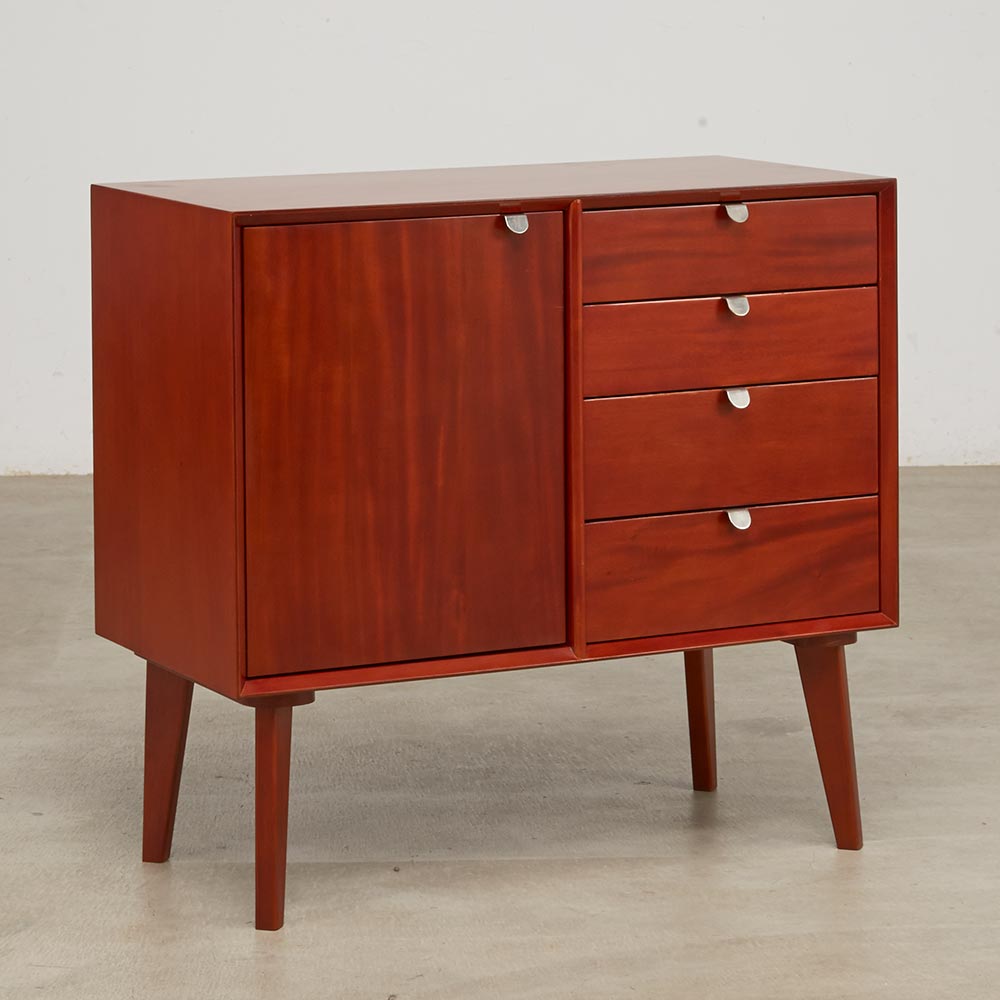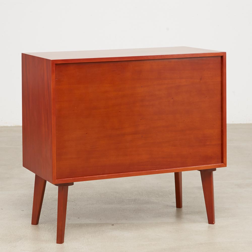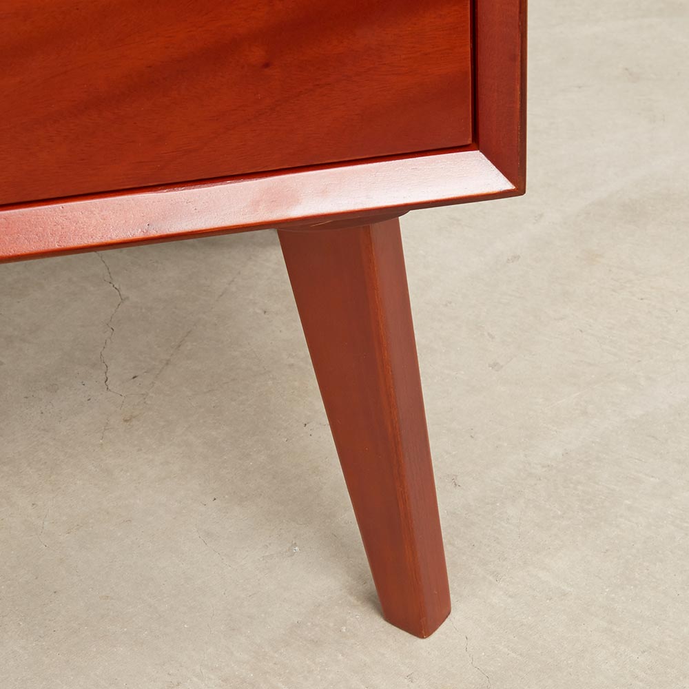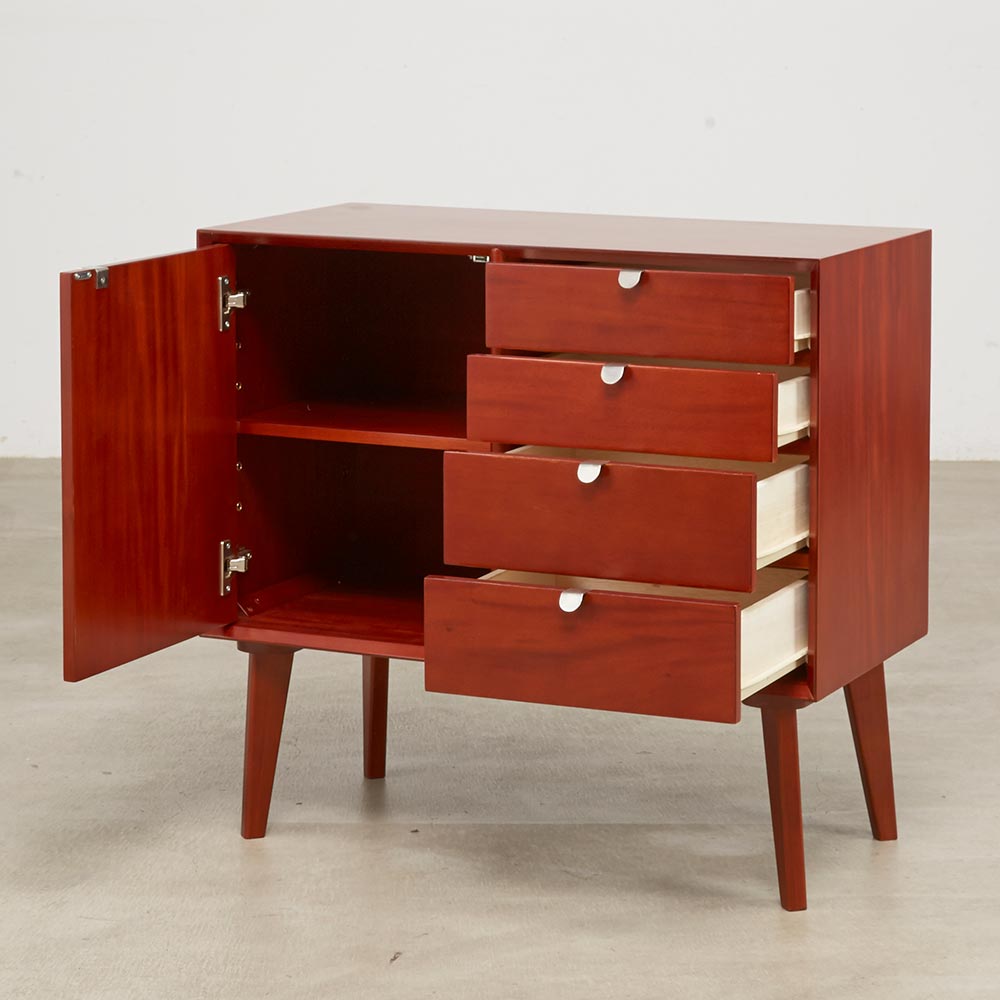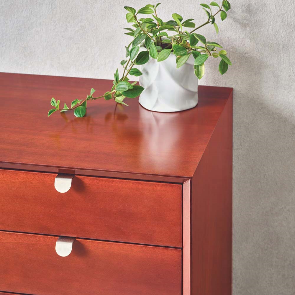 北欧ヴィンテージデザインをリアルに再現したおしゃれなリビング収納シリーズ。1950年代頃のデンマークによく見られる、長い脚のついた家具のスタイルをリアルに再現しました。表情豊かなマホガニーの木目を生かした仕上げ。たっぷりした収納力で、リビングキャビネット、サイドボードとして、窓下のストック収納としても使いやすい実用性も兼ね備えています。北欧ヴィンテージスタイルをリアルに再現したリビング収納シリーズ1950年代頃のデンマークによく見られる、長い脚のついた家具のスタイルをリアルに再現したシリーズ。この頃のものにみられる赤みのある色合いも丁寧に表現しました。角の仕上げから、真鍮の取っ手まで、本物のビンテージのようなインテリア空間を気軽にお楽しみいただけます。マホガニーの木目が美しいたっぷり収納のリビングキャビネット■前面・天板・サイドにはマホガニーの突板を贅沢に使用しました。天然ならではの一つ一つ表情の違う自然な木目が魅力です。■脚部にはマホガニーの天然木を採用。本物の素材感をお楽しみいただけます。柔らかく光る取っ手は真鍮製。見た目だけでなく、つかみやすさもポイント。■シルバーに光る取っ手は真鍮を採用しました。ヴィンテージな質感を出すため、表面をマットな仕上げにし、優しい輝きを目指しました。■取っ手は手前に向かって斜めに傾斜するつまみタイプ。指でつかみやすいサイズ感と形で、日常の使いやすさにも配慮しました。ヴィンテージ感をより高める、フレームのような縁取りデザインがおしゃれなシリーズ■正面の縁にある額縁のようなあしらいがヴィンテージの雰囲気をより感じさせてくれます。■奥に向かってV字にカットし、さらに角もV字にカットする丁寧な仕上げ。■かつて手作業で行われていた繊細な細工を丁寧に再現しました。奥行浅めの薄型収納は、設置場所を選ばずリビング収納・書棚としても。■薄型収納は窓下や廊下・リビングの空きスペースなど、カウンター下以外のデッドスペースも有効活用できます。■廊下や寝室などの窓下に設置して書斎・本棚に収まりきらない雑誌収納やCD収納、DVD収納としても。■リビングの窓下などに設置すれば、FAX台や電話台、ローボードや窓下収納としても活躍。リビングに散らばりがちな小物、生活雑貨をまとめて。スライドレール付きで開閉スムーズな引き出し、整理整頓もお任せなリビングチェスト■引き出しには前段スライドレールを採用。滑らかに開閉できます。■こまごましたものを整理整頓しやすいよう、深さの違う2タイプの引き出しを4杯設けました。大きな扉には書類や小物などをしまって、雑多になりがちなリビングをすっきりと■大きな扉内部には一を調節できる棚板付き。収納場所に困るご家庭の書類やプリント類・取扱説明書などの収納に便利。■そのほか、薬箱やコピー用紙など置き場所に困るストック品をまとめるのもおすすめです。お届け後、すぐに使える半完成品■お届けの後、箱から出して脚と取っ手をつけるだけの簡単取り付け。■すぐにご使用いただけますので、整理整頓もスムーズです。