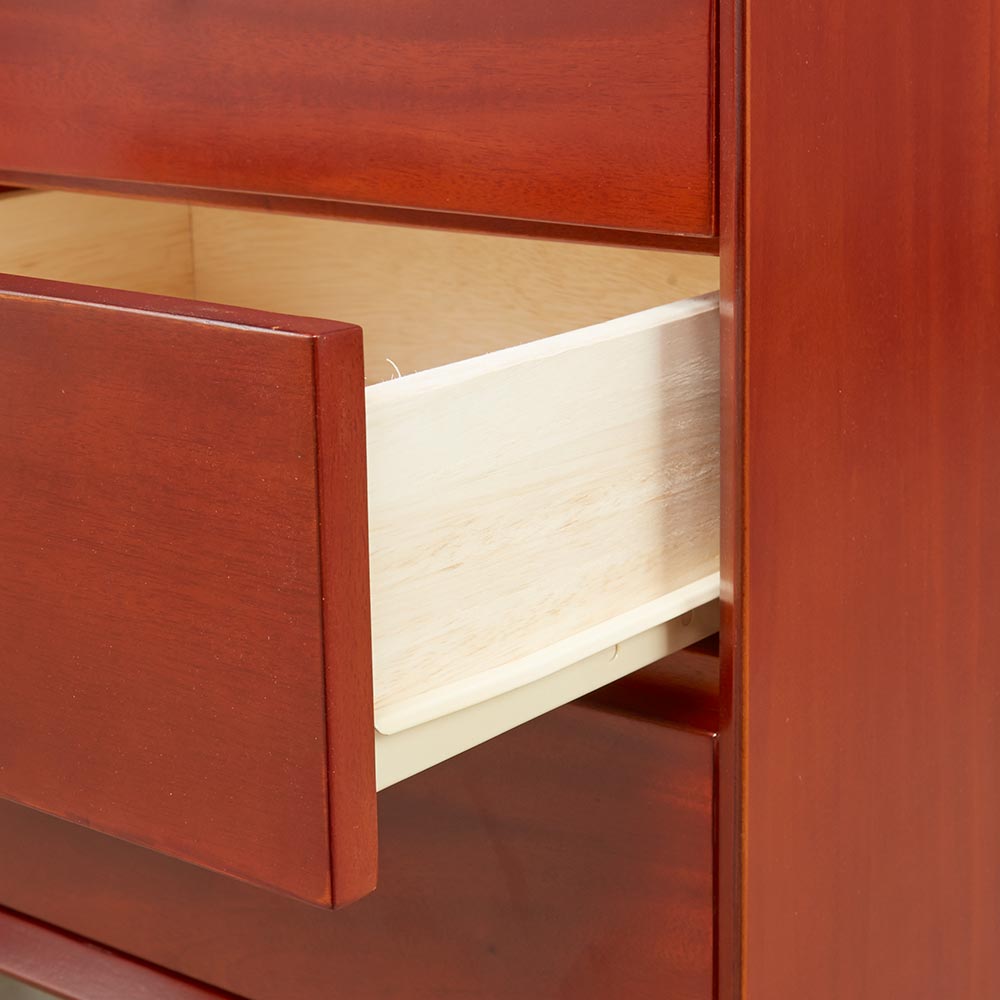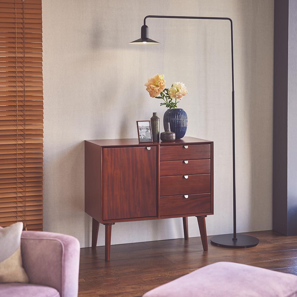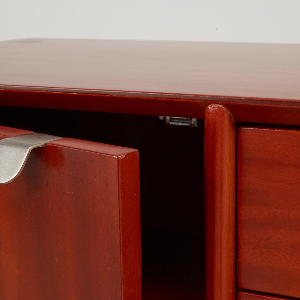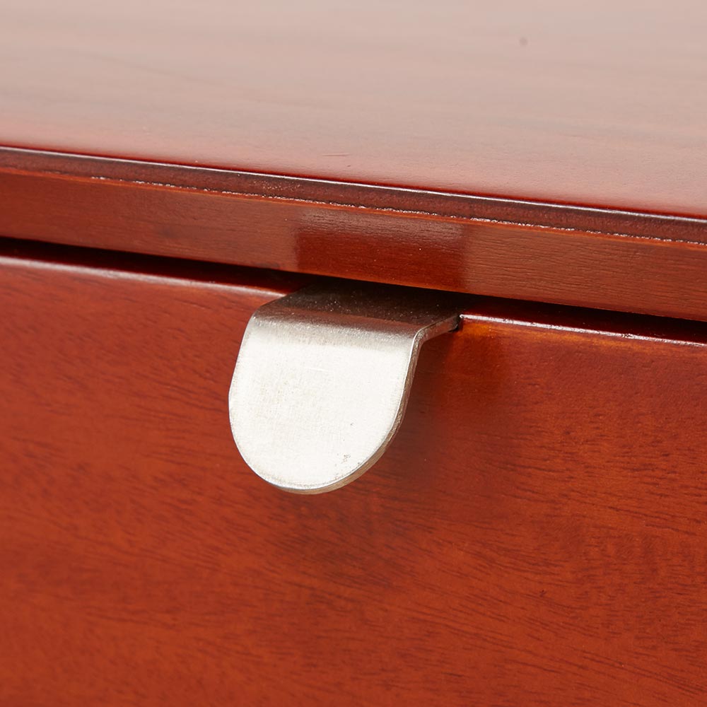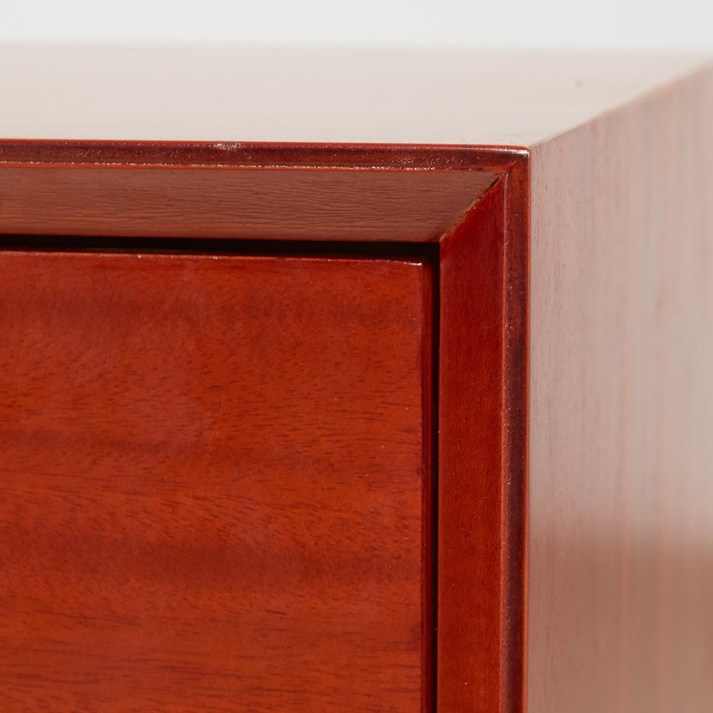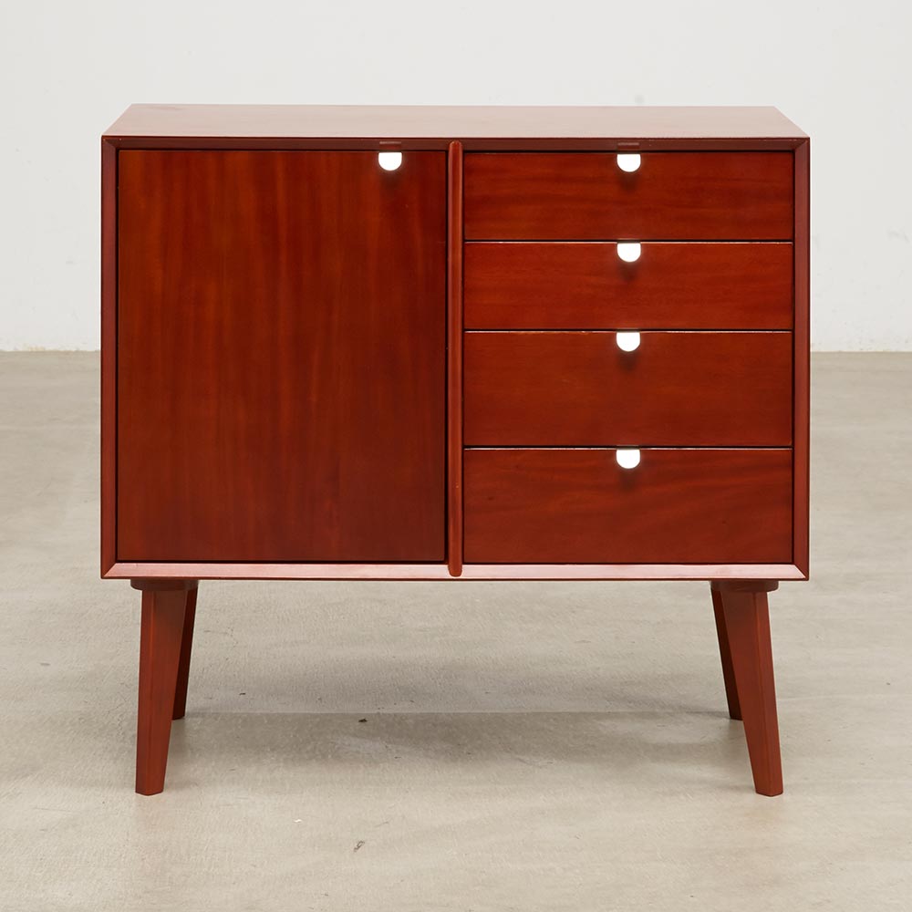 北欧ヴィンテージデザインをリアルに再現したおしゃれなリビング収納シリーズ。1950年代頃のデンマークによく見られる、長い脚のついた家具のスタイルをリアルに再現しました。表情豊かなマホガニーの木目を生かした仕上げ。たっぷりした収納力で、リビングキャビネット、サイドボードとして、窓下のストック収納としても使いやすい実用性も兼ね備えています。北欧ヴィンテージスタイルをリアルに再現したリビング収納シリーズ1950年代頃のデンマークによく見られる、長い脚のついた家具のスタイルをリアルに再現したシリーズ。この頃のものにみられる赤みのある色合いも丁寧に表現しました。角の仕上げから、真鍮の取っ手まで、本物のビンテージのようなインテリア空間を気軽にお楽しみいただけます。マホガニーの木目が美しいたっぷり収納のリビングキャビネット■前面・天板・サイドにはマホガニーの突板を贅沢に使用しました。天然ならではの一つ一つ表情の違う自然な木目が魅力です。■脚部にはマホガニーの天然木を採用。本物の素材感をお楽しみいただけます。柔らかく光る取っ手は真鍮製。見た目だけでなく、つかみやすさもポイント。■シルバーに光る取っ手は真鍮を採用しました。ヴィンテージな質感を出すため、表面をマットな仕上げにし、優しい輝きを目指しました。■取っ手は手前に向かって斜めに傾斜するつまみタイプ。指でつかみやすいサイズ感と形で、日常の使いやすさにも配慮しました。ヴィンテージ感をより高める、フレームのような縁取りデザインがおしゃれなシリーズ■正面の縁にある額縁のようなあしらいがヴィンテージの雰囲気をより感じさせてくれます。■奥に向かってV字にカットし、さらに角もV字にカットする丁寧な仕上げ。■かつて手作業で行われていた繊細な細工を丁寧に再現しました。奥行浅めの薄型収納は、設置場所を選ばずリビング収納・書棚としても。■薄型収納は窓下や廊下・リビングの空きスペースなど、カウンター下以外のデッドスペースも有効活用できます。■廊下や寝室などの窓下に設置して書斎・本棚に収まりきらない雑誌収納やCD収納、DVD収納としても。■リビングの窓下などに設置すれば、FAX台や電話台、ローボードや窓下収納としても活躍。リビングに散らばりがちな小物、生活雑貨をまとめて。スライドレール付きで開閉スムーズな引き出し、整理整頓もお任せなリビングチェスト■引き出しには前段スライドレールを採用。滑らかに開閉できます。■こまごましたものを整理整頓しやすいよう、深さの違う2タイプの引き出しを4杯設けました。大きな扉には書類や小物などをしまって、雑多になりがちなリビングをすっきりと■大きな扉内部には一を調節できる棚板付き。収納場所に困るご家庭の書類やプリント類・取扱説明書などの収納に便利。■そのほか、薬箱やコピー用紙など置き場所に困るストック品をまとめるのもおすすめです。お届け後、すぐに使える半完成品■お届けの後、箱から出して脚と取っ手をつけるだけの簡単取り付け。■すぐにご使用いただけますので、整理整頓もスムーズです。