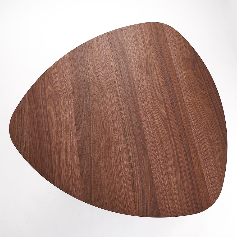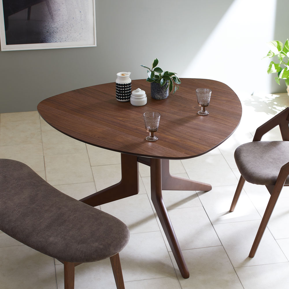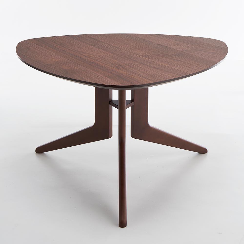 空間を無駄なく使える丸みのある三角形のダイニングテーブル。一人のスペースを広く、またはみんなでワイワイと。ホームワークやコミュニケーションをゆったり楽しむためのダイニングテーブルです。三角形だから会話が弾む。変形ダイニングテーブルギターのピックをモチーフにした三角形。それぞれの辺に椅子を1脚2脚、またはベンチを設置して、人数の制限なく効率良く使う事ができるすぐれもののダイニングテーブルです。ウォルナットの高級感を感じられるこだわりのテーブル天板にはウォルナットの突板を使用。天然木の風合いを損なわないように、丁寧に加工されています。塗料にセラミックの粉末を混ぜ、表面硬度を強化したセラウッド塗装で、木の質感を大切にしながら、丈夫で長く使える仕上げを施しました。安心の国産管理の行き届いた国内の老舗の工場で、一点一点丁寧に生産しています。