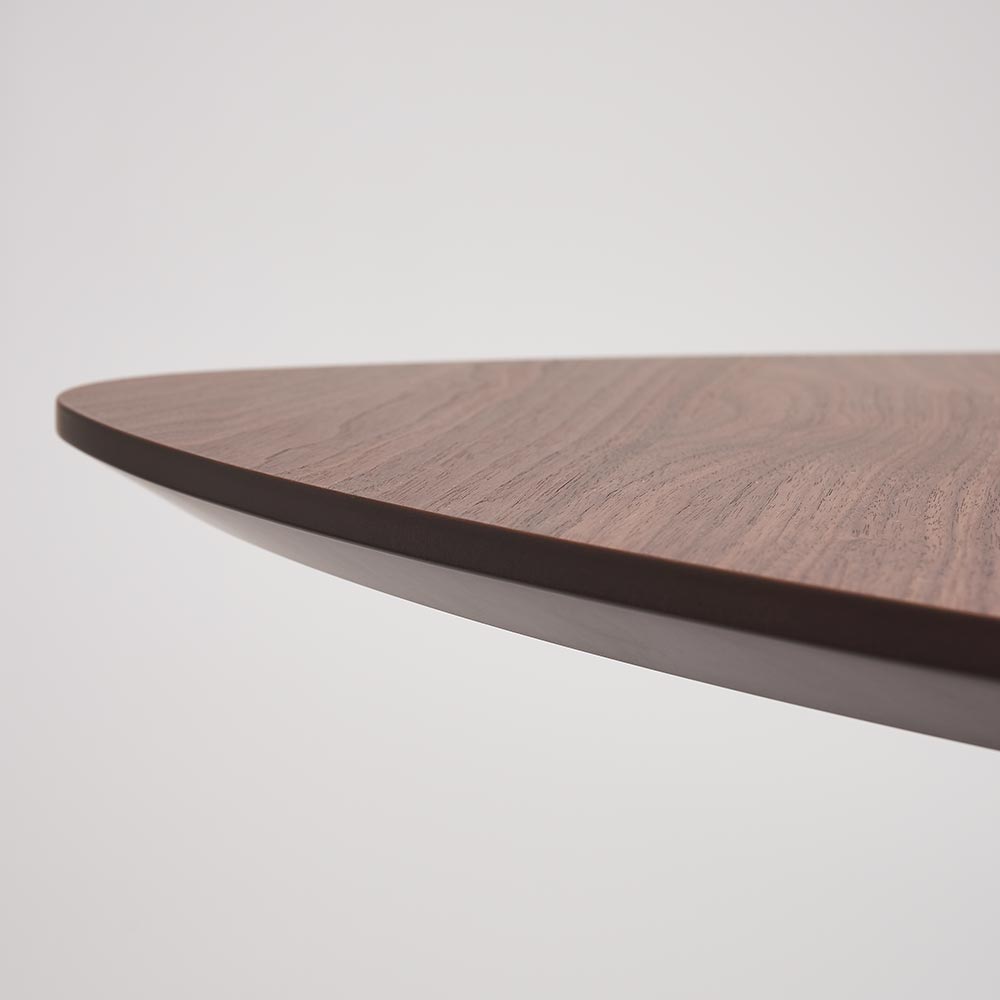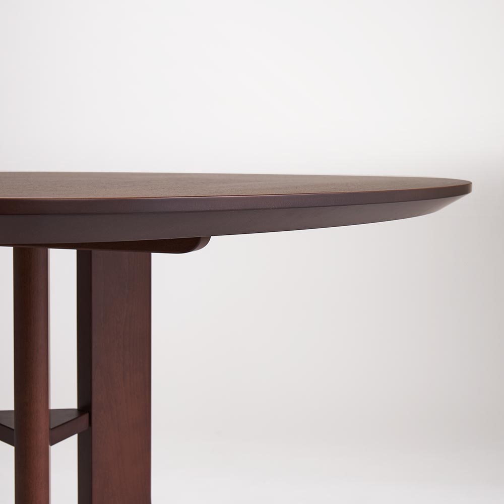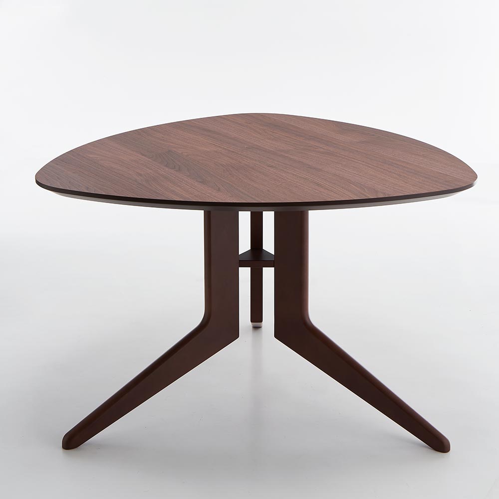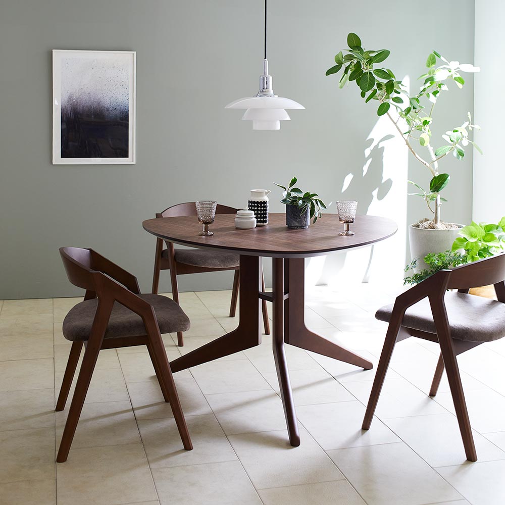 空間を無駄なく使える丸みのある三角形のダイニングテーブル。一人のスペースを広く、またはみんなでワイワイと。ホームワークやコミュニケーションをゆったり楽しむためのダイニングテーブルです。三角形だから会話が弾む。変形ダイニングテーブルギターのピックをモチーフにした三角形。それぞれの辺に椅子を1脚2脚、またはベンチを設置して、人数の制限なく効率良く使う事ができるすぐれもののダイニングテーブルです。ウォルナットの高級感を感じられるこだわりのテーブル天板にはウォルナットの突板を使用。天然木の風合いを損なわないように、丁寧に加工されています。塗料にセラミックの粉末を混ぜ、表面硬度を強化したセラウッド塗装で、木の質感を大切にしながら、丈夫で長く使える仕上げを施しました。安心の国産管理の行き届いた国内の老舗の工場で、一点一点丁寧に生産しています。