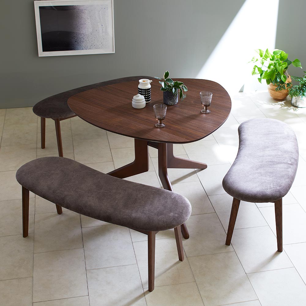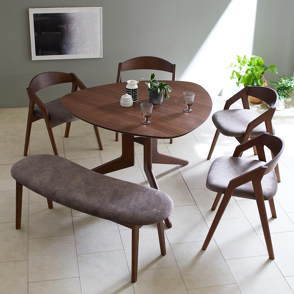 チェア×4脚、ベンチ×1脚とのコーディネート例。6人で使うことも想定した三角形のテーブルです。