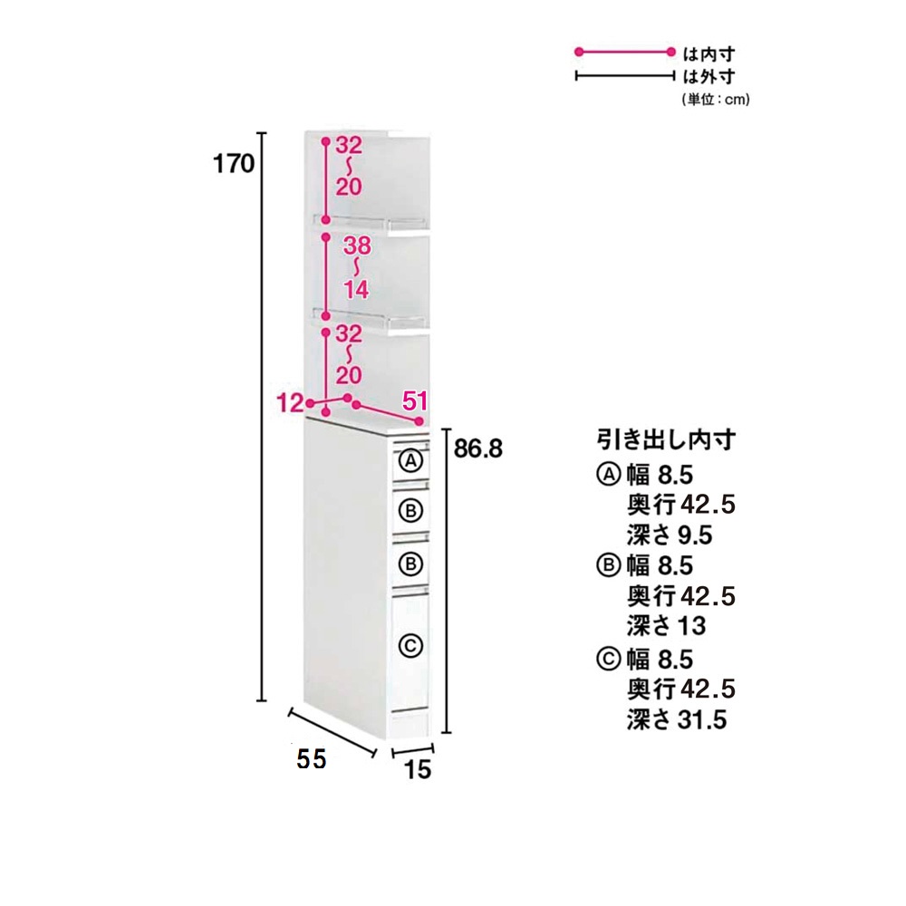 中身が見渡せて取り出しやすいオープンタイプの隙間収納。わずか幅12cm〜30cmのすき間に収納できるキッチン収納家具。上段は前からも横からもサッと取り出せる2面オープン棚で、収納棚板は3cmピッチで高さ調整が可能、引出しにはボトルも入る機能満載の隙間家具です。良く使う物を取りやすい場所に。動線がスムーズになる便利なキッチン収納庫◆たった12cmからの隙間がキッチンストッカーに変身します。◆サイドオープン部には調味料や使う事の多いキッチンツールを取り出しやすく。◆スパイスラック、調味料ラックとしてもご使用頂けます。◆棚板は3cmピッチ5段階でそれぞれ調節可能。落下防止のこぼれ止めバー付きです。◆オープン棚の向きは組立時に左右どちら向きにも設定可能です。◆前面は光沢感があり、汚れにくく、お手入れし易い素材で作りました。(ポリエステル化粧合板)◆側面も化粧仕上げだからお掃除もラクラクで清潔感をキープできます。◆たった12cmの隙間から、大量収納スペースにしてしまうアイデア満載のすきま収納です。◆収納棚板の高さはお好みに合わせて調整できるので収納物に合わせて調整可能です。◆小物類の収納に便利な引き出しが4杯付。再下段はボトルも入る高さ設定です。◆洗面所の隙間収納としてもお使い頂けます。隙間家具でも妥協したくないあなたに高機能を◆選べる幅と奥行きのサイズ展開であなたのキッチンにピッタリなサイズをお選び下さい。◆棚板には収納物が落ちないように落下防止バーが付いています。(最下段は除きます)◆もちろんオープン部の向きは左右どちらでも設定可能で置く場所を選びません。◆上下連結式なので棚と引き出しを左右に並べてキッチンカウンターとしてもお使い頂けます。◆清潔感のあるホワイトでおしゃれなシンプルモダンキッチンを演出します。◆洗面所の隙間収納としてもお使い頂けます。信頼と安心の国内工場での生産品です◆国内の職人がひとつずつ丁寧に仕上げた逸品です。◆細部の丁寧な仕上がりなど、国産品ならではの高品質をお楽しみください。◆キッチンのすきまを無駄なく使いたいあなたにお勧めのキッチン収納ラックです。新築やリフォーム、模様替えの時にもおすすめの逸品◆お引越しや模様替えのタイミングでスペースを便利に有効活用してみませんか?◆高価な備え付け家具やリフォームよりも、リーズナブルに新生活を始められます。◆是非普段使うものこそ、大好きなものをじっくりとご検討下さい。
